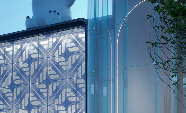 玄关处的几何条索折板和丝带造型的结合装置,灵感来自于三宅一生发布的最新面料设计,未来、朋克中带着浓烈的东方和希望感。