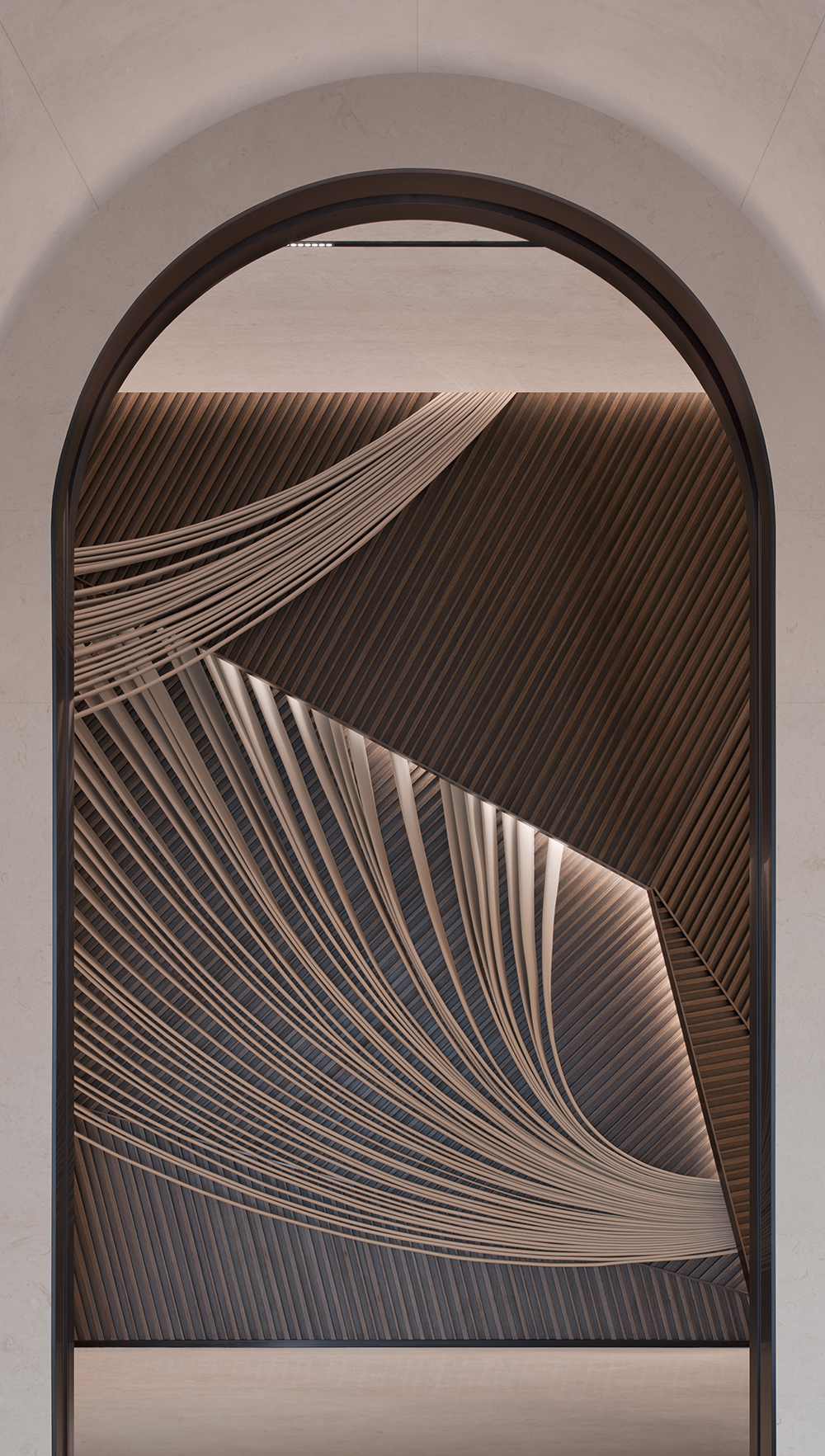 访庄 我希望电梯门一打开,就进入了一个仿佛只有在优雅的古典世界中才会出现的超然。 所谓入画境,像极文人画中老丈骑驴渡桥访庄,进入画中的反向现实就是凡俗的喧嚣,翻译成现代汉语就是欢迎来到新世界。 所以整个电梯空间仿佛柔软、抽象的双手抱护,隐喻朋友心中构建的自我宇宙,红色湖石代表内心中的锦绣与窗外现实中的山水形成对映。 玄关处的几何条索折板和丝带造型的结合装置,灵感来自于三宅一生发布的最新面料设计,未来、朋克中带着浓烈的东方和希望感。