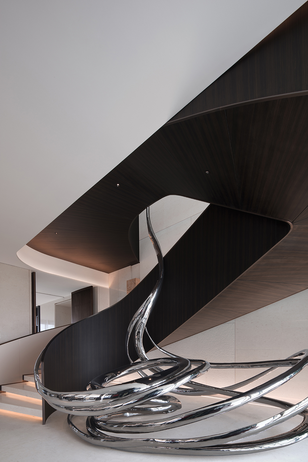 餐厅和楼梯之间用转轴网眼铜屏风间隔,开合之间,气象森然。大型雕塑与楼梯融为一体,名扶摇,取意李白唐诗-大鹏一日同风起,扶摇直上九万里。我问朋友,消隐于市是一和恒持的心境,待机扶摇也是吧?朋友笑而不语。