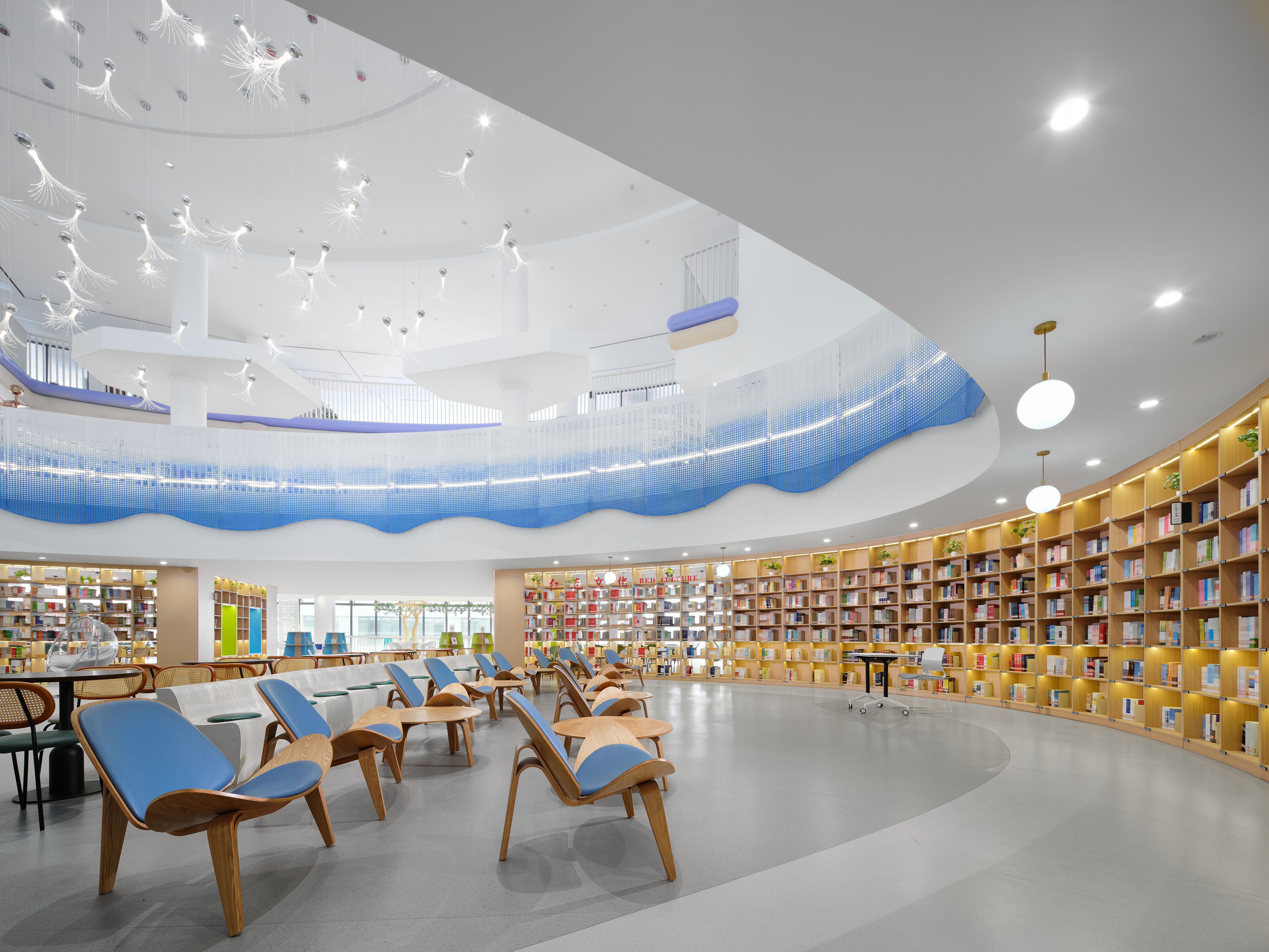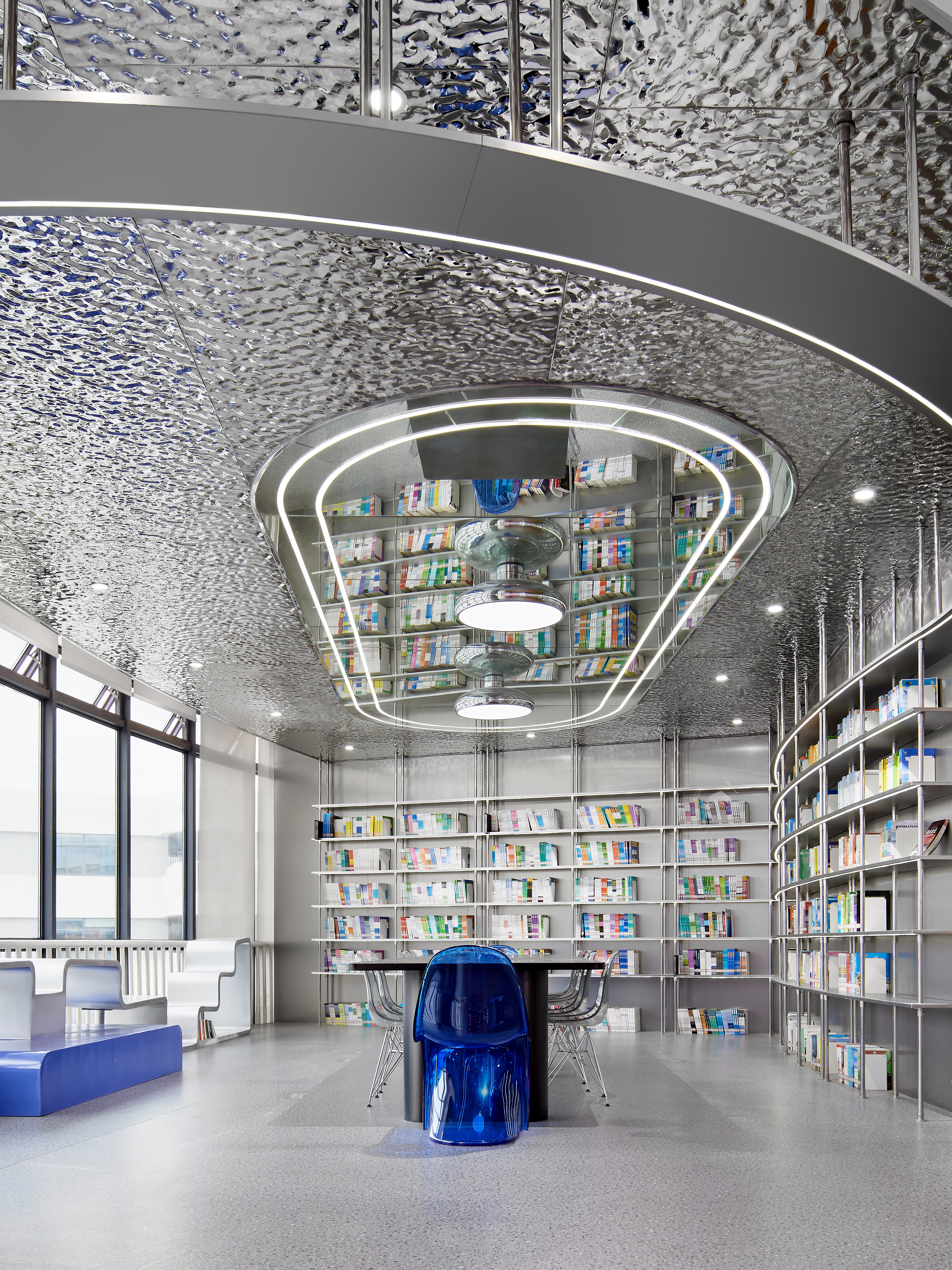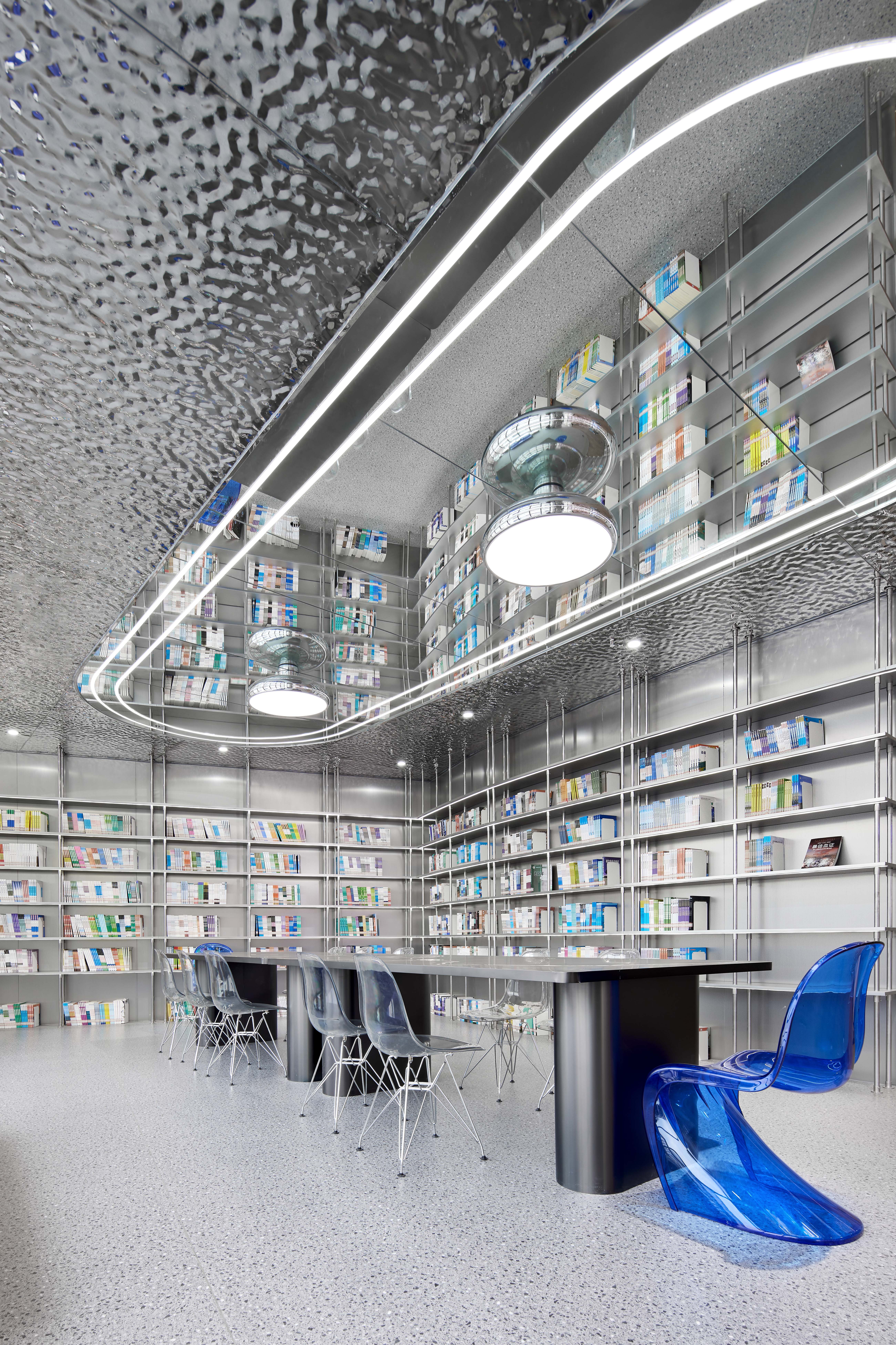 科普馆以种子般的弧形轮廓从服务台旁延展开来,内部采用开敞明朗的设计风格,以梦幻蓝为主色调,将富有光泽的材质用料与具有设计感的光带相互碰撞,既时尚又新颖;高效利用空间,沿墙留出简洁的置书架,以放置大量学生喜爱的科普类书籍。同时,天花悬置有镜面大灯饰,形似不明飞行物,设计天马行空、大胆独特,彰显创新精神。