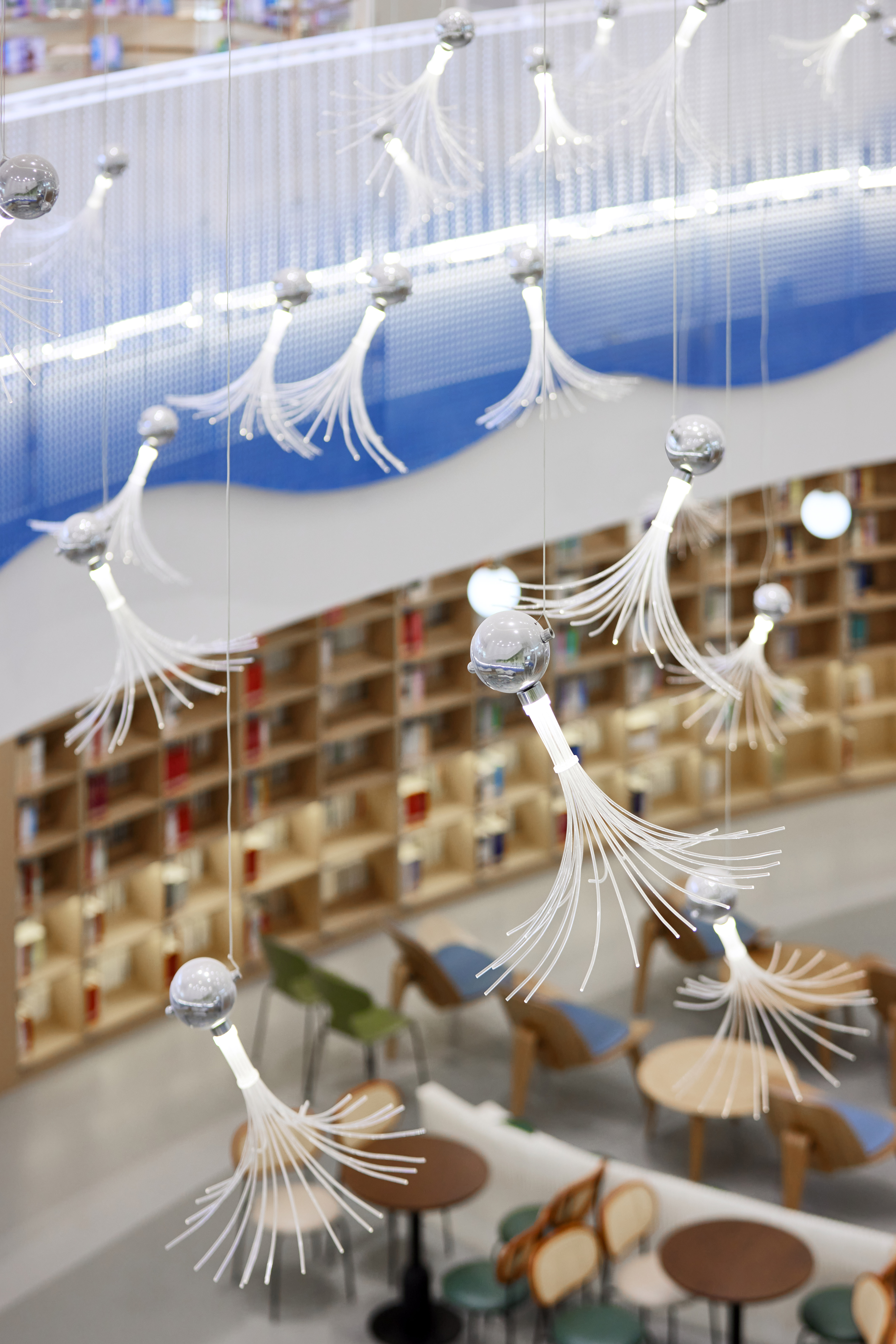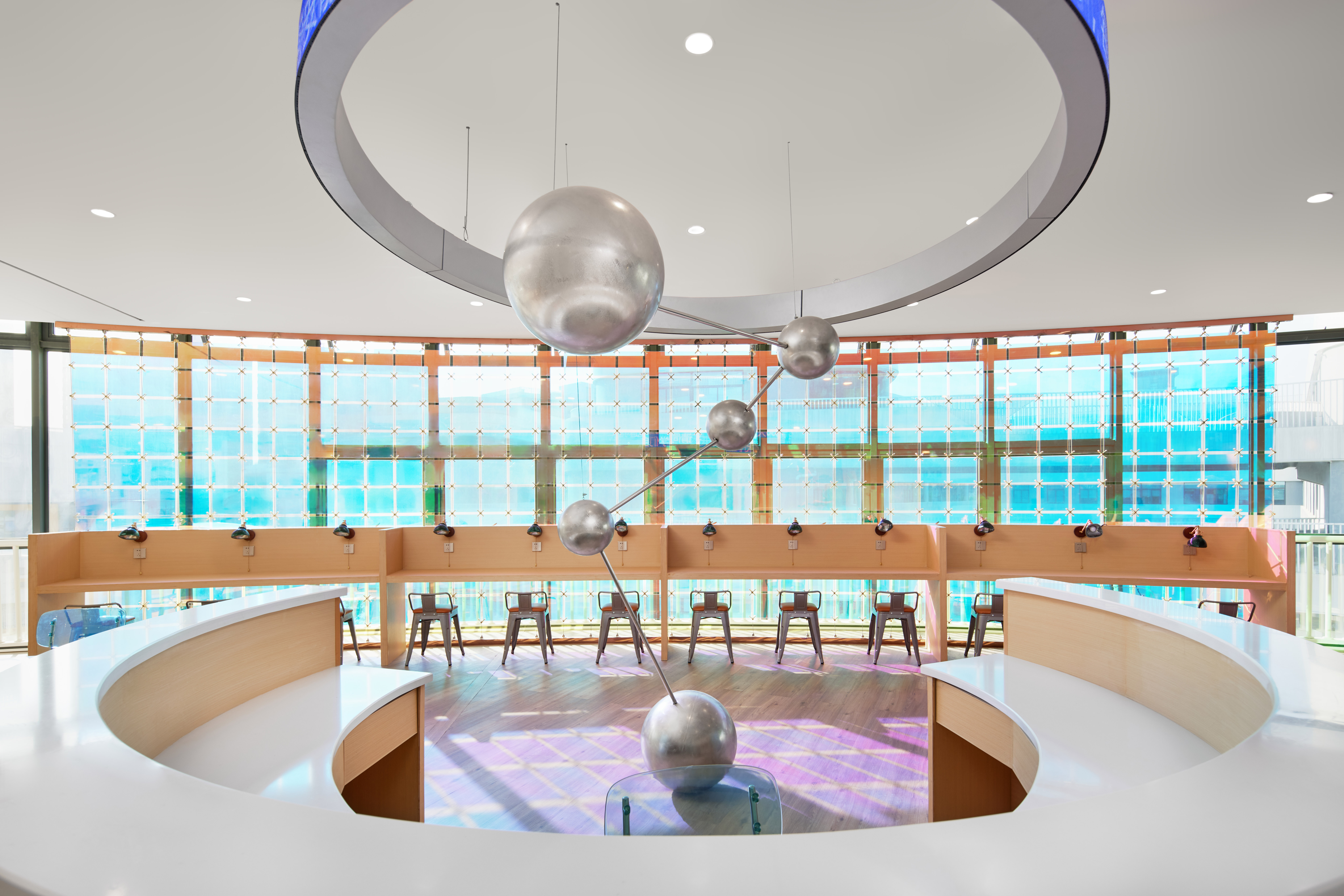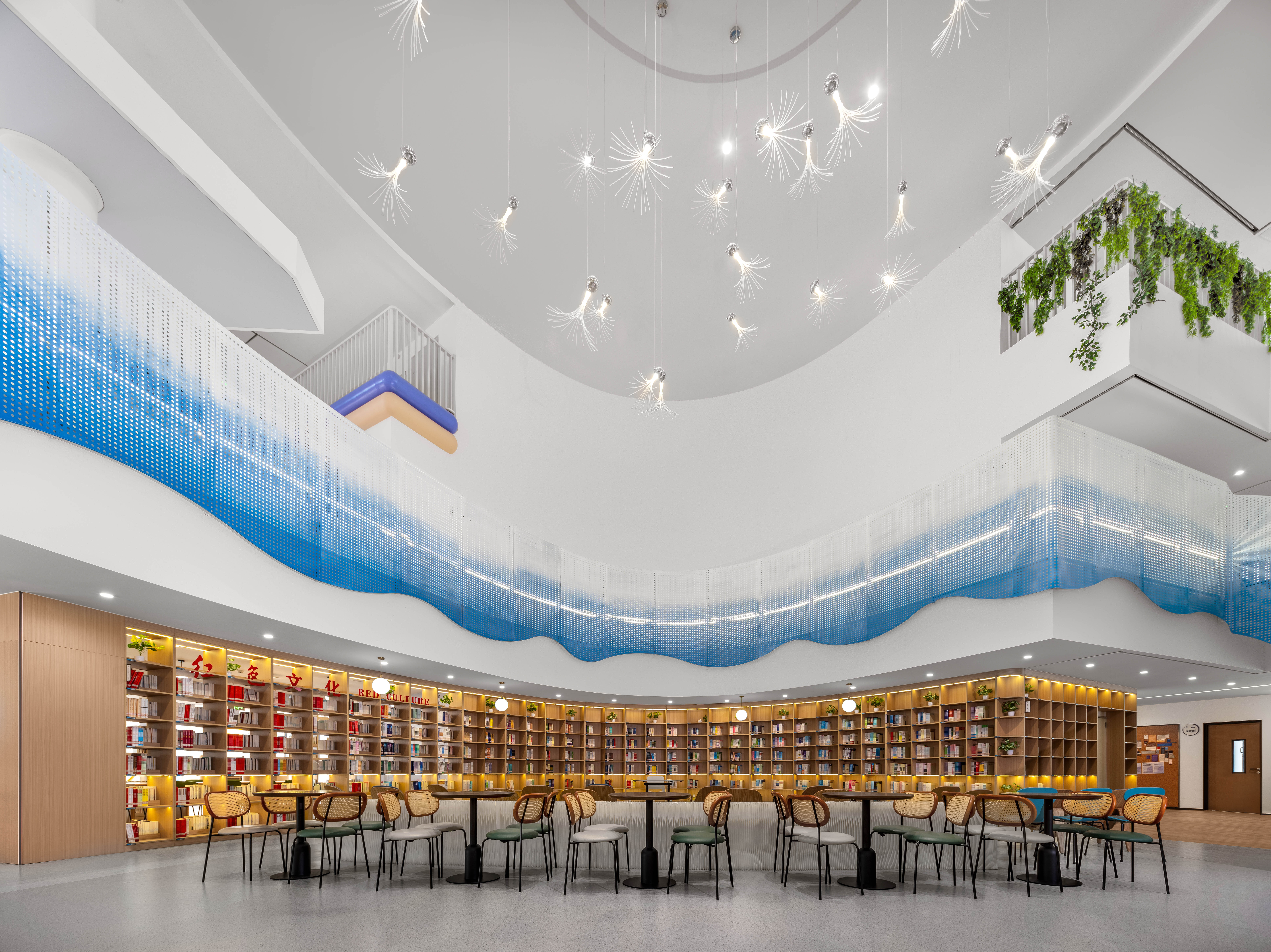 在中庭的设计,我们去掉了常规的栏杆做法,用了渐变蓝色的冲孔板艺术,形如波浪,寓意知识的海洋。中庭的顶部,吸引我们的是像蒲公英一样的吊饰,这是根据学校的办学理念,一颗未来种子,蕴藏美好成长的无限可能。蒲公英象征勇敢、自信、坚持、自由。它 “随风撒种,落地生根”我们希望这颗种子在未来学校扎根土壤,面向未来茁壮生长。