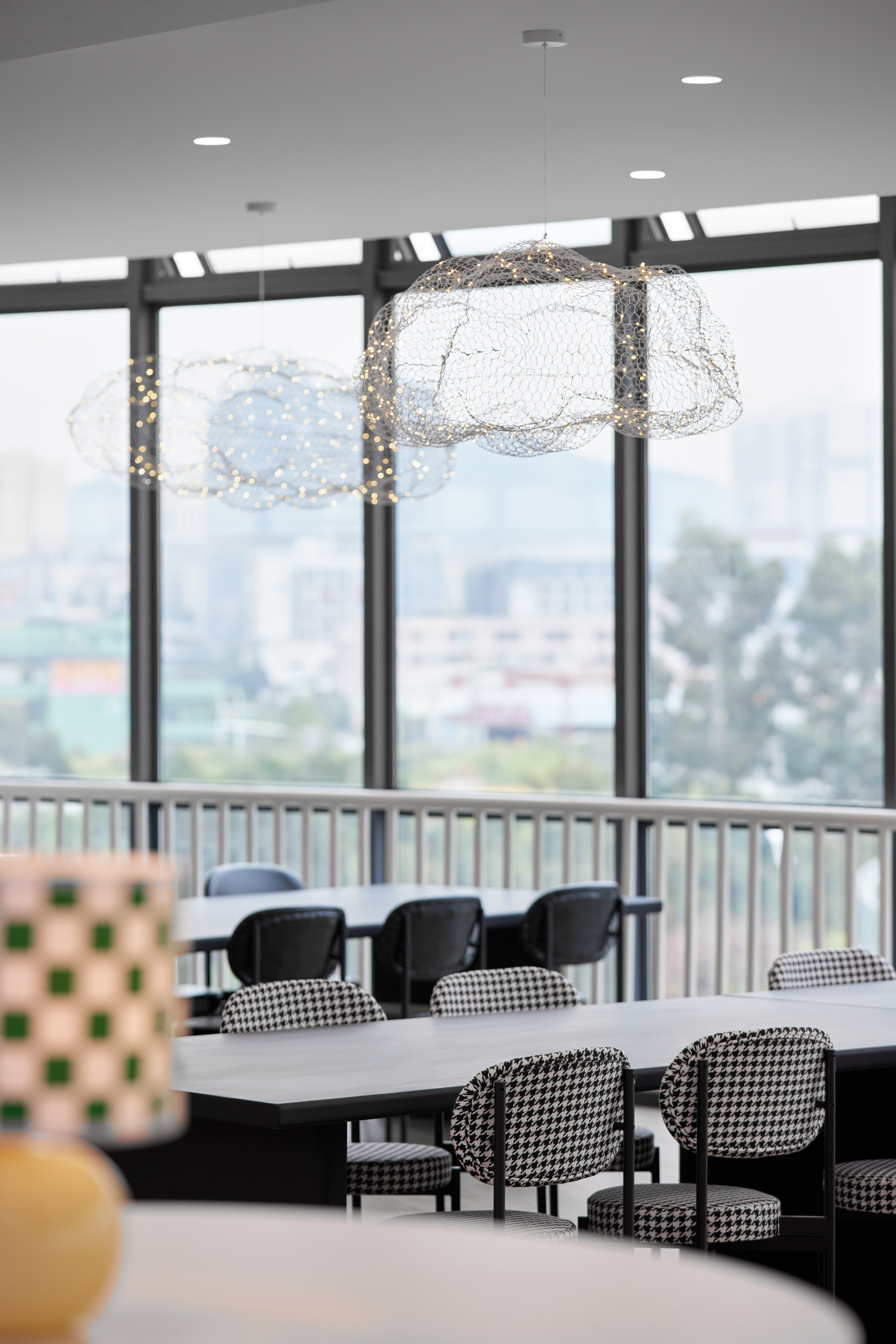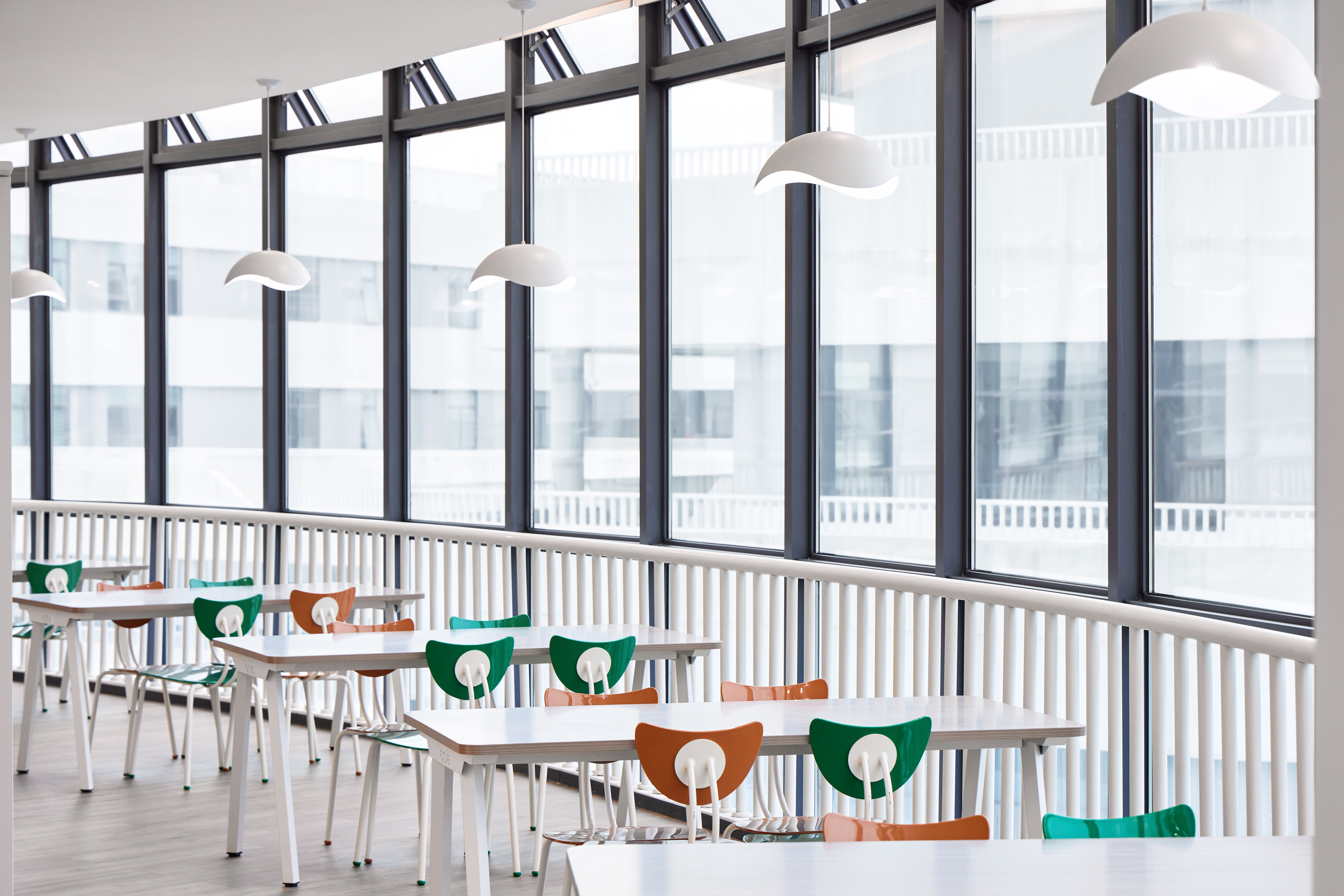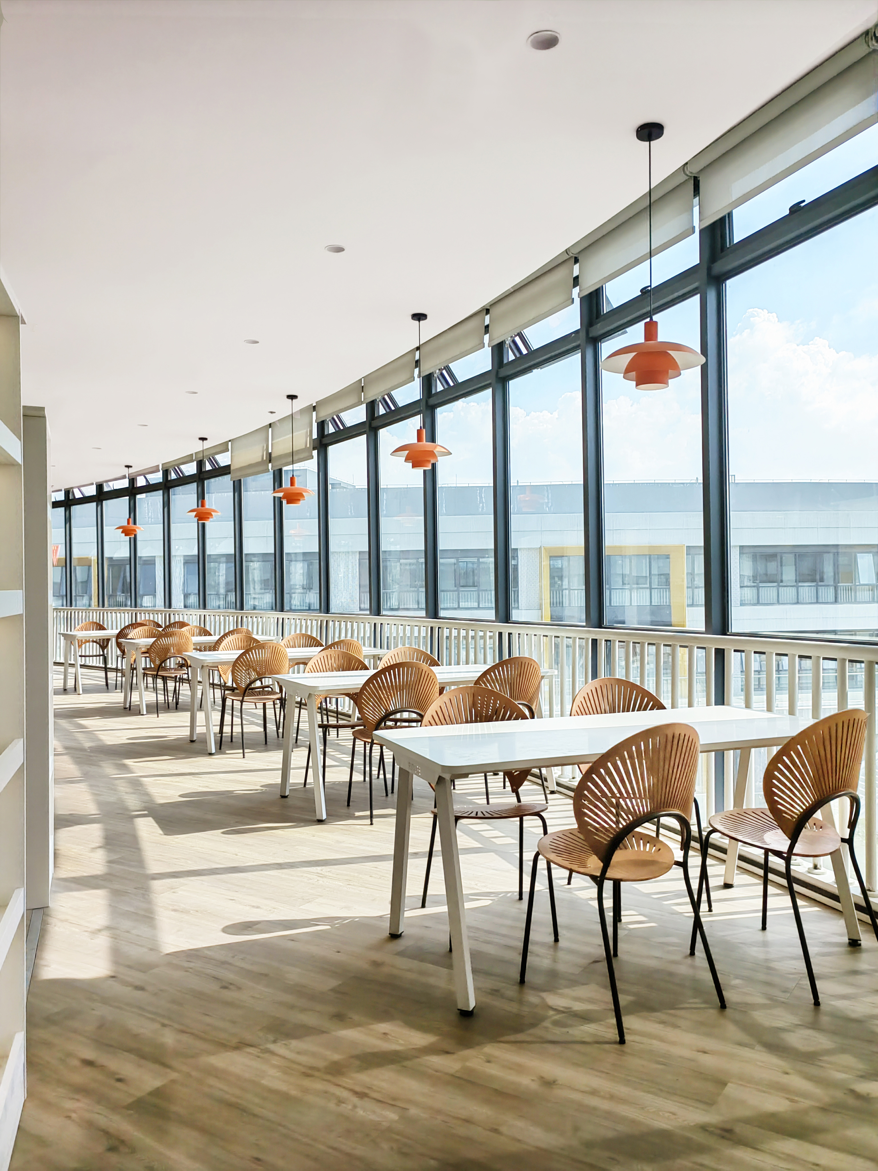 在中庭的设计,我们去掉了常规的栏杆做法,用了渐变蓝色的冲孔板艺术,形如波浪,寓意知识的海洋。中庭的顶部,吸引我们的是像蒲公英一样的吊饰,这是根据学校的办学理念,一颗未来种子,蕴藏美好成长的无限可能。蒲公英象征勇敢、自信、坚持、自由。它 “随风撒种,落地生根”我们希望这颗种子在未来学校扎根土壤,面向未来茁壮生长。