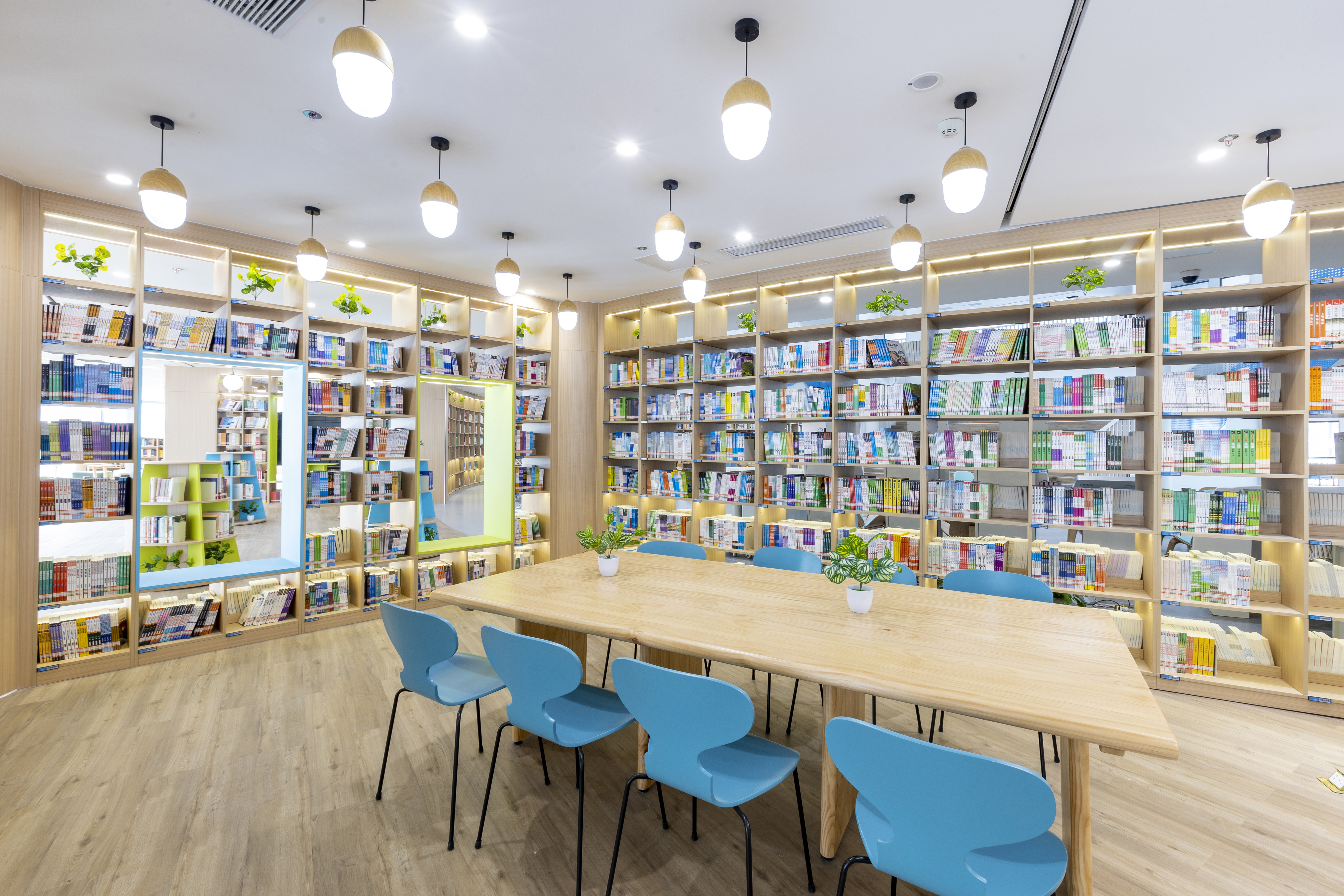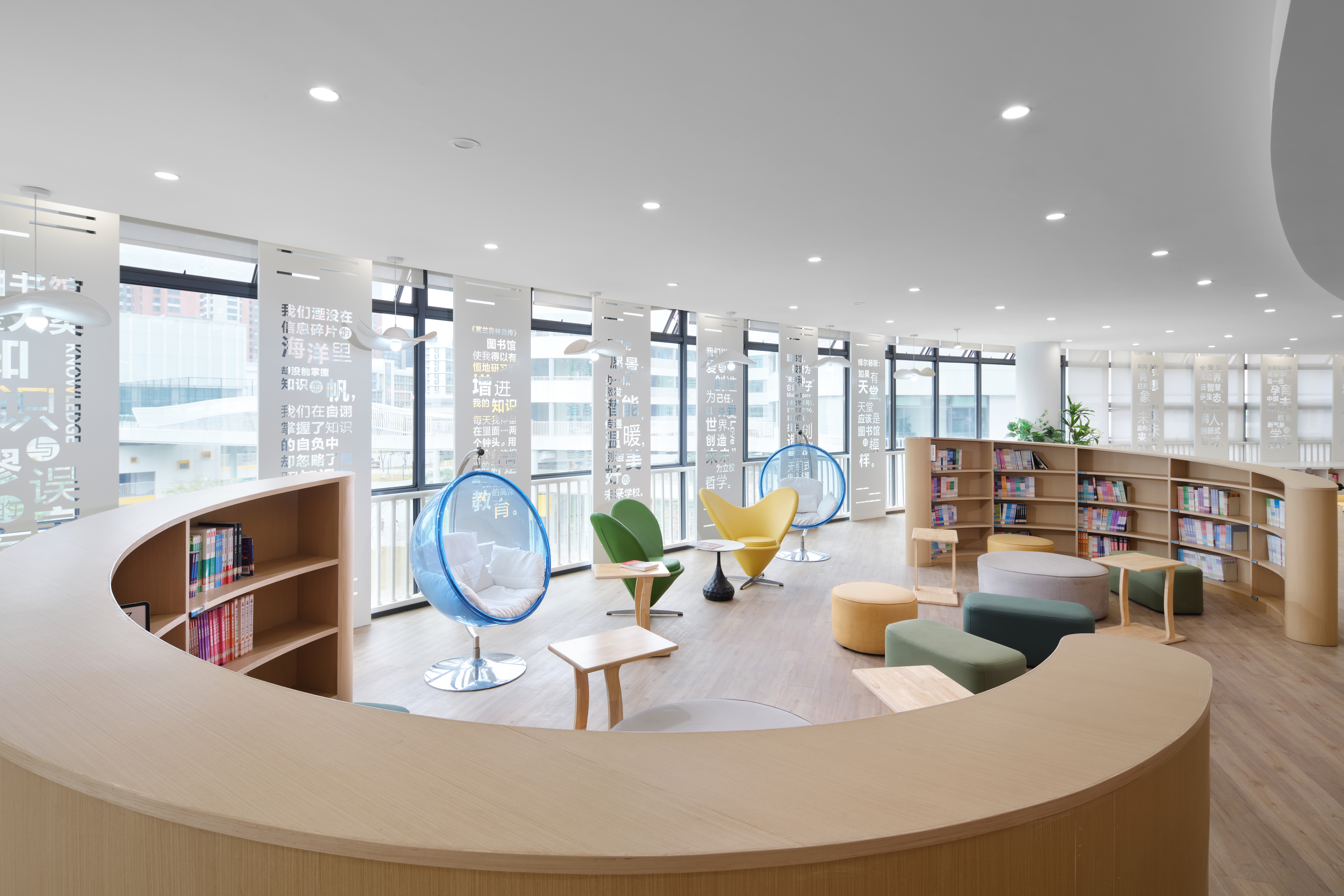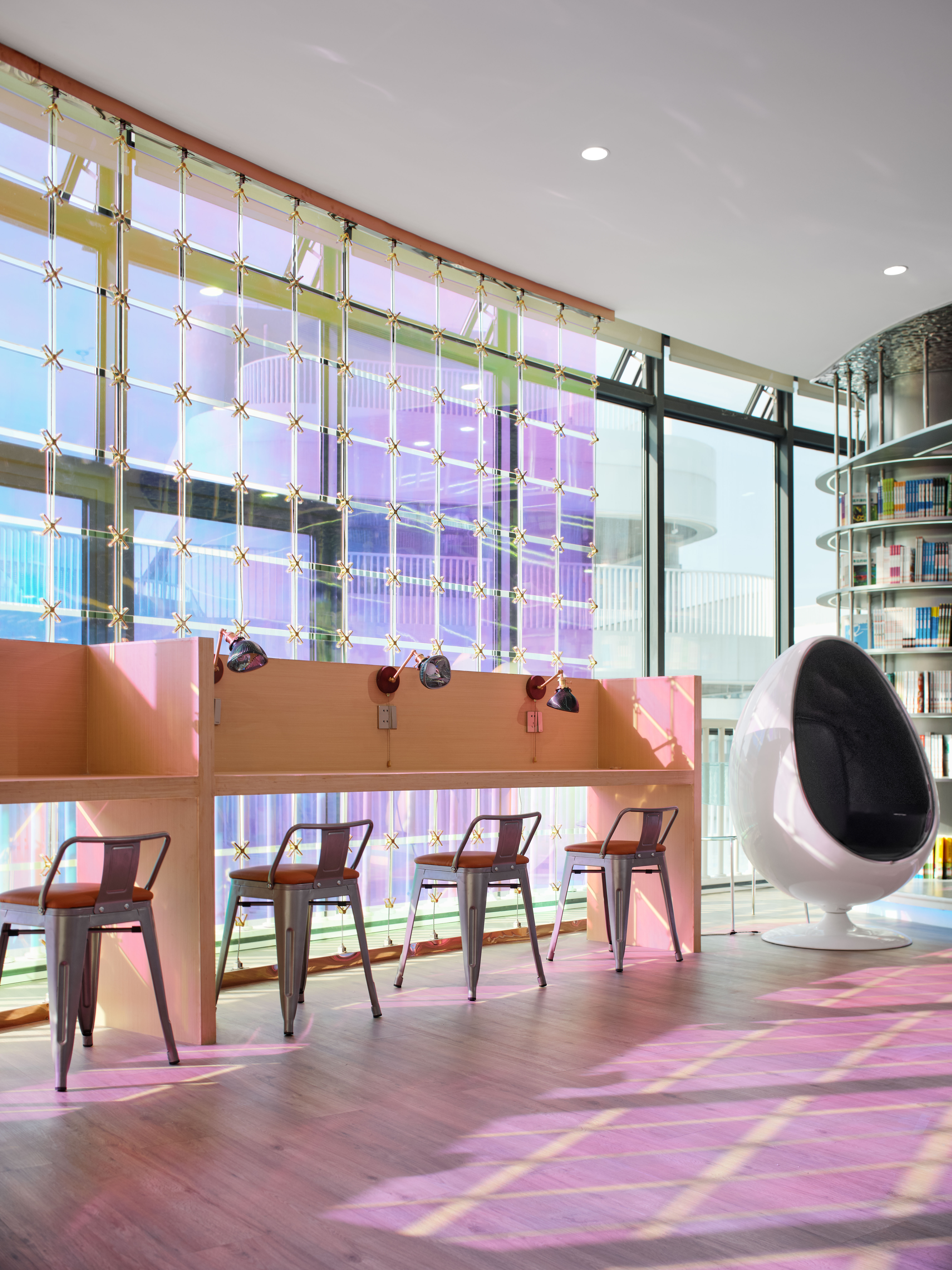 自习区我们做了几个不同感觉的位置,每个学生都能找到自己喜欢的位置来学习。