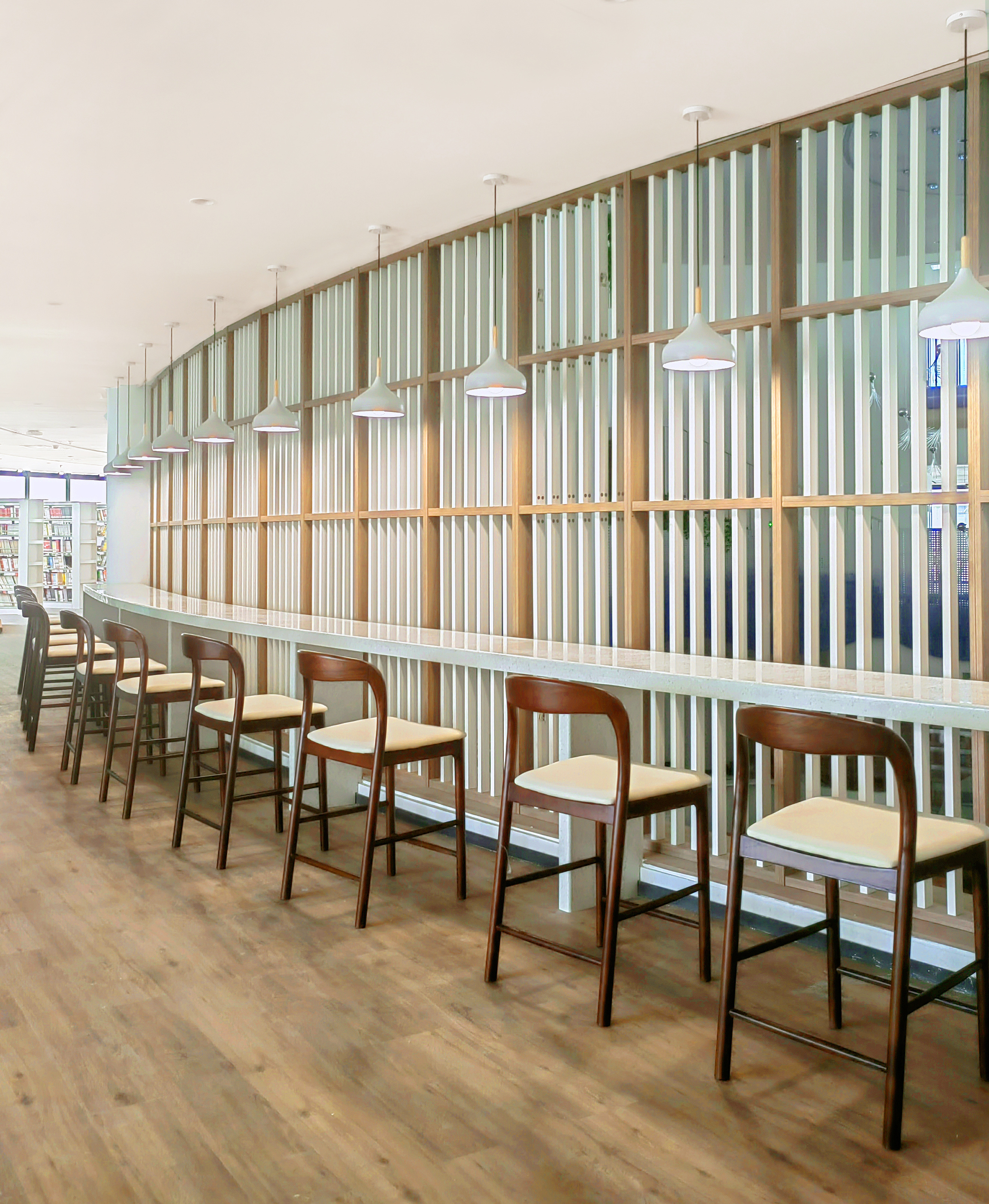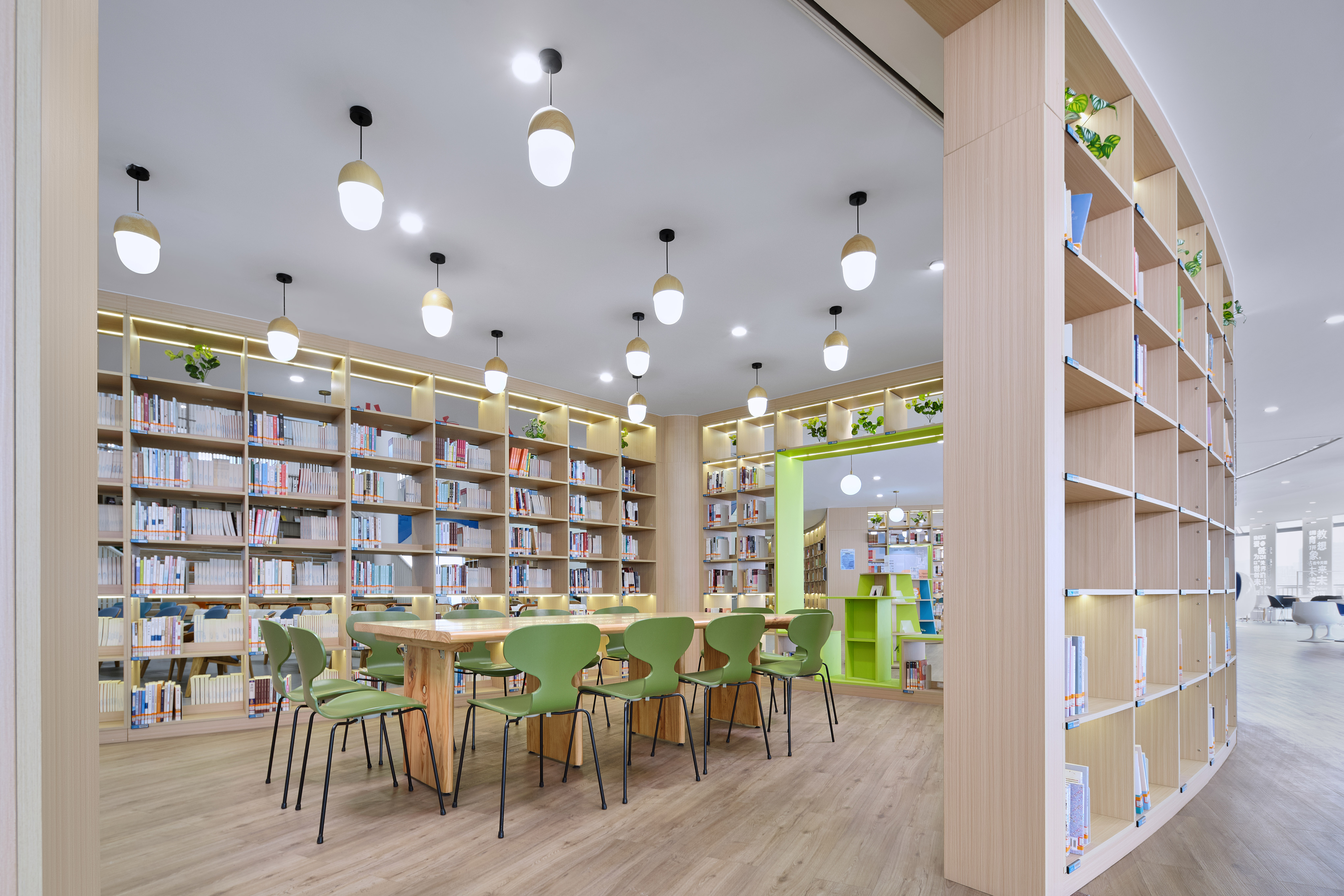 三楼电梯出来,我们以波浪形叠加书柜、流线优美,形如山丘层层递进,予以种子在肥袄的土壤生根发芽。
