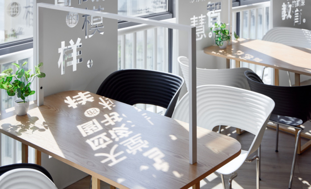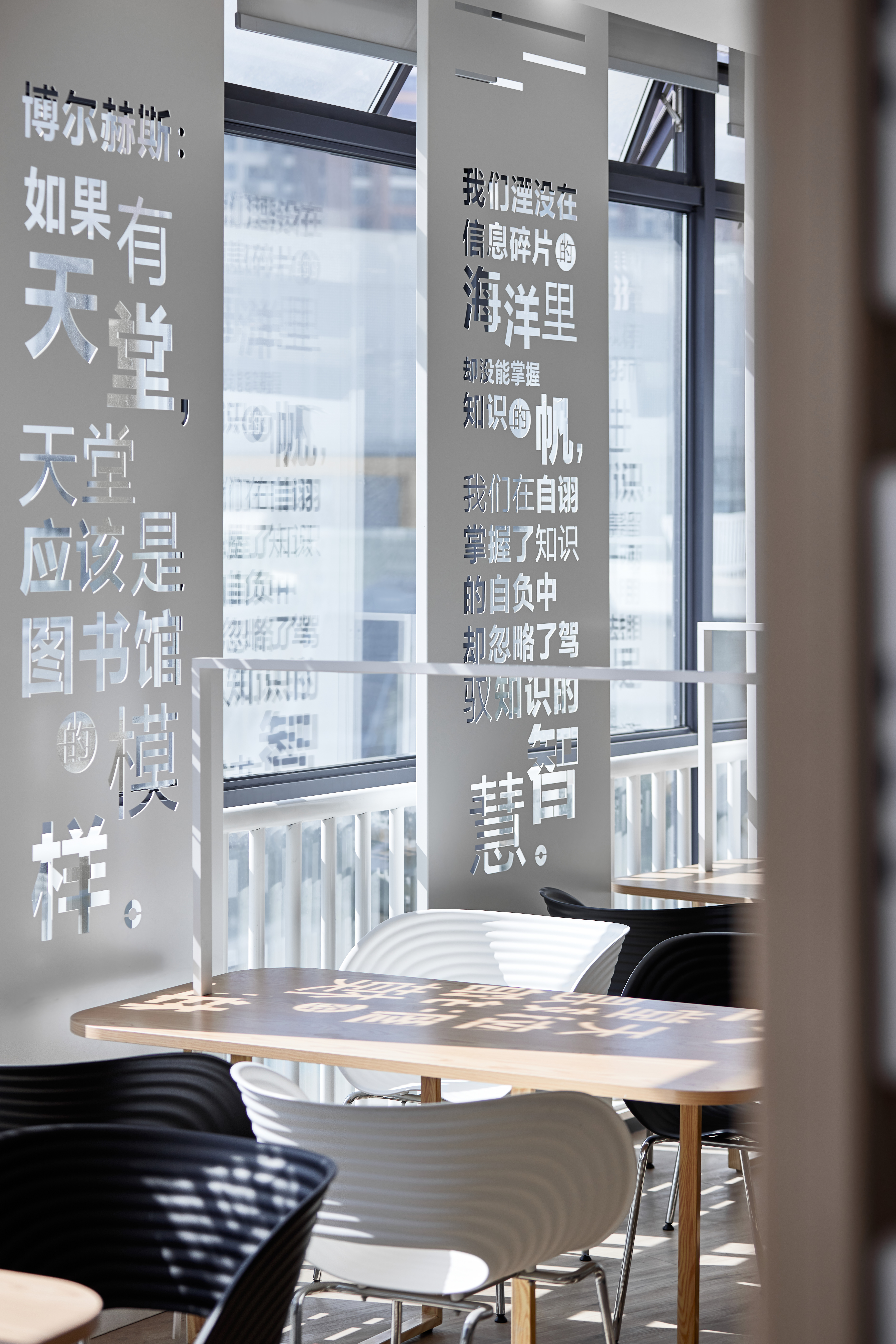 腹有诗书,心中有印,光自会循路而来。 图书馆需要有文化的沉浸才有灵魂,在落地窗的一周,我们利用了光线的折射,运用名言名句做了激光穿孔,阳光透过屏风,字体在空间中摇弋,使整个空间生动富有气息。