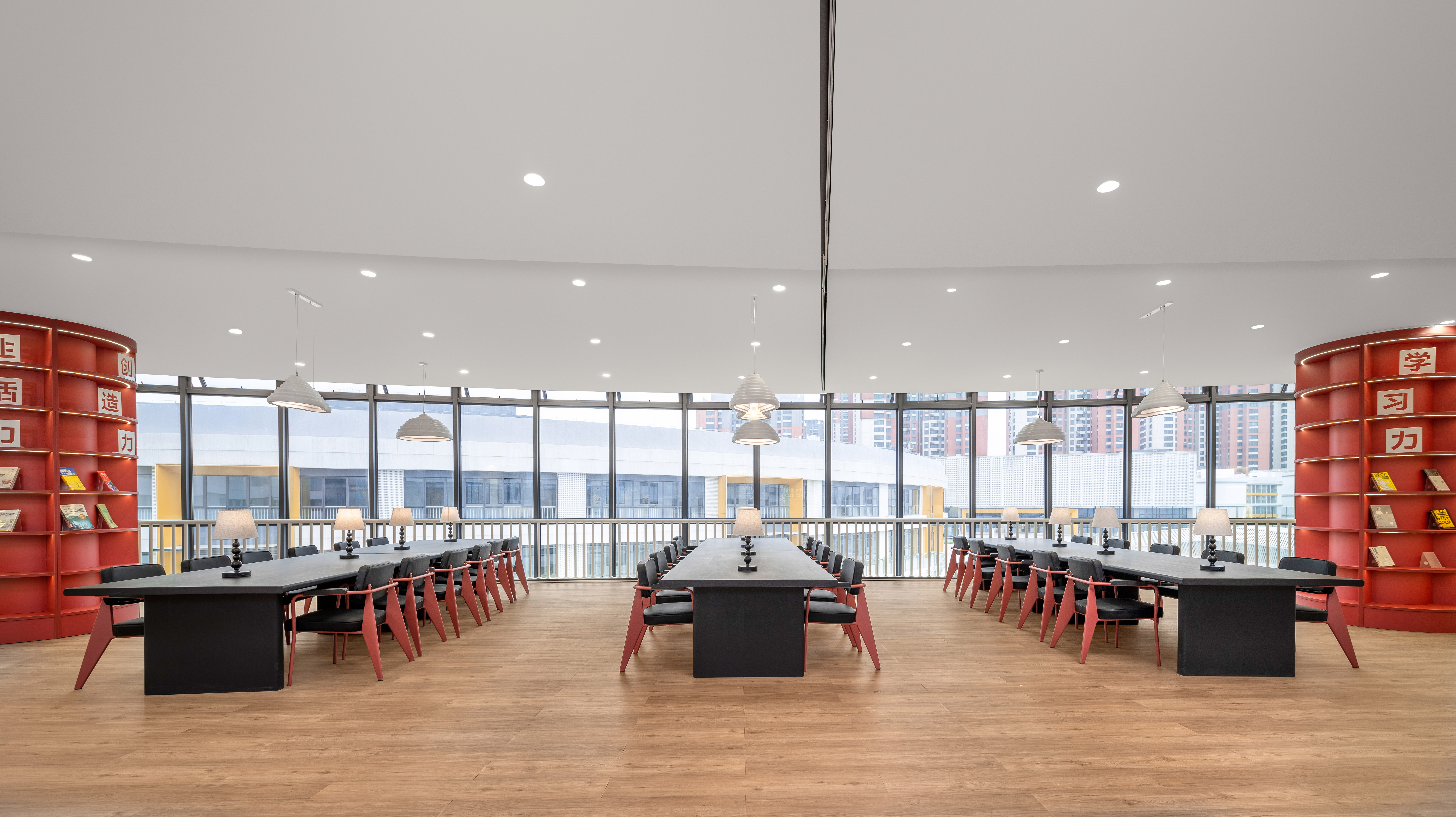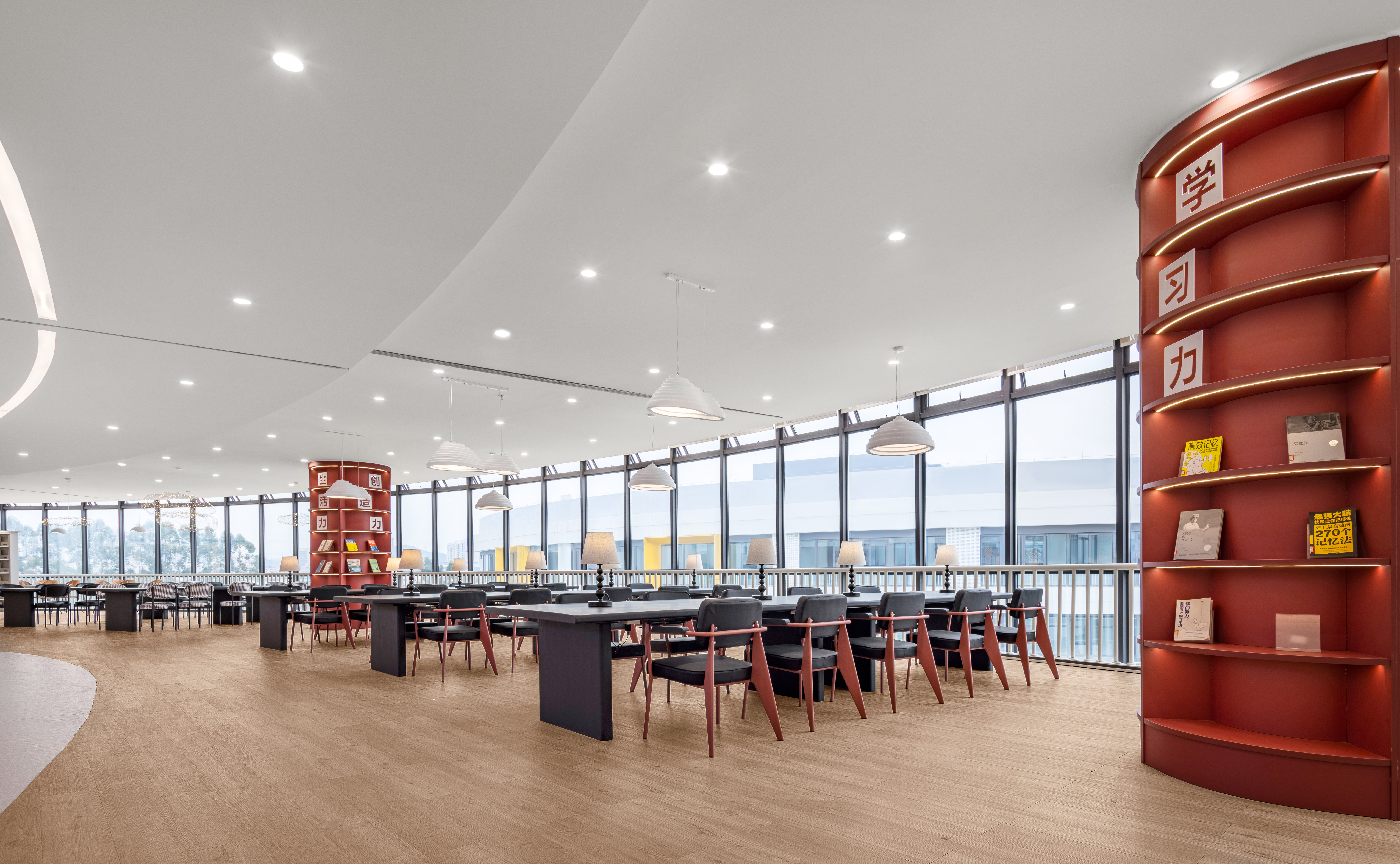 多人学习区在四楼中间的位置,空间开阔,光线好,靠窗学习非常舒适。在这个空间我们用了黑色和我们中国的传统色红色做为空间的主题色,黑色沉稳严瑾,中国红象征永恒、光明、生机、繁盛、温暖和希望。将中国文化与现代艺术相融合,打造一个具有文化又与众不同的学习空间