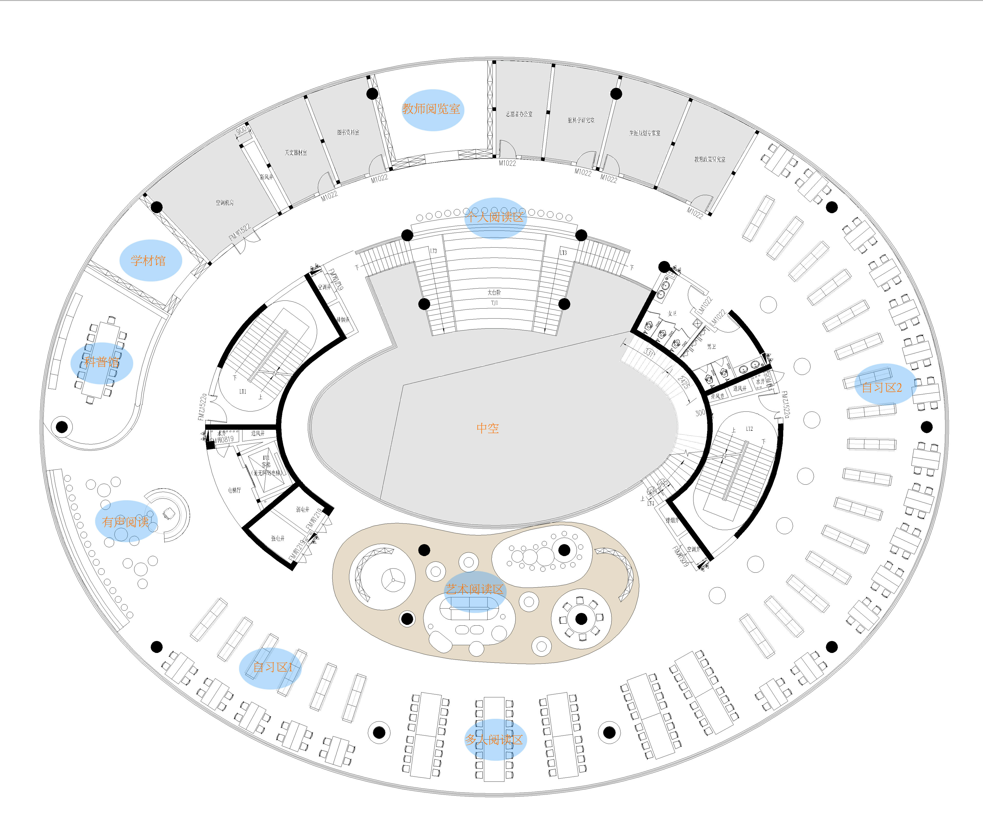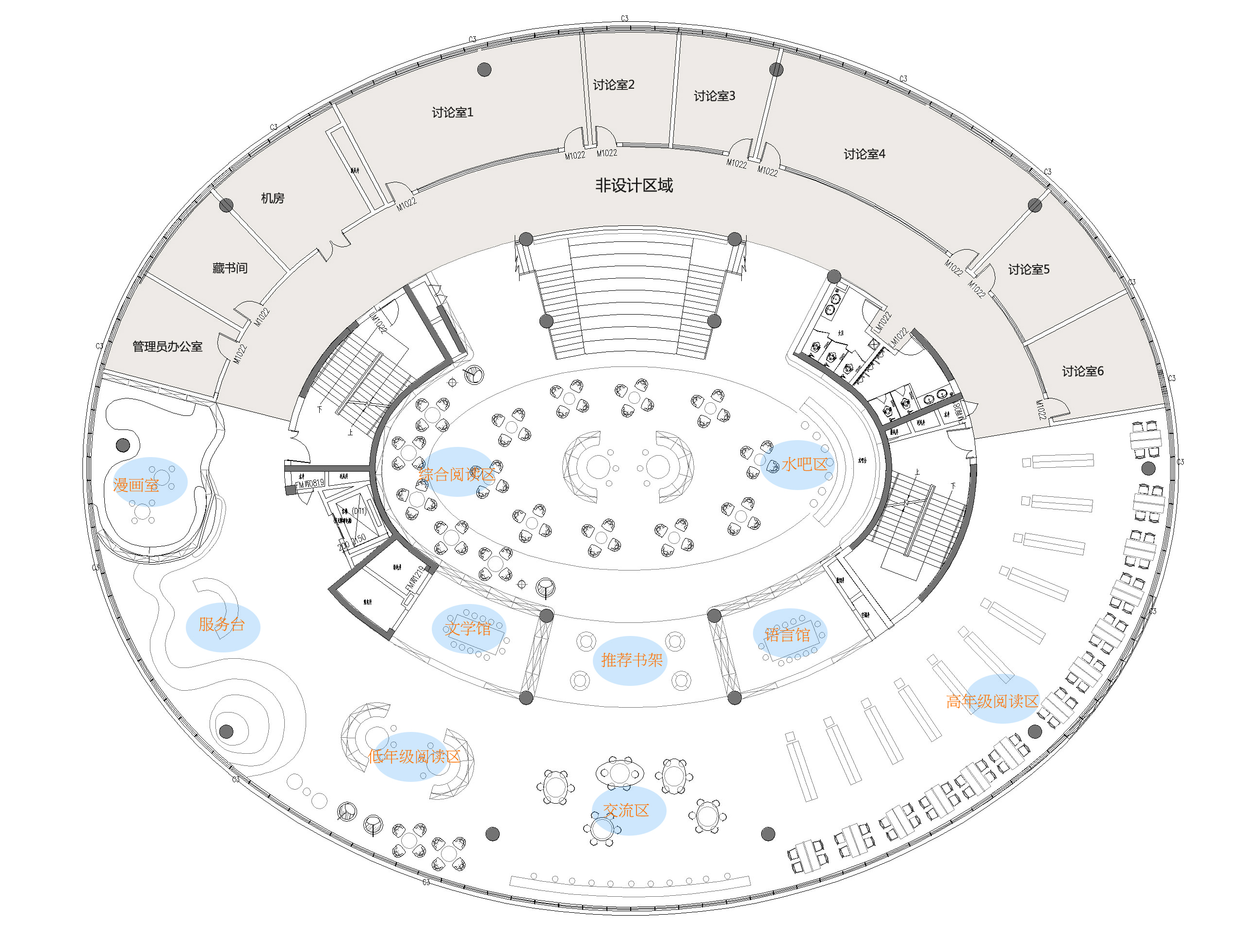 空间布局:图书馆建筑是一个椭圆形,我们的环境流线是以一个无界线的学习环境,使我们整个空间更加有趣味性,流线贯穿了每个学习和阅读空间。
