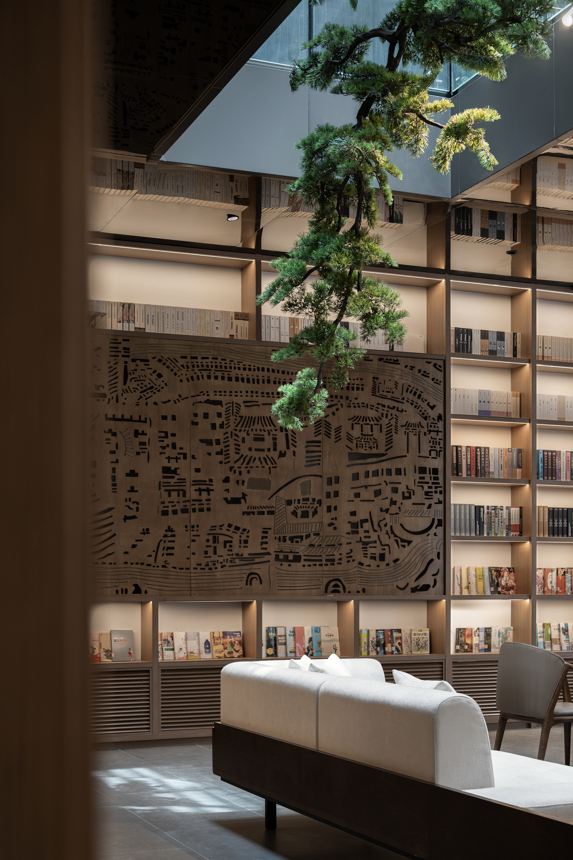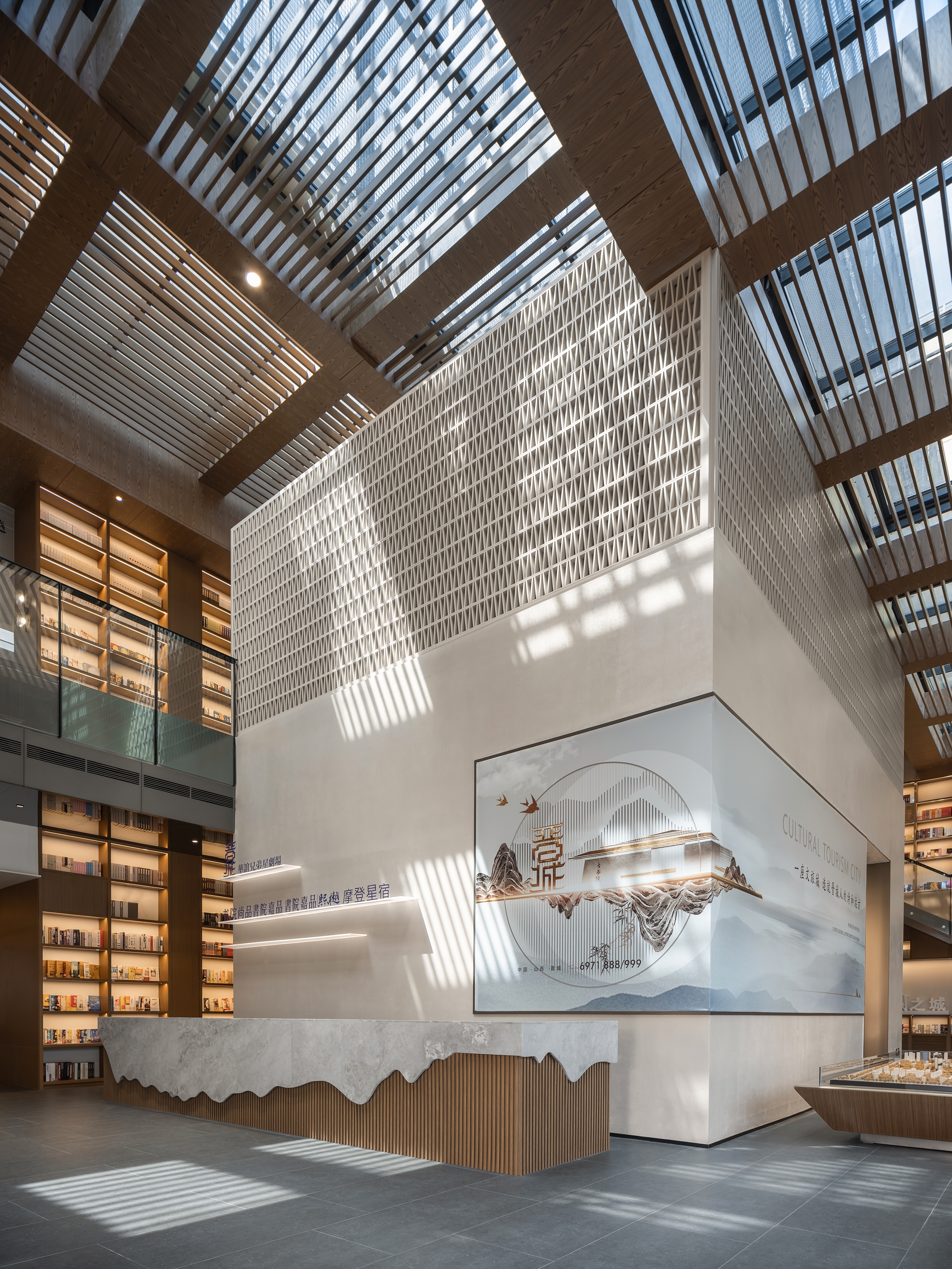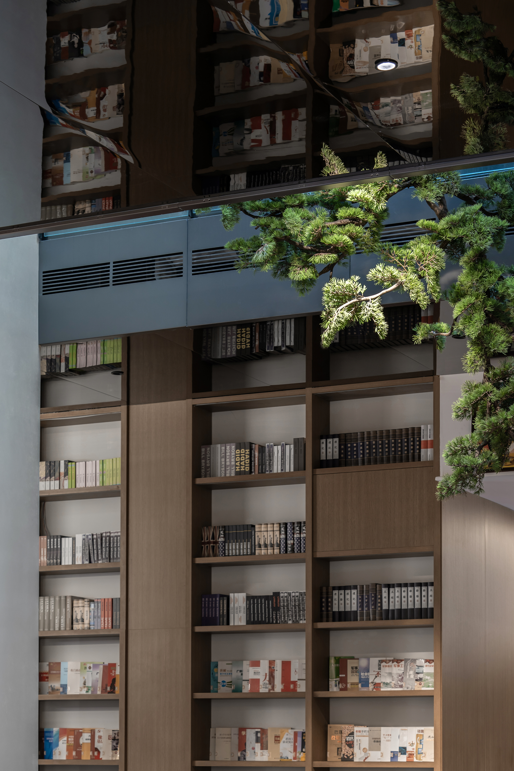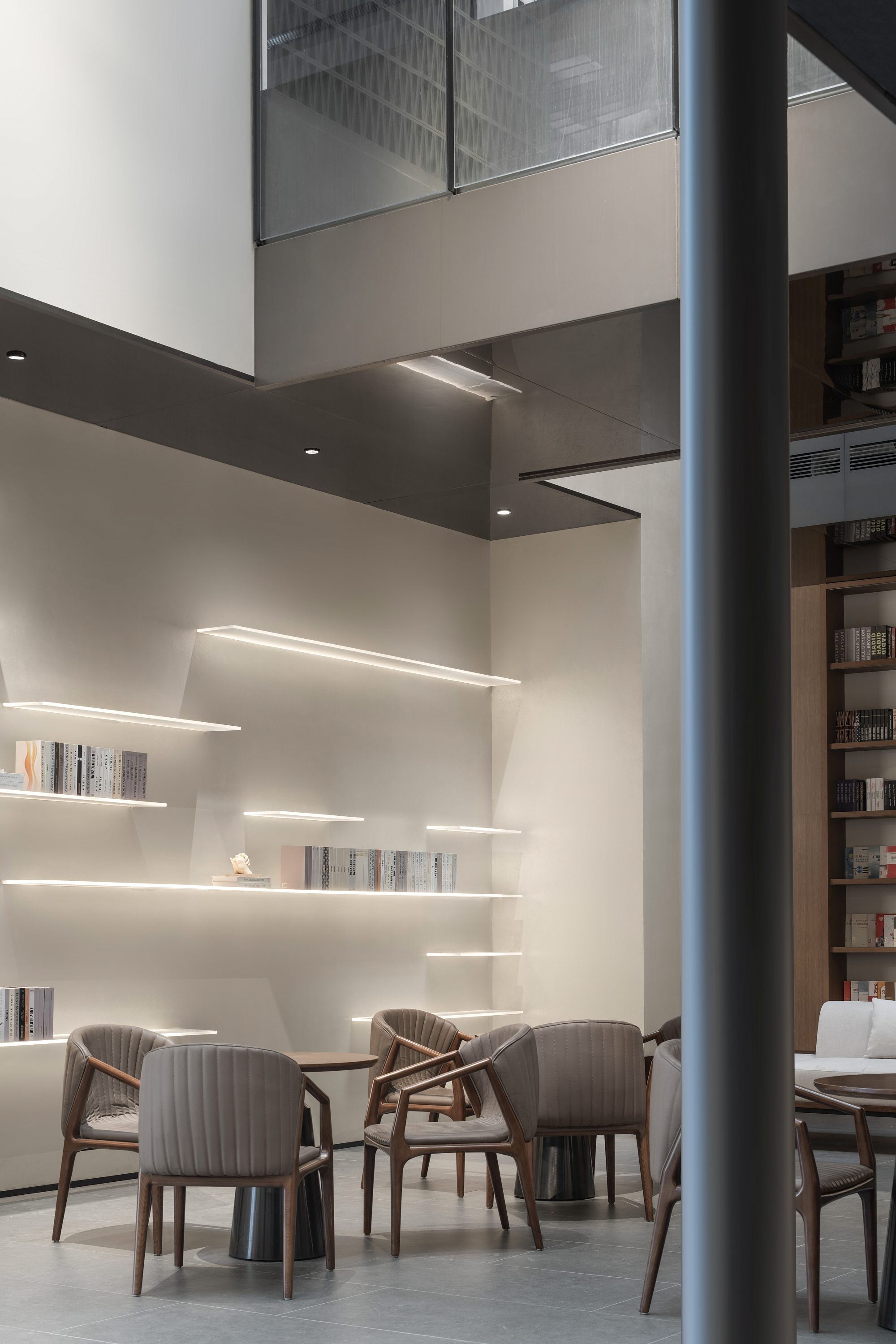 空间布局:空间采用构中构的手法,中间一个盒子体块,将空间功能四部分—阅读区、接待区、艺术连廊、文创区,同时盒子本身分为上下两层,承载了产品展示核心功能及办公功能。一部盘旋而上的艺术楼梯,和顶面太行山脉的形体相得益彰