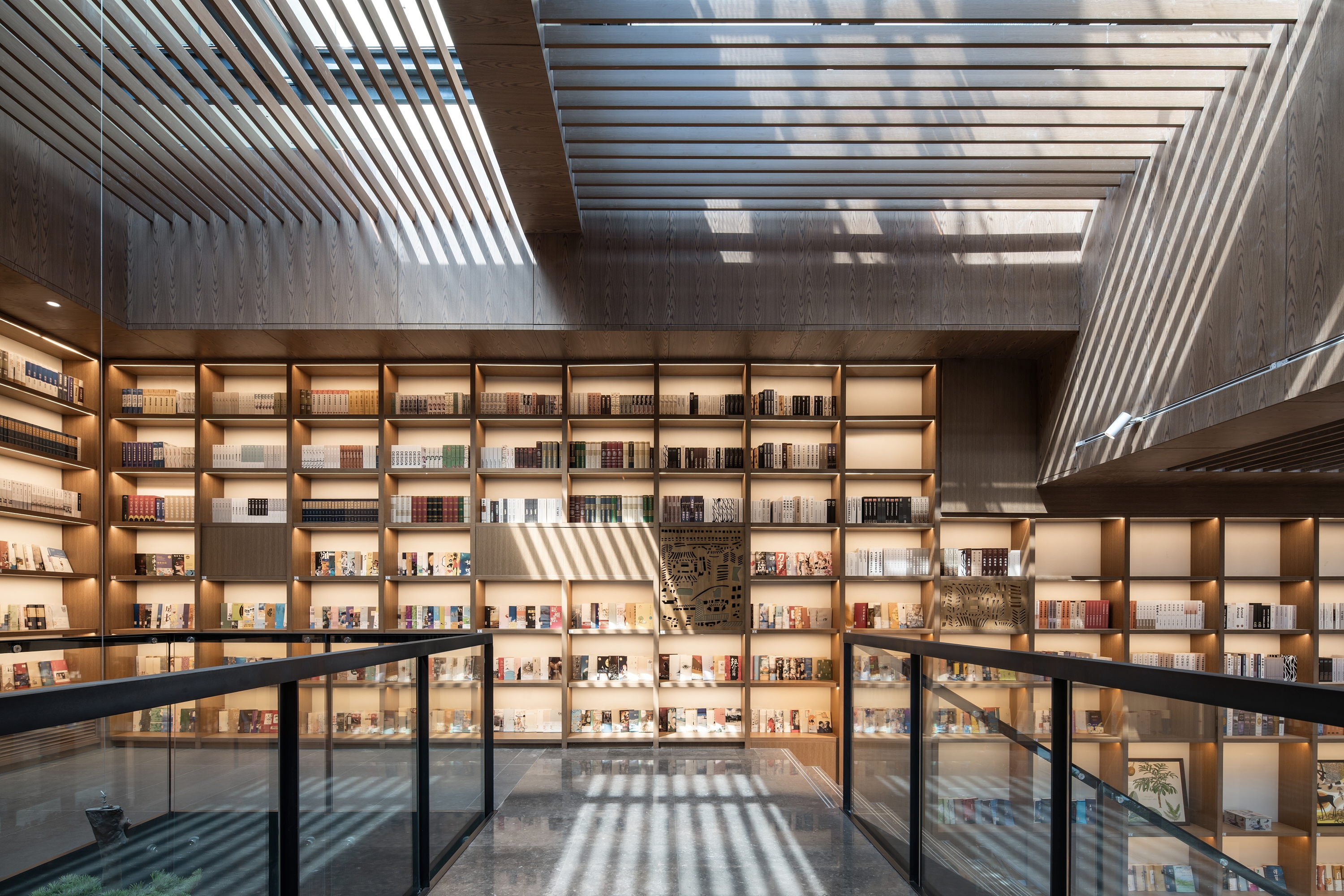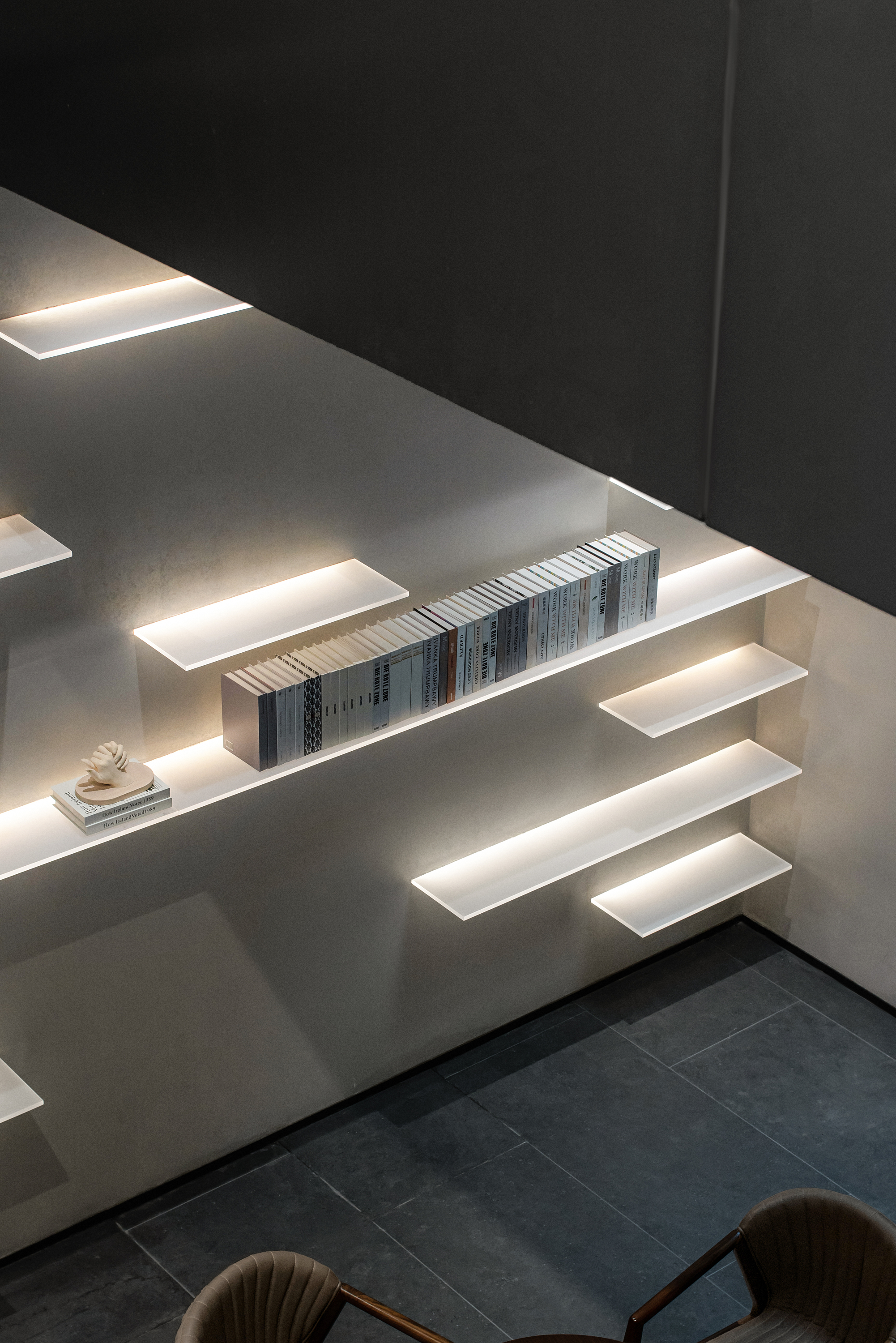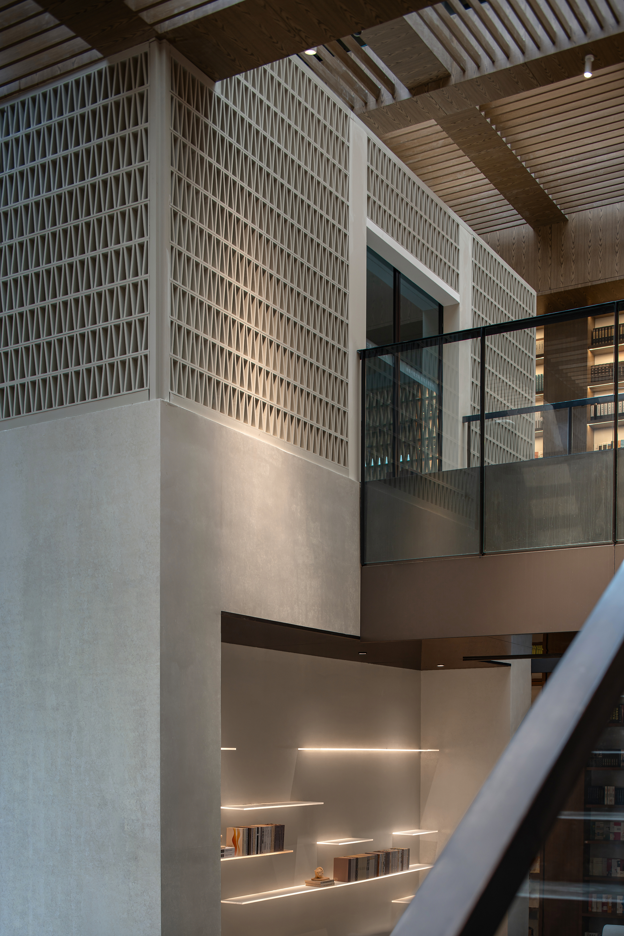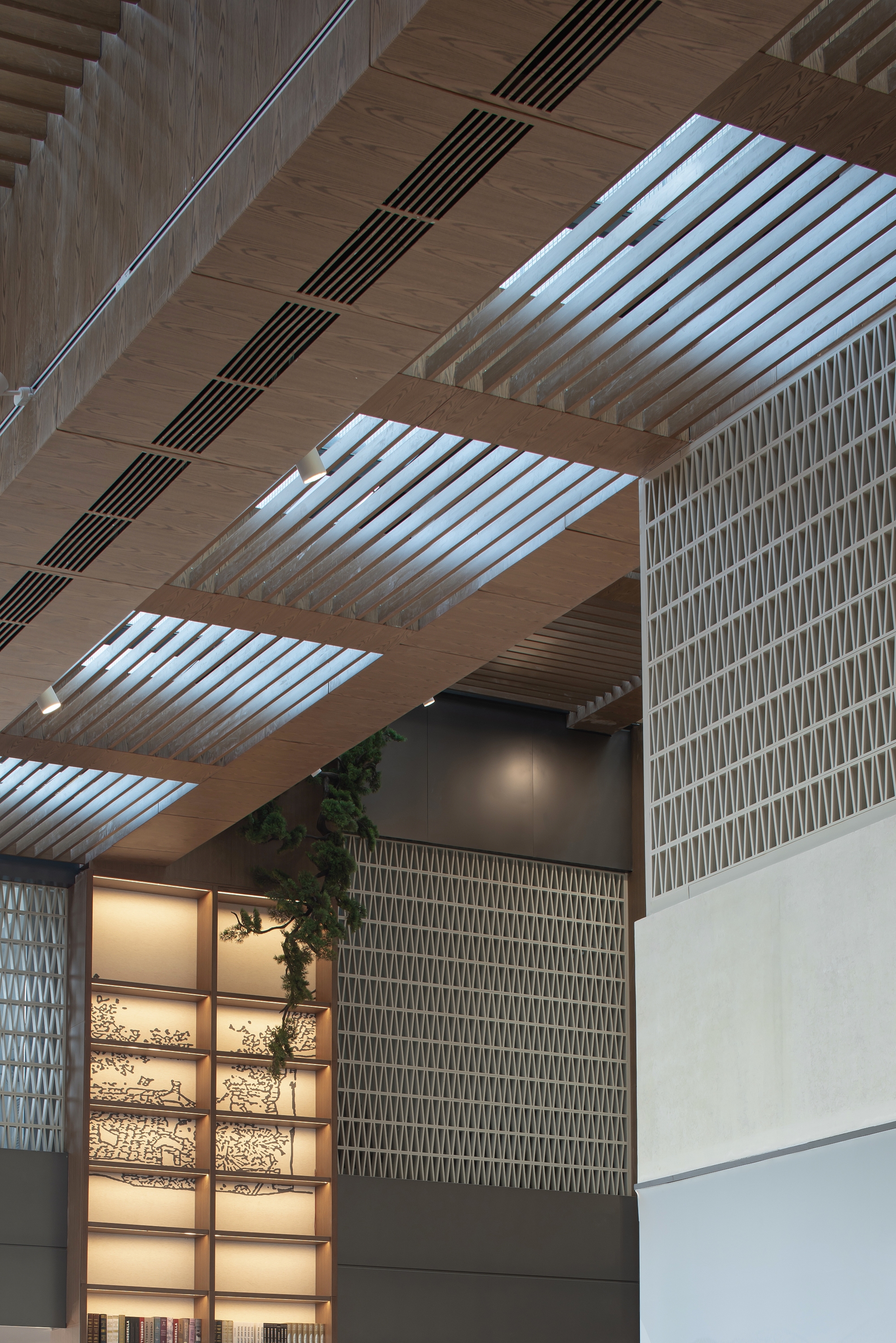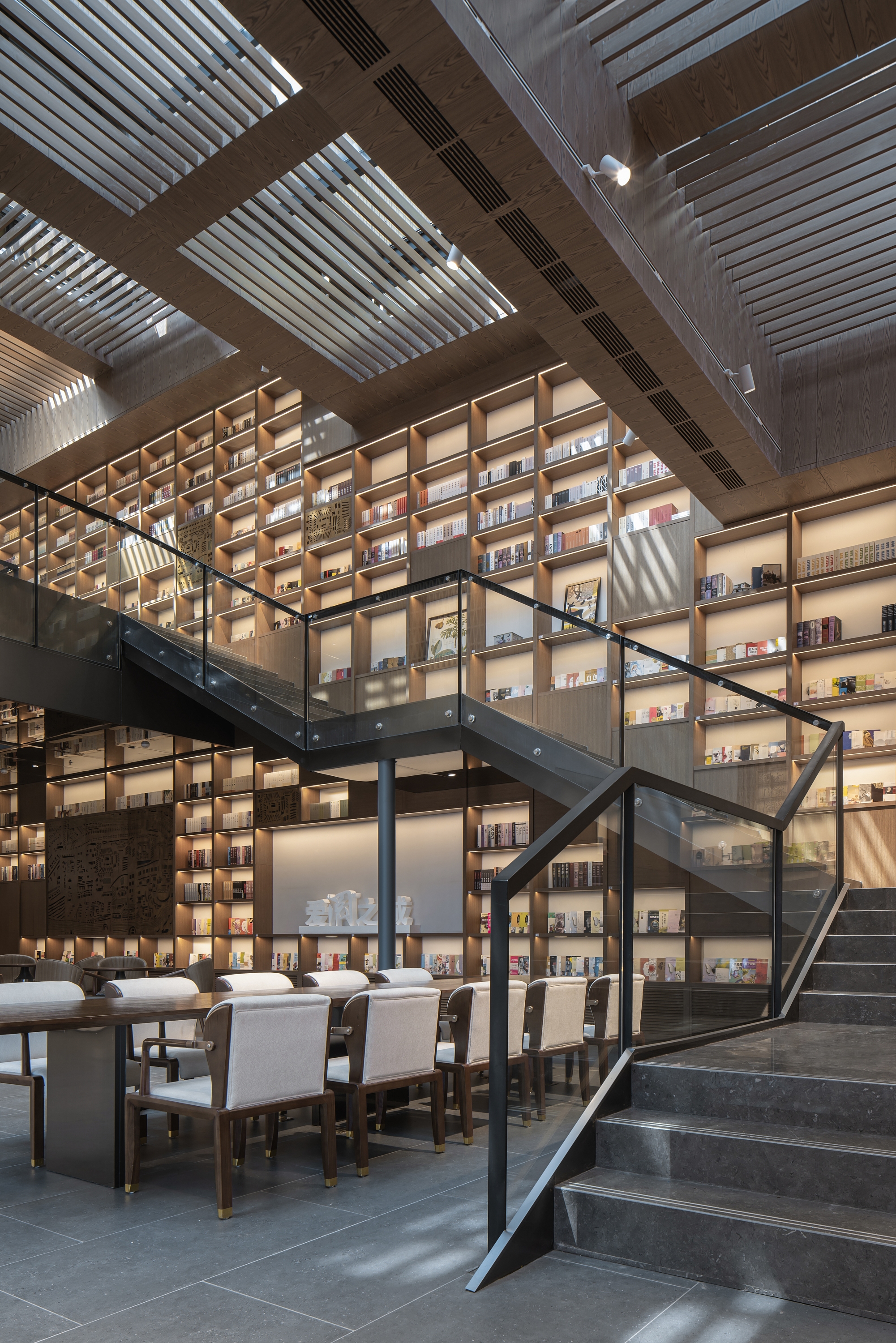 空间布局:空间采用构中构的手法,中间一个盒子体块,将空间功能四部分—阅读区、接待区、艺术连廊、文创区,同时盒子本身分为上下两层,承载了产品展示核心功能及办公功能。一部盘旋而上的艺术楼梯,和顶面太行山脉的形体相得益彰