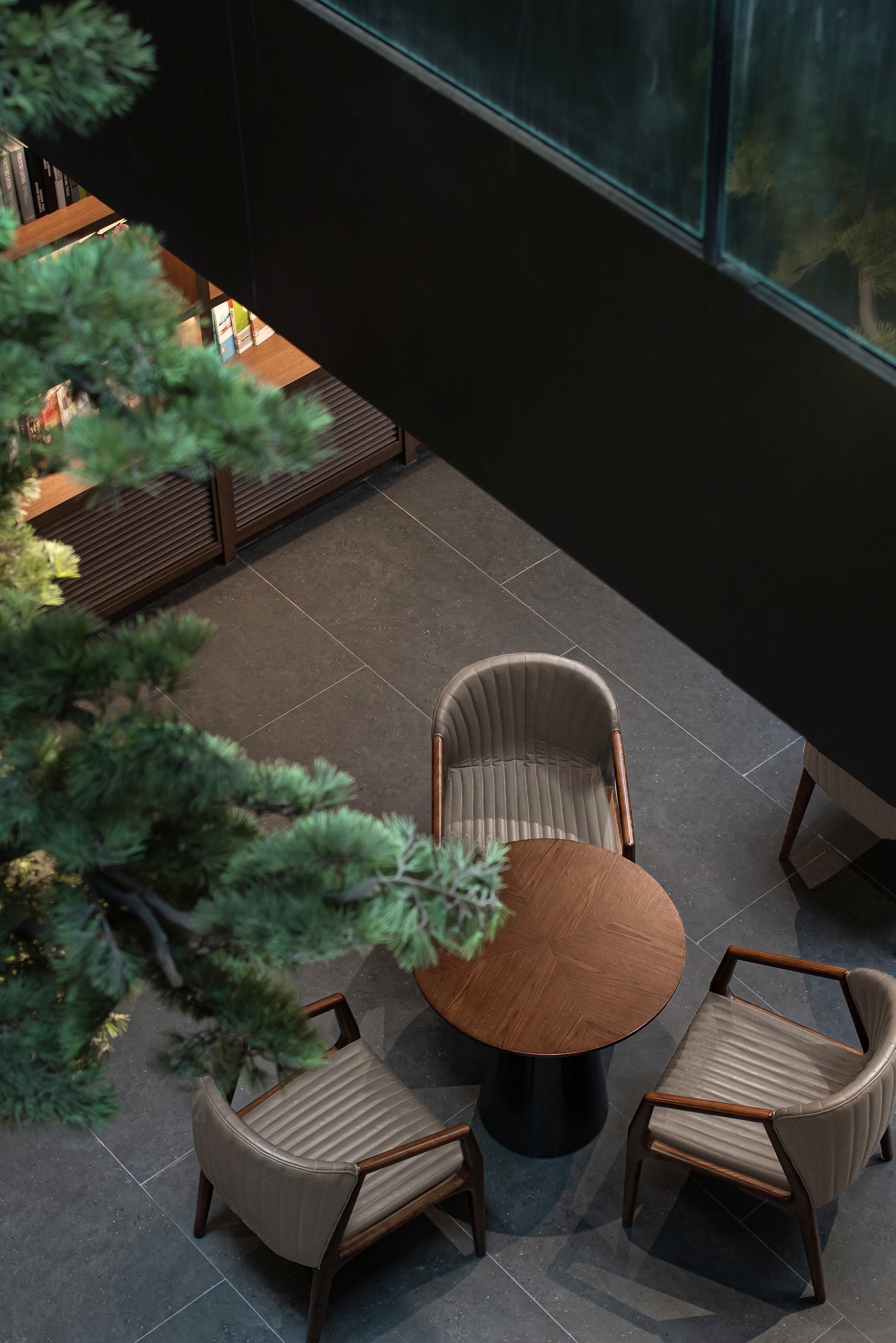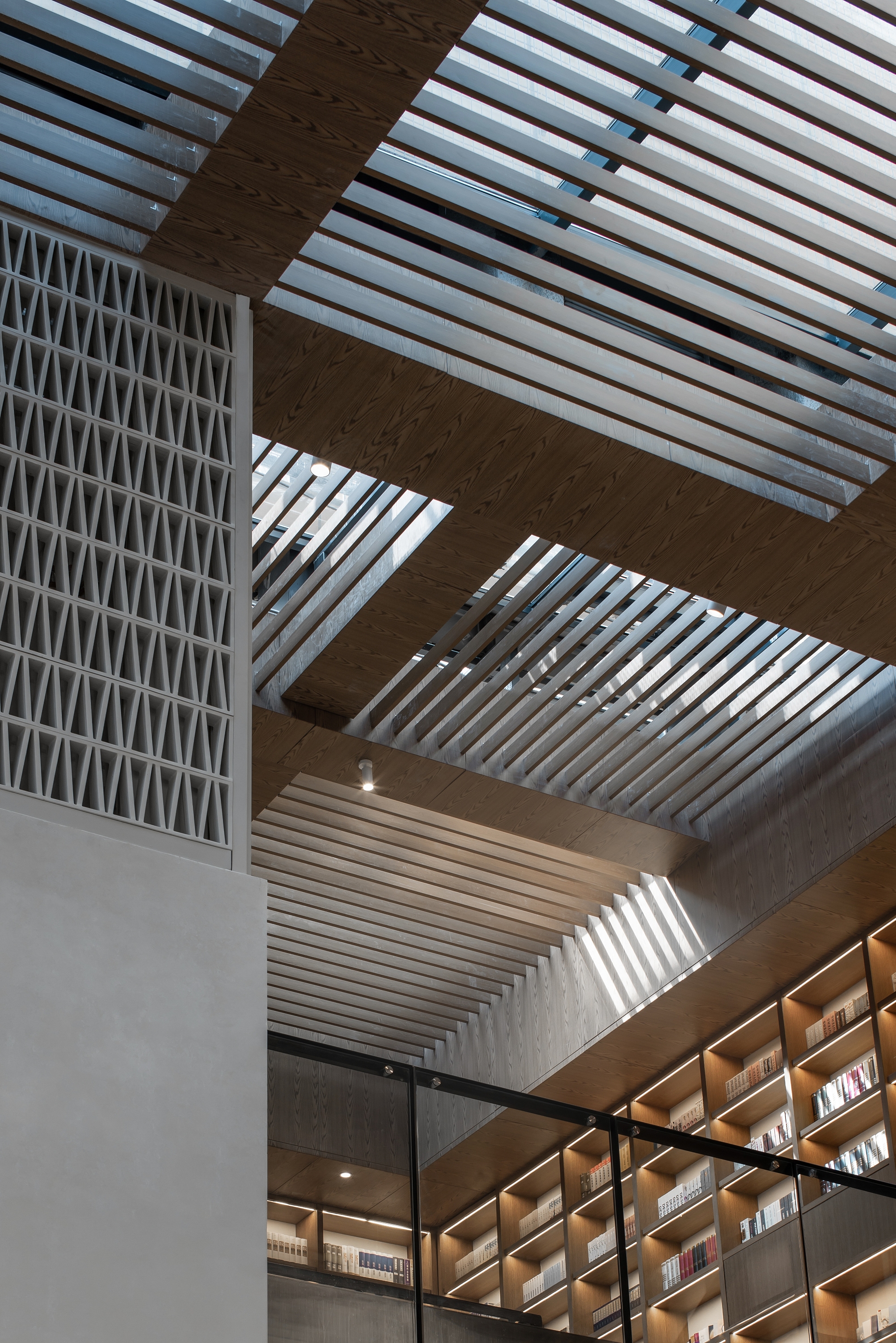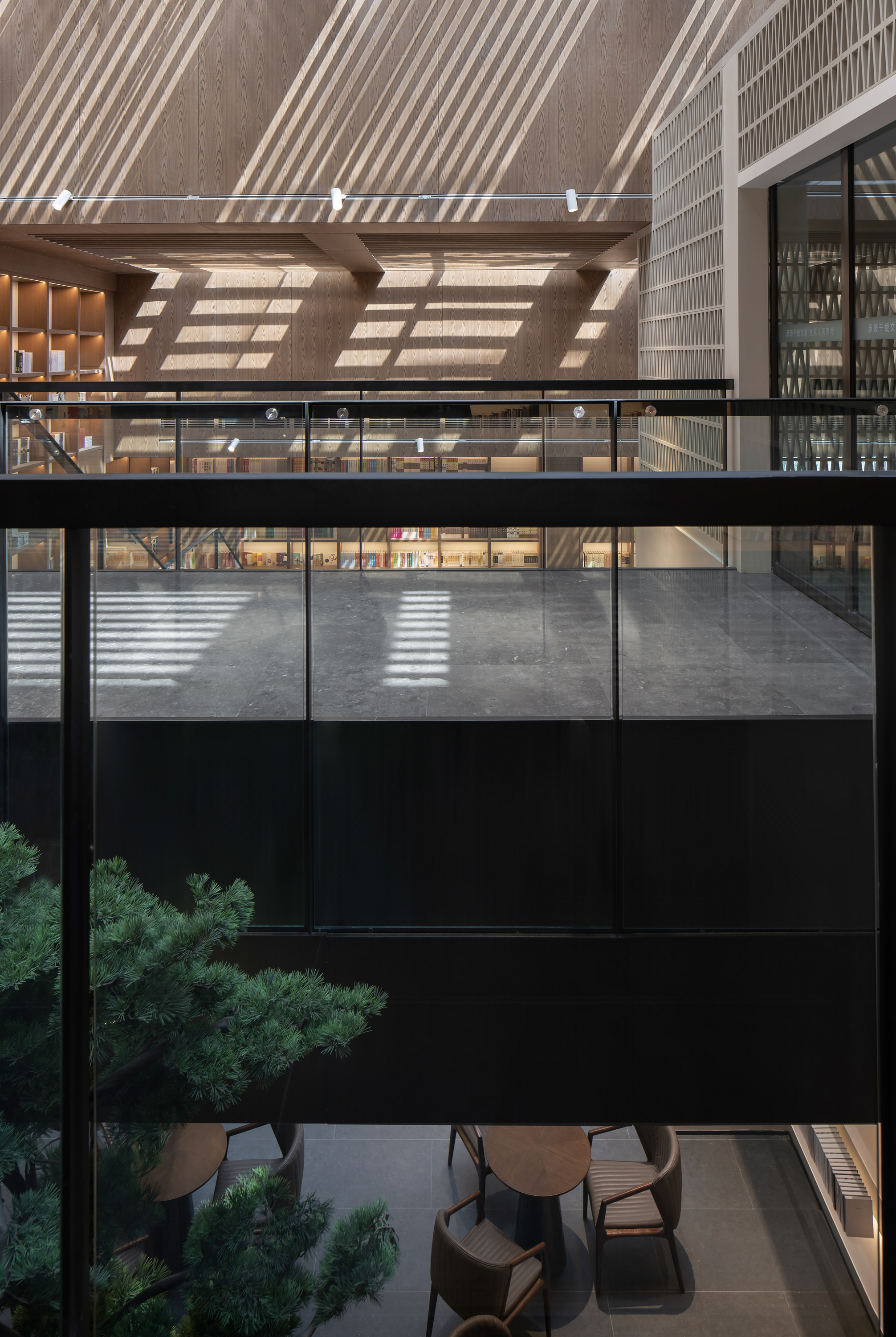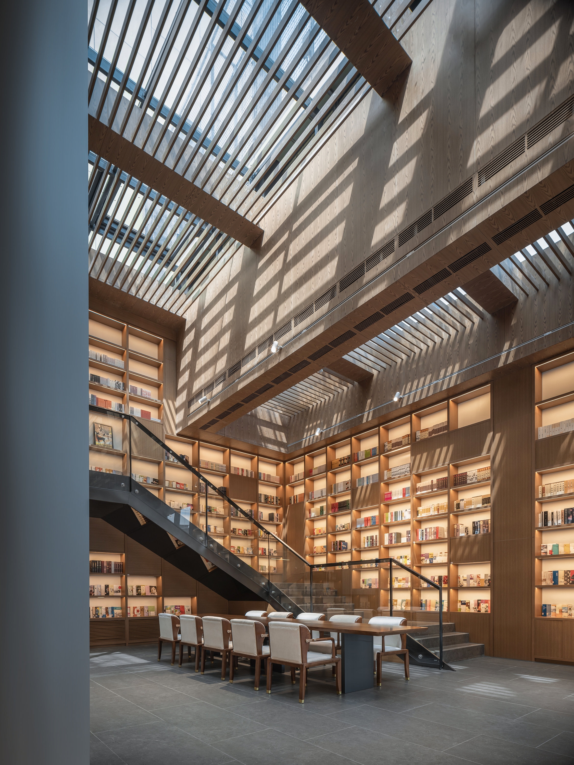 空间布局:空间采用构中构的手法,中间一个盒子体块,将空间功能四部分—阅读区、接待区、艺术连廊、文创区,同时盒子本身分为上下两层,承载了产品展示核心功能及办公功能。一部盘旋而上的艺术楼梯,和顶面太行山脉的形体相得益彰