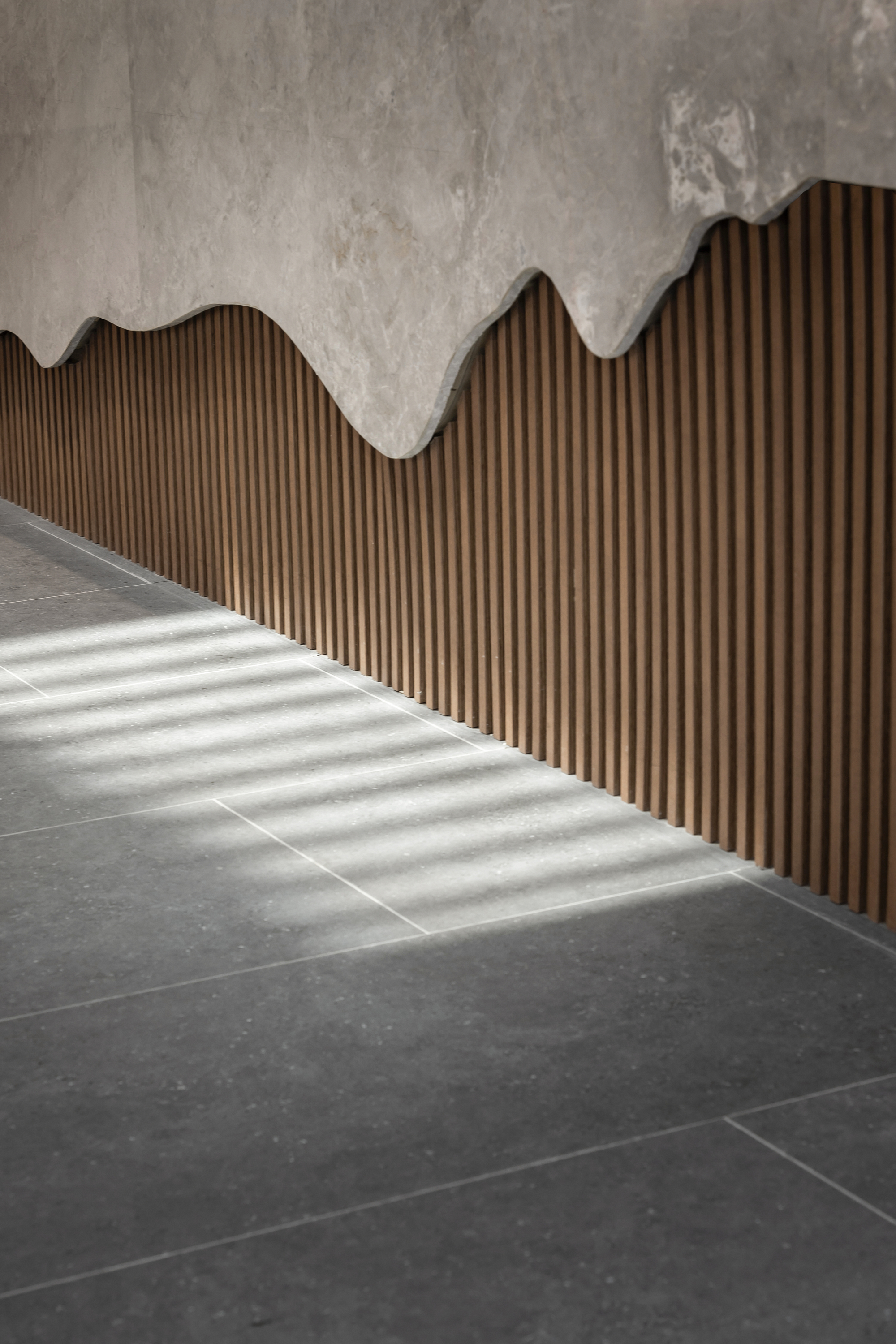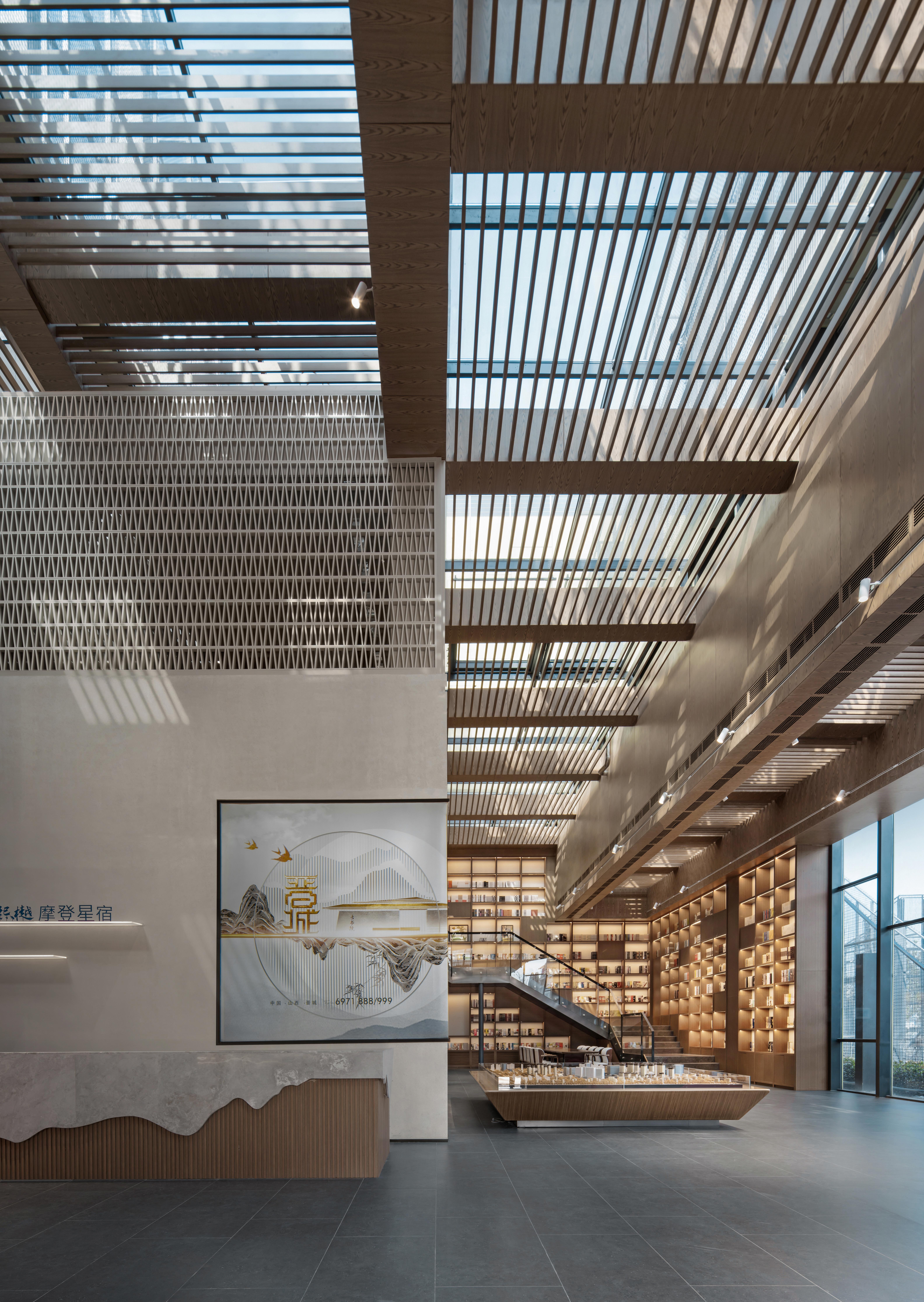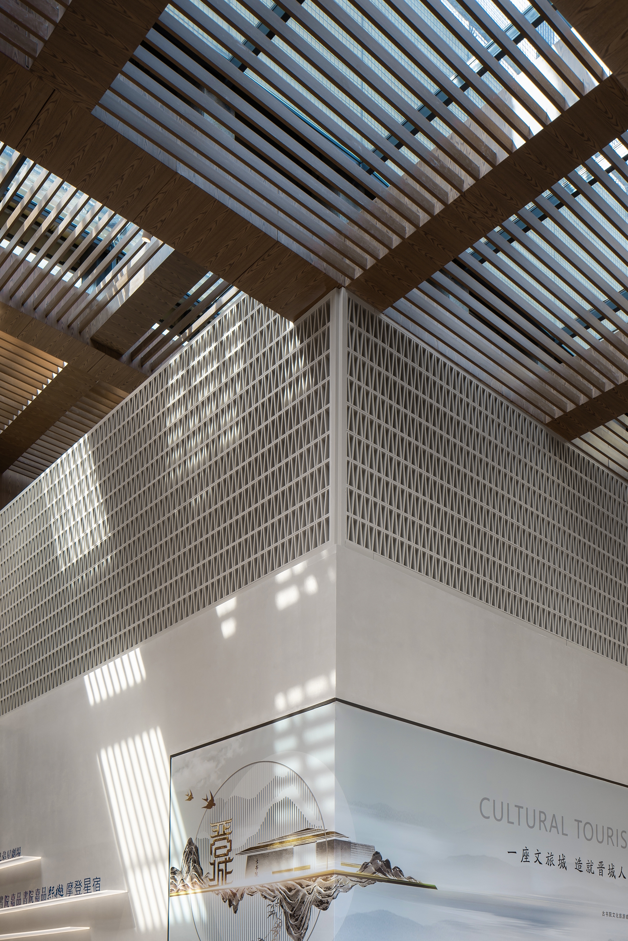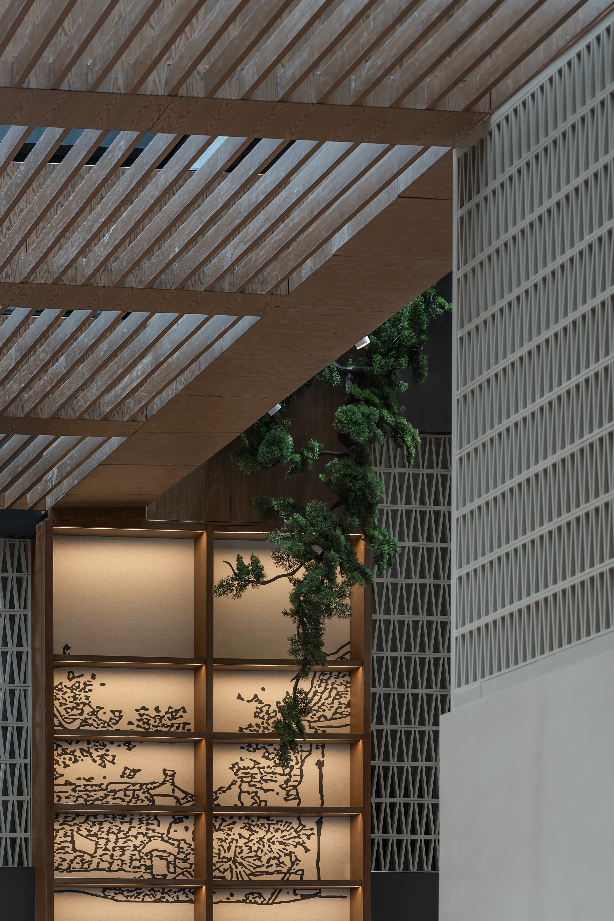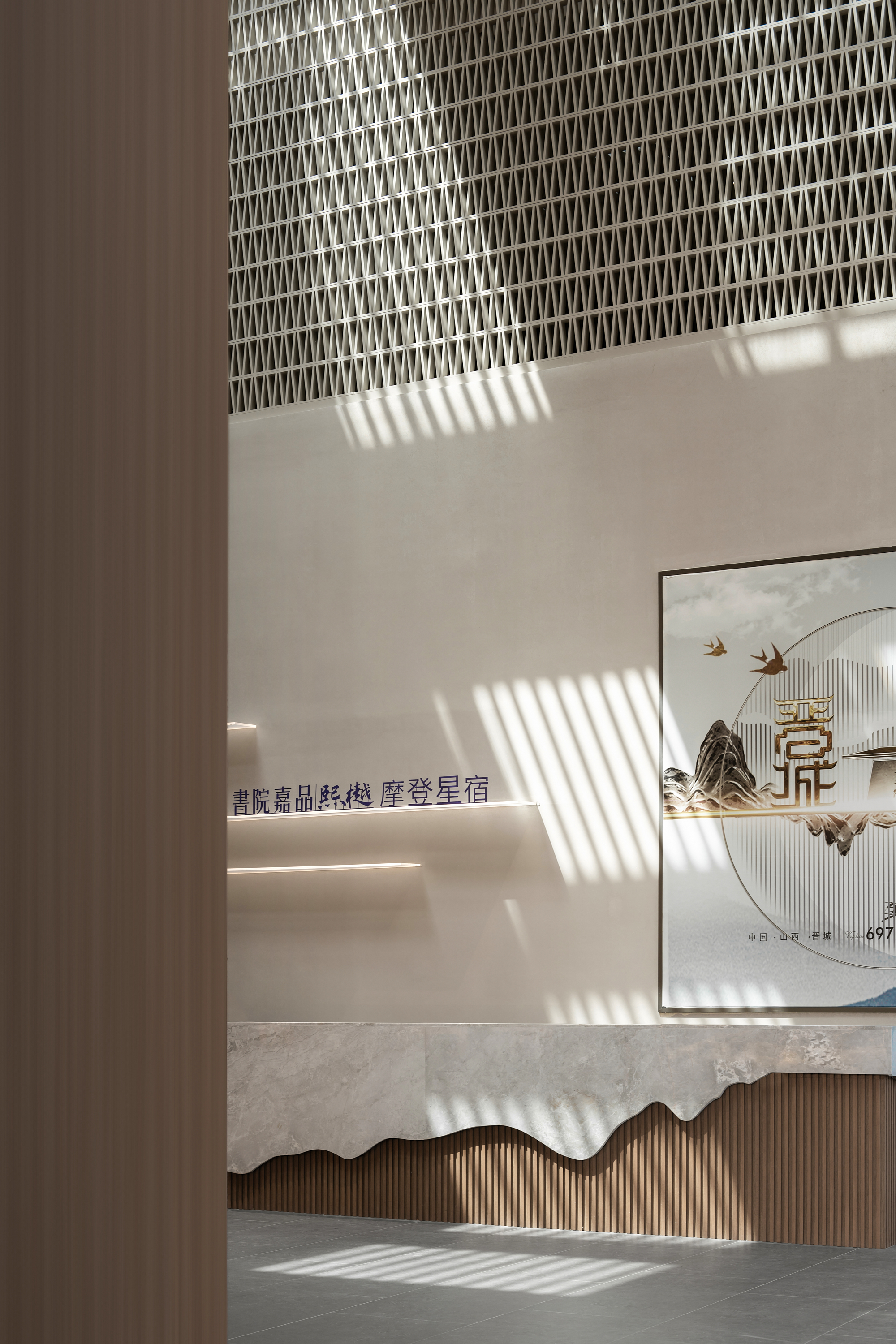 空间意境:设计师将太行山脉、古堡文化、三雕文化引用到空间里,进行由繁到简的演变,契合当代人的审美标准。空间的结构及层次变化,从顶面的太行山脉的演绎到空间与空间层次错落的变化,凸显了古堡文化的特点,其墙面一些肌理的变化,隐喻古城旧时的斑驳及永恒。