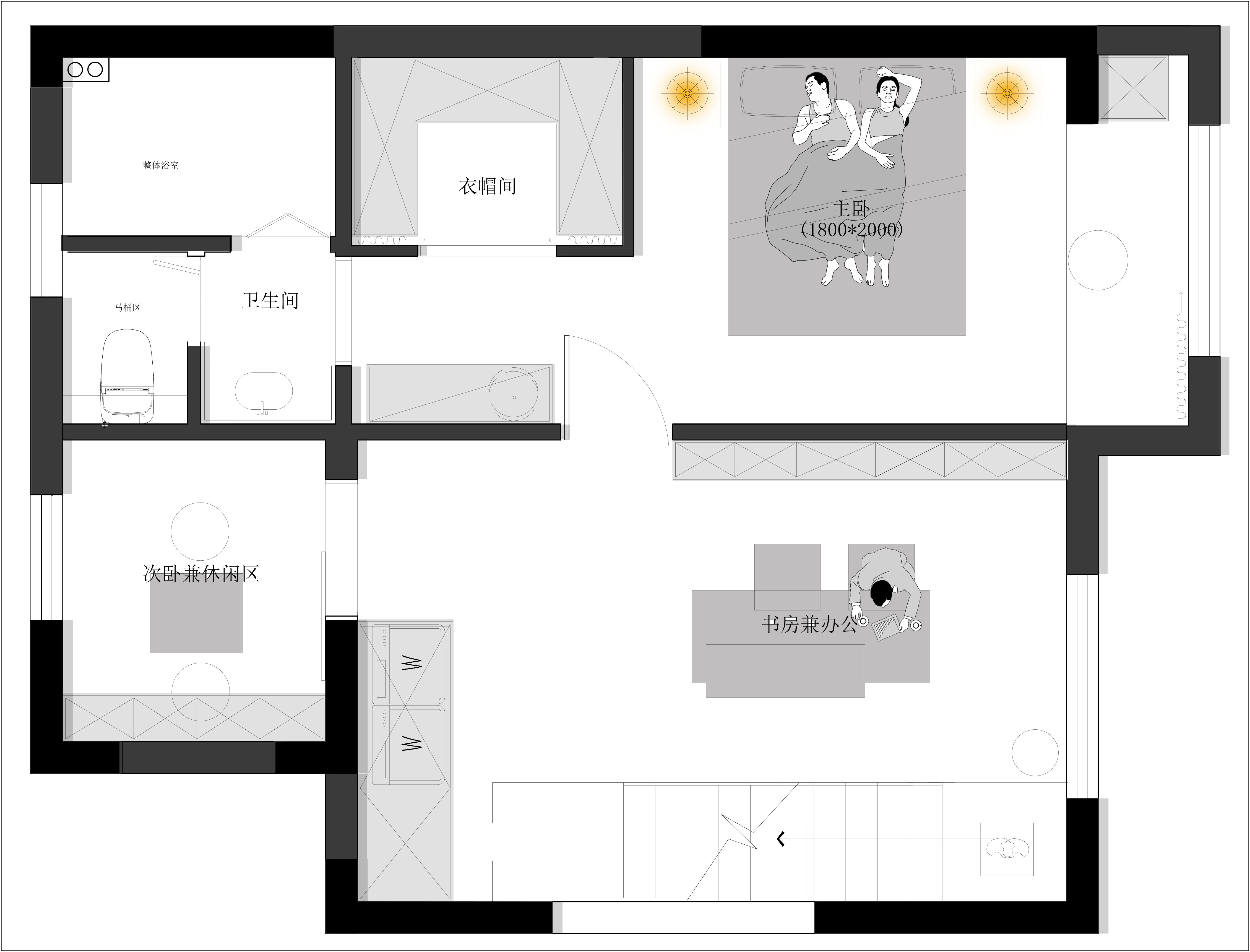 二楼是夫妻俩主要的活动区,结合屋主的生活动线进行了整体重构: