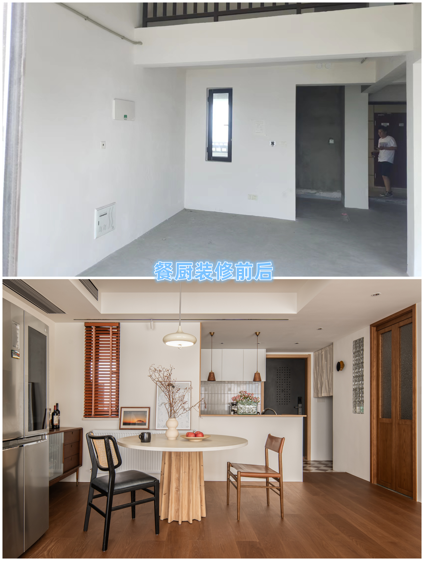 考虑到餐厨区域的采光和空间利用率,设计师对这个空间进行重构,将厨房与玄关的墙体拆除,餐厅与厨房用半墙隔断。考虑入户入眼即是厕所,以及厕所窗户对着楼层公共走廊,设计后调整了楼梯的位置,同时将原来的楼梯间和部分原卫生间空间打造成了卫生间,将卫生间调整成了玄关储物区。