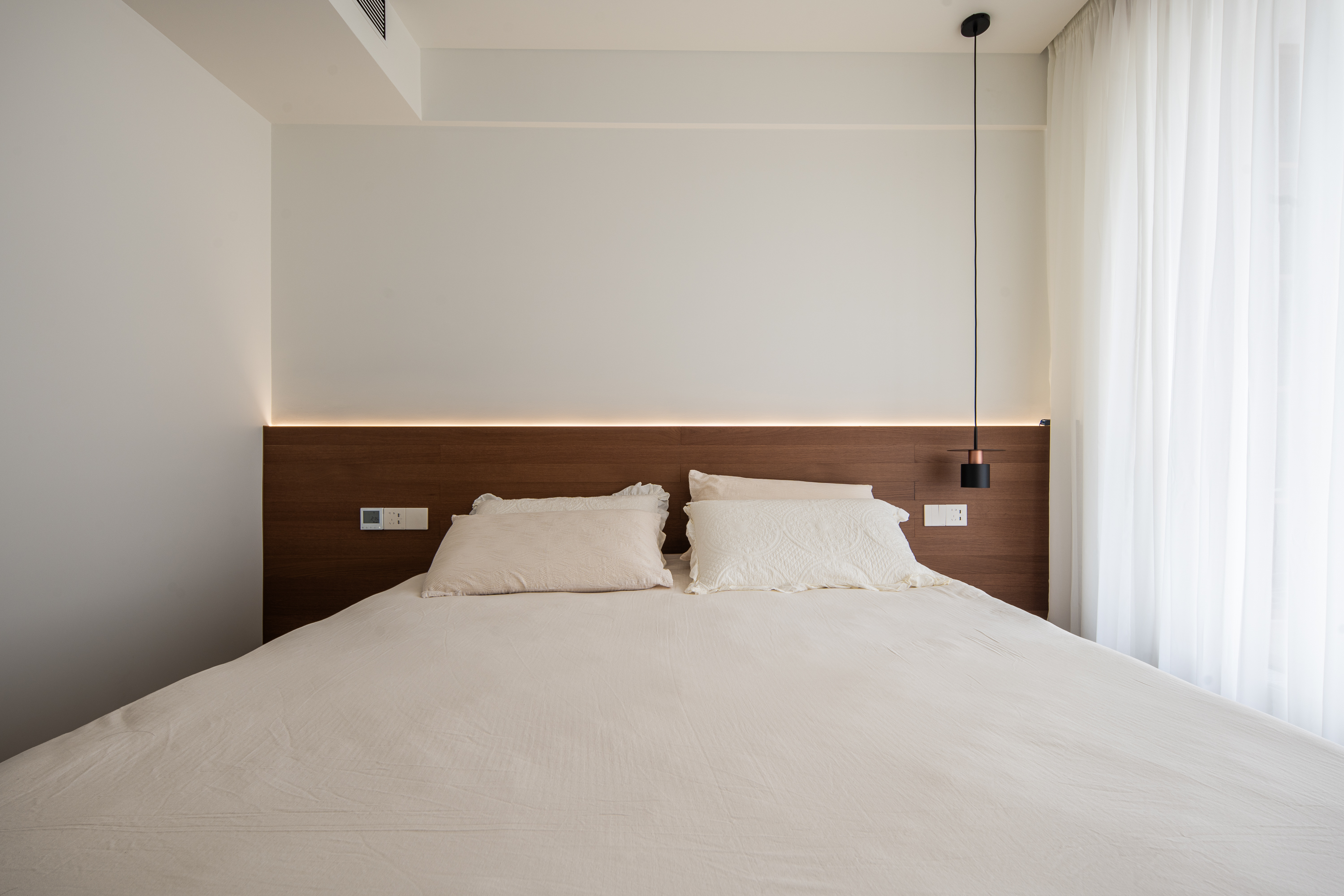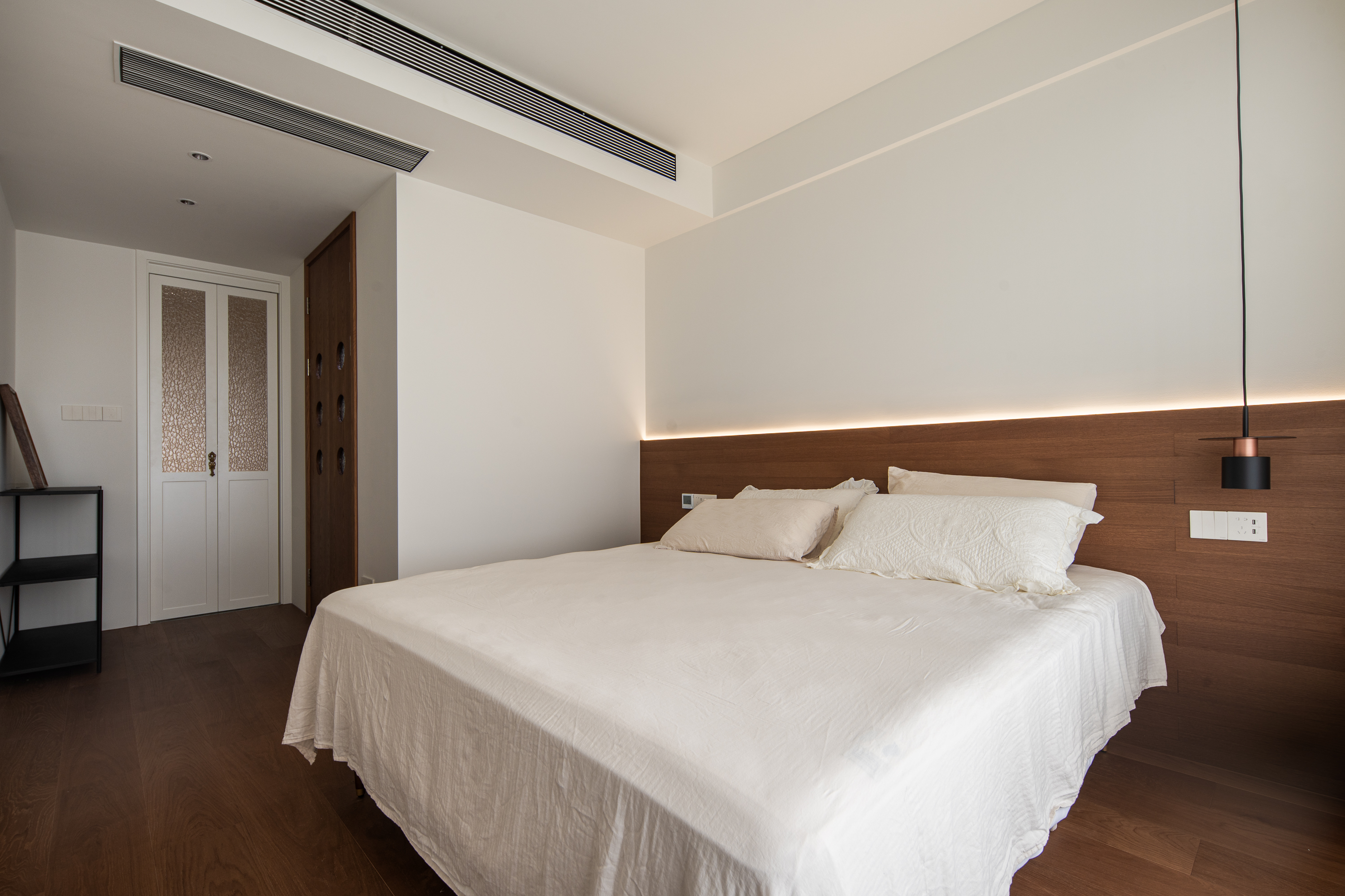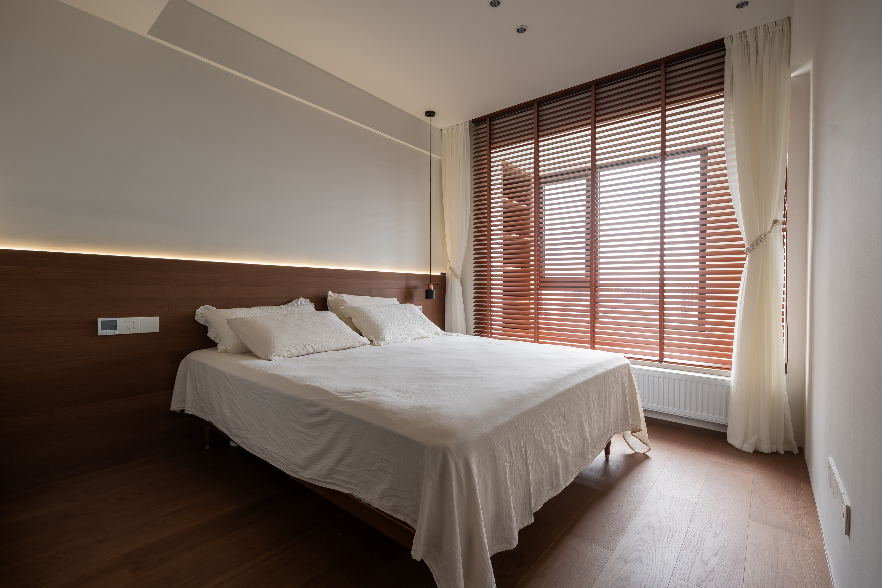 卧室整体色温选择暖色调为主,显得温馨柔和。同色系质感的家具,使整个空间温暖治愈,同时还具有浓厚的自然和艺术气息,特别设计的床头灯散发出温暖柔和的光芒,为整个空间增添了浪漫的氛围感。考虑到窗户的遮光,窗户加了复古的百叶窗,与纱帘相配合,实用又有情调。