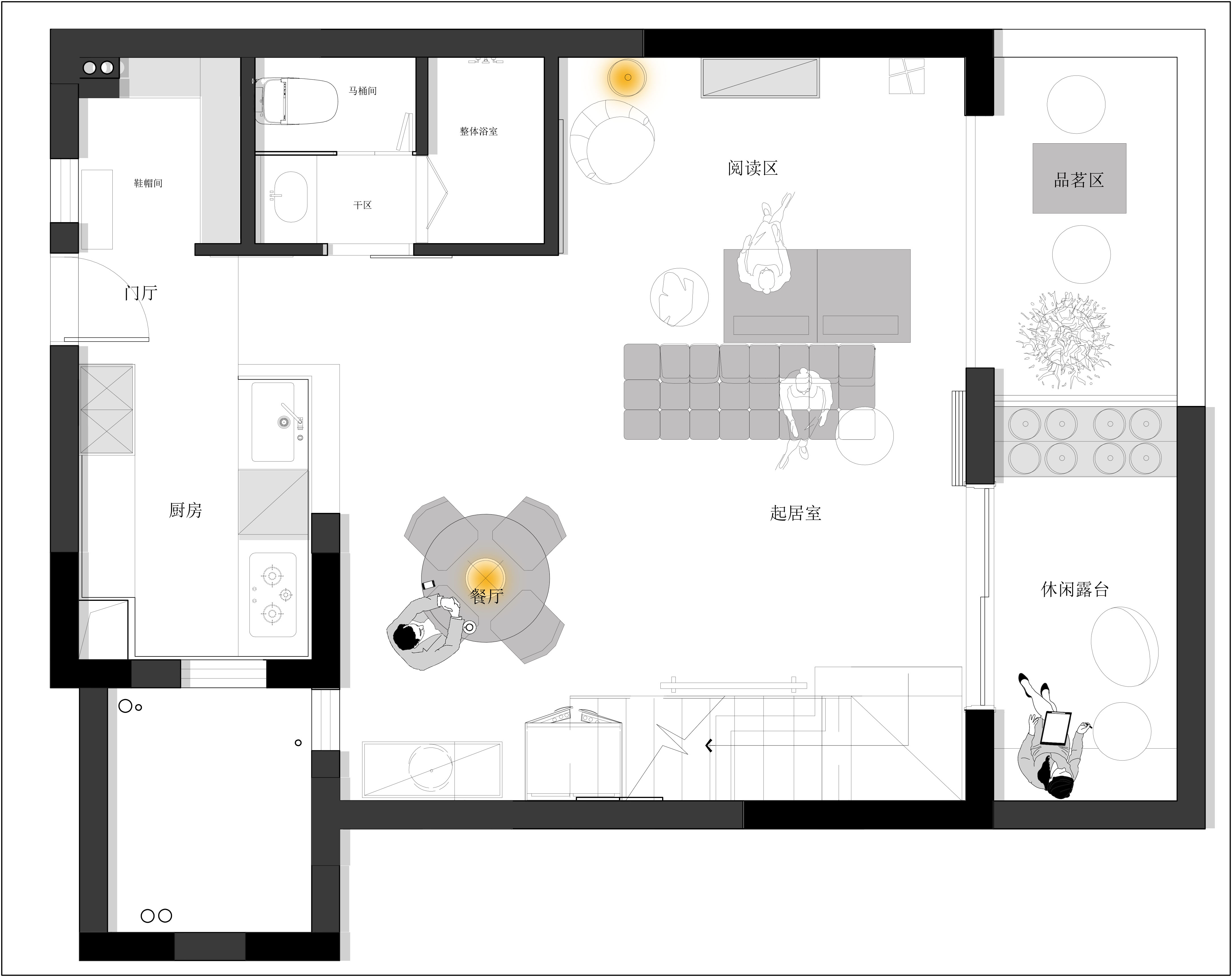 空间布局:结合屋主的需求和生活动线,将一楼进行整体重构: