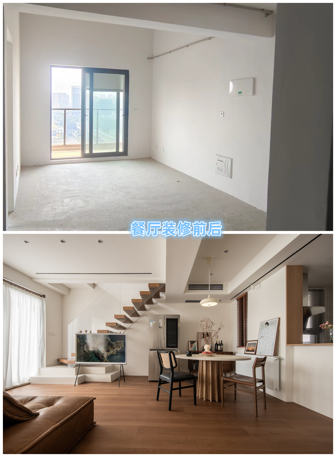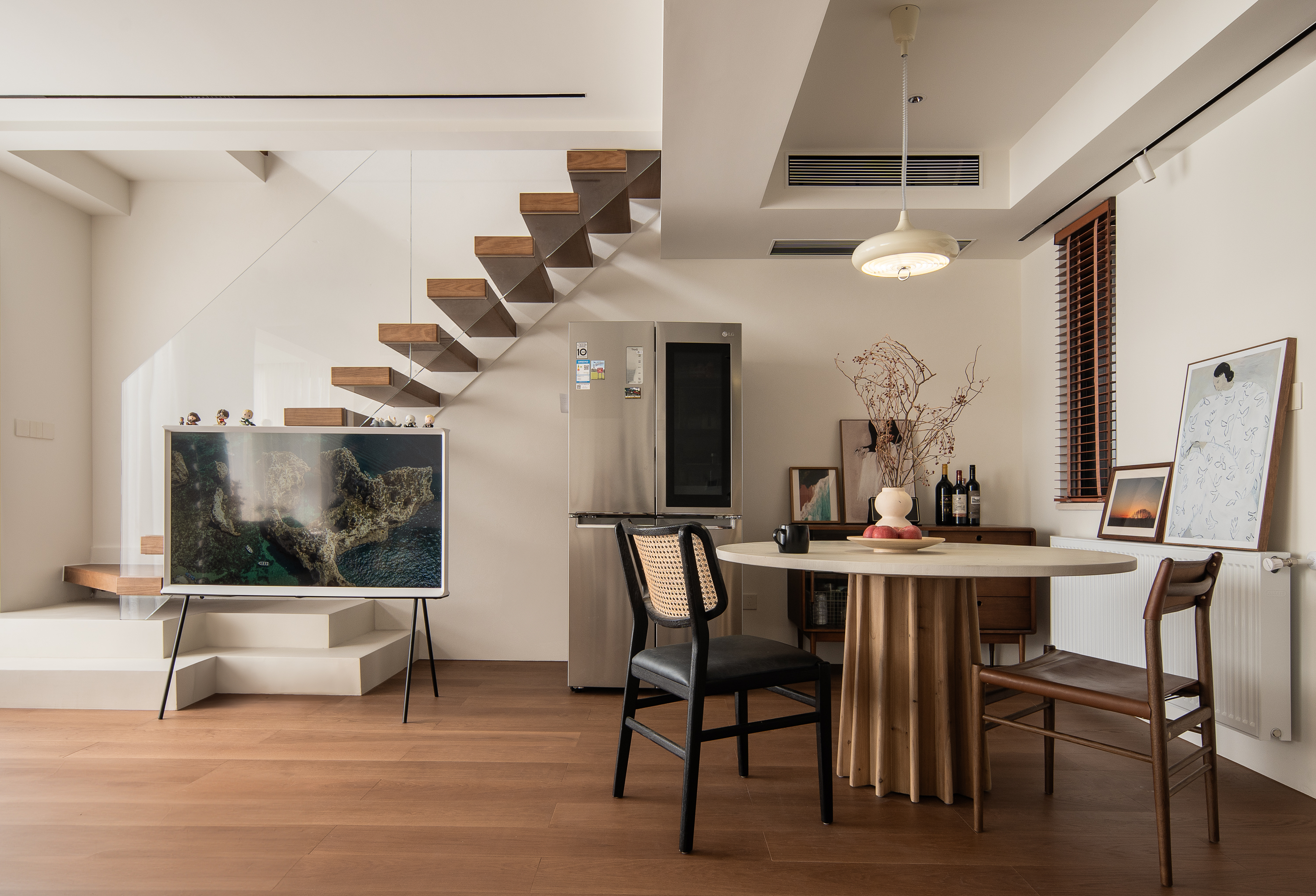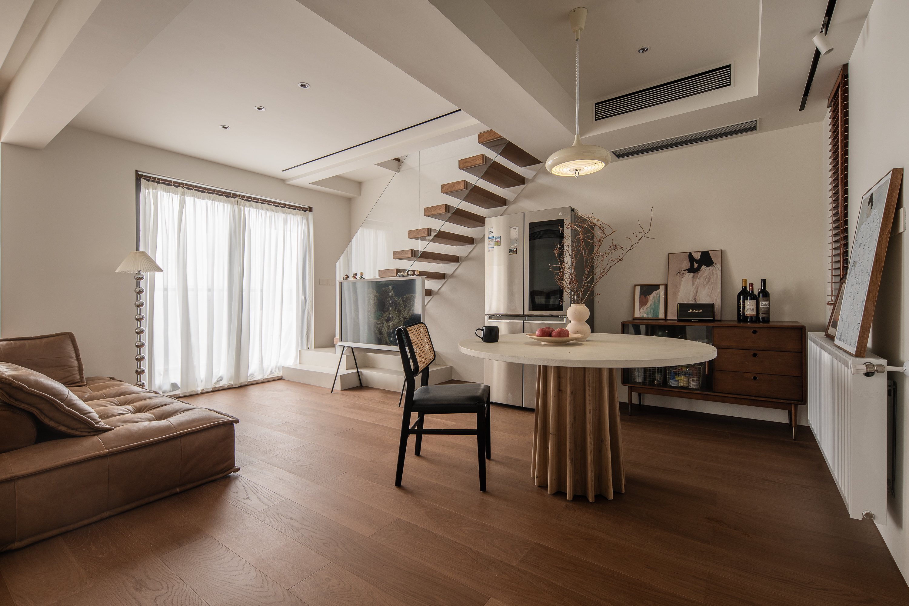 楼梯调整到餐厅区域,依墙而构建,空间占用率低,采光好。楼梯成了这个区域的一道靓丽风景线,与餐厅的中古风家具完美融合。支架电视可以根据需求摆放,实现了看电视自由。