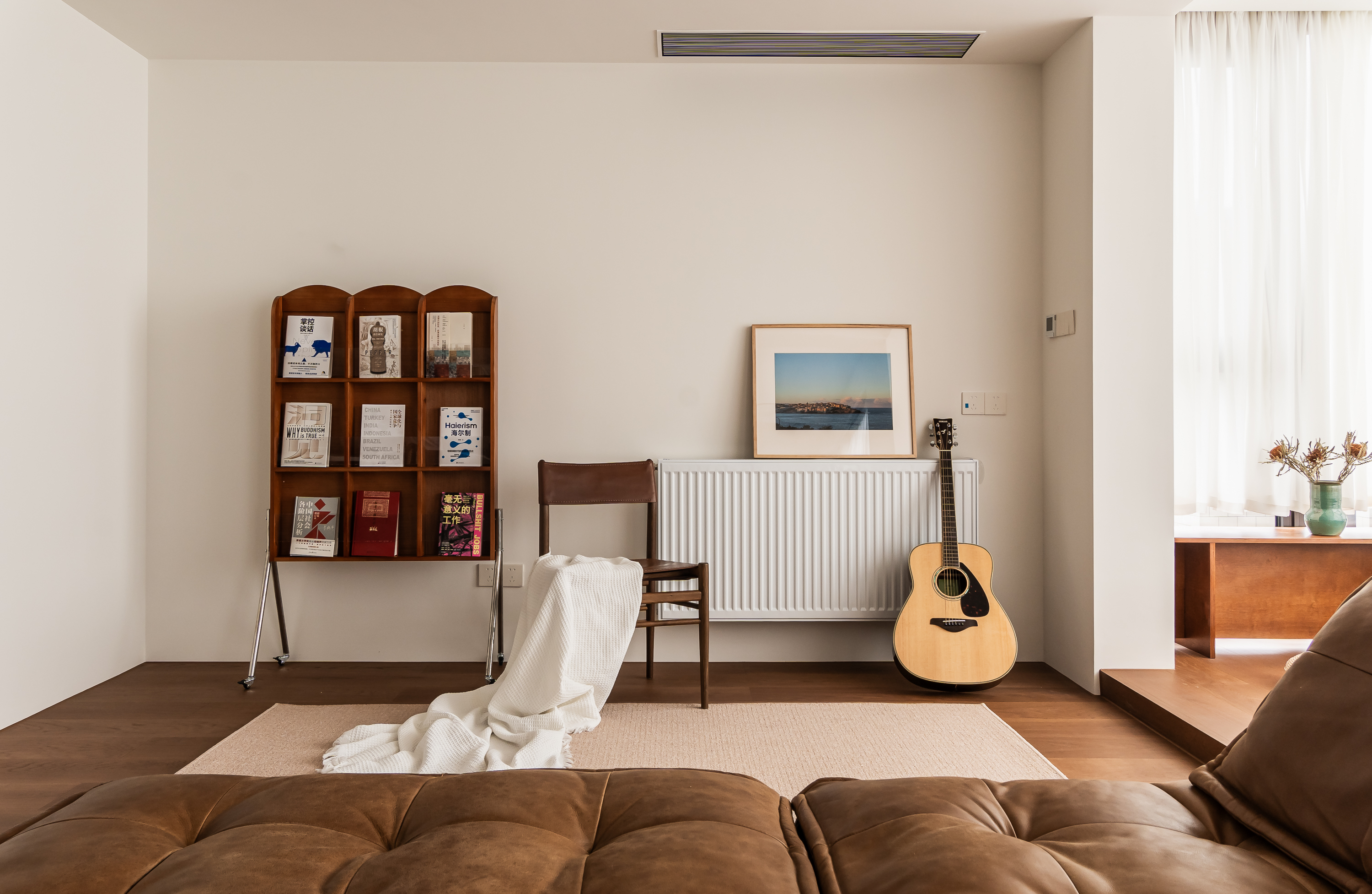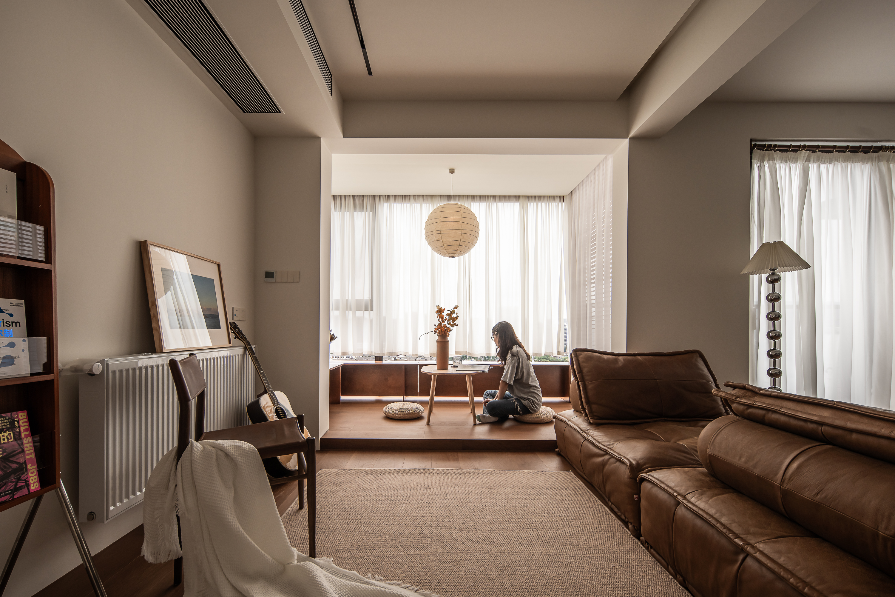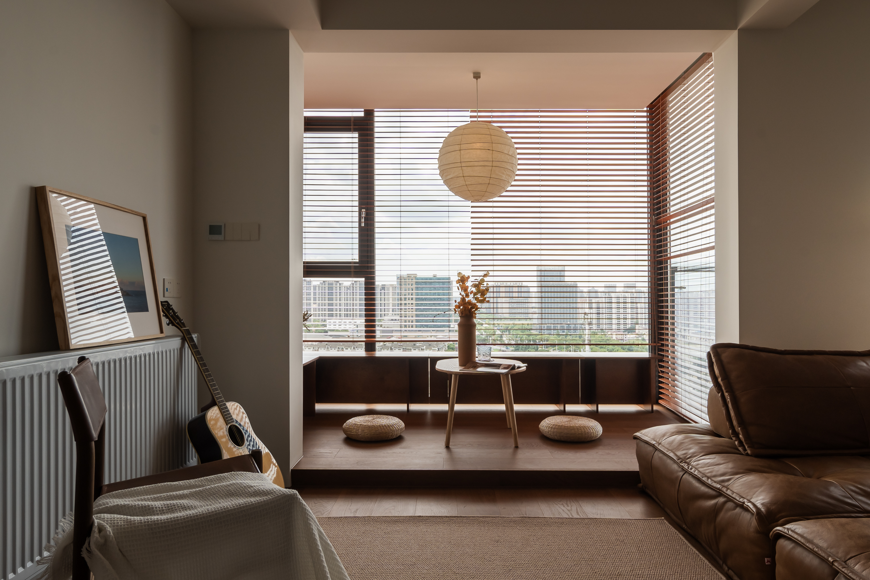 考虑到屋主的喜好以及生活的多样性,将部分阳台内扩并抬高,打造了一个休闲地台,不但在视野上让客厅空间得到了延申,也让生活形态得到了延续与完善。在这个空间里,夫妻俩可以一起看书、一边研究音乐,也可以一起喝茶,喝咖啡,还可以一起欣赏窗外的美景。