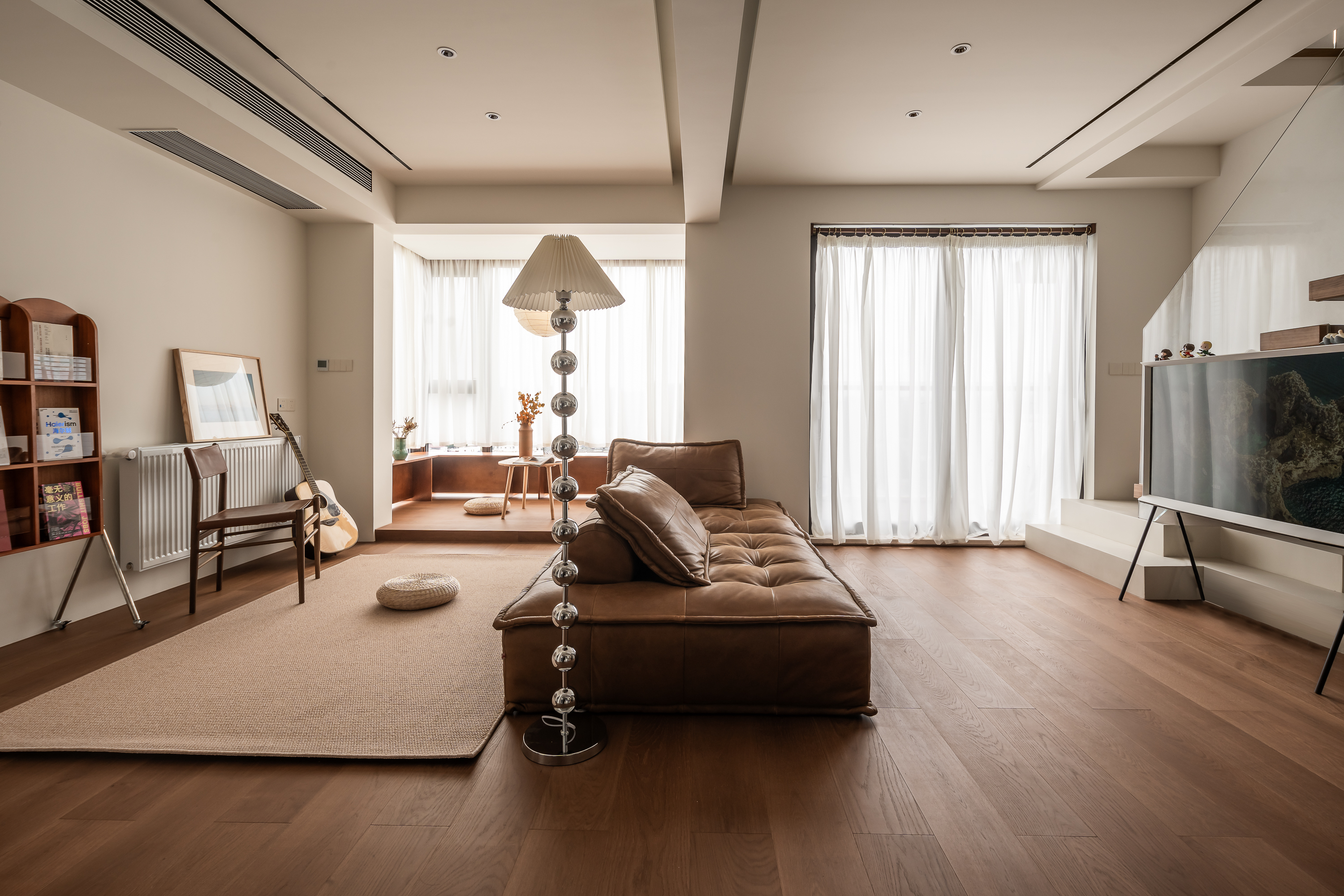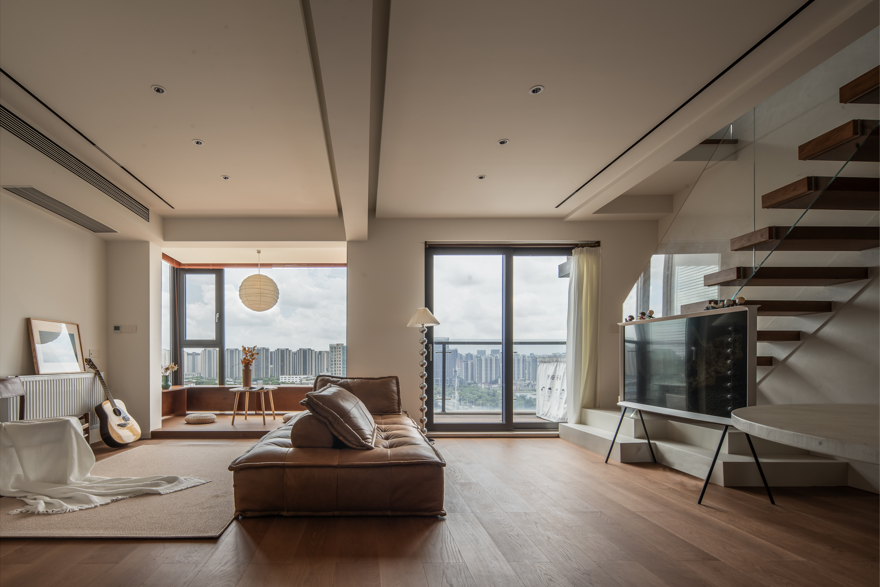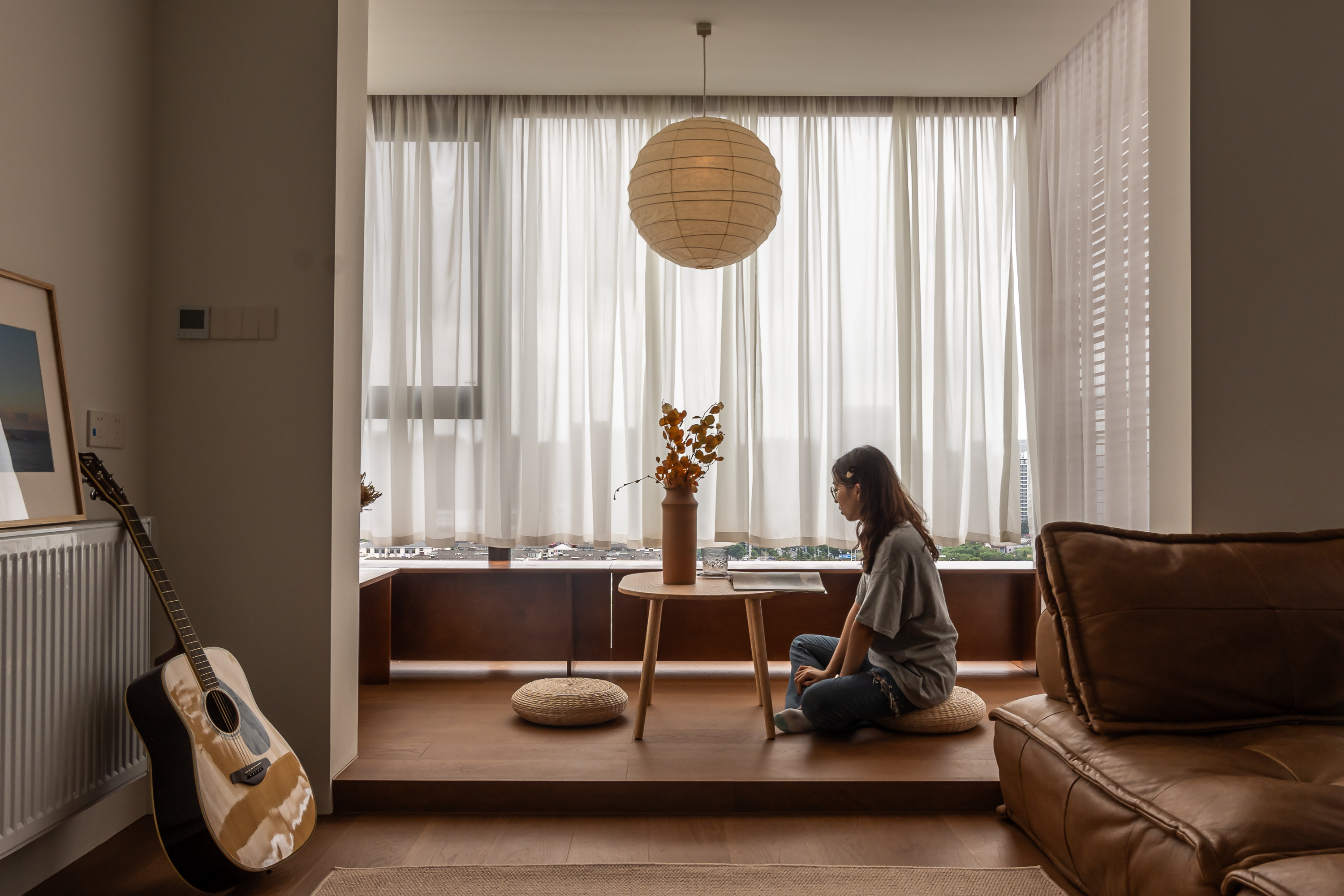 考虑到屋主的喜好以及生活的多样性,将部分阳台内扩并抬高,打造了一个休闲地台,不但在视野上让客厅空间得到了延申,也让生活形态得到了延续与完善。在这个空间里,夫妻俩可以一起看书、一边研究音乐,也可以一起喝茶,喝咖啡,还可以一起欣赏窗外的美景。