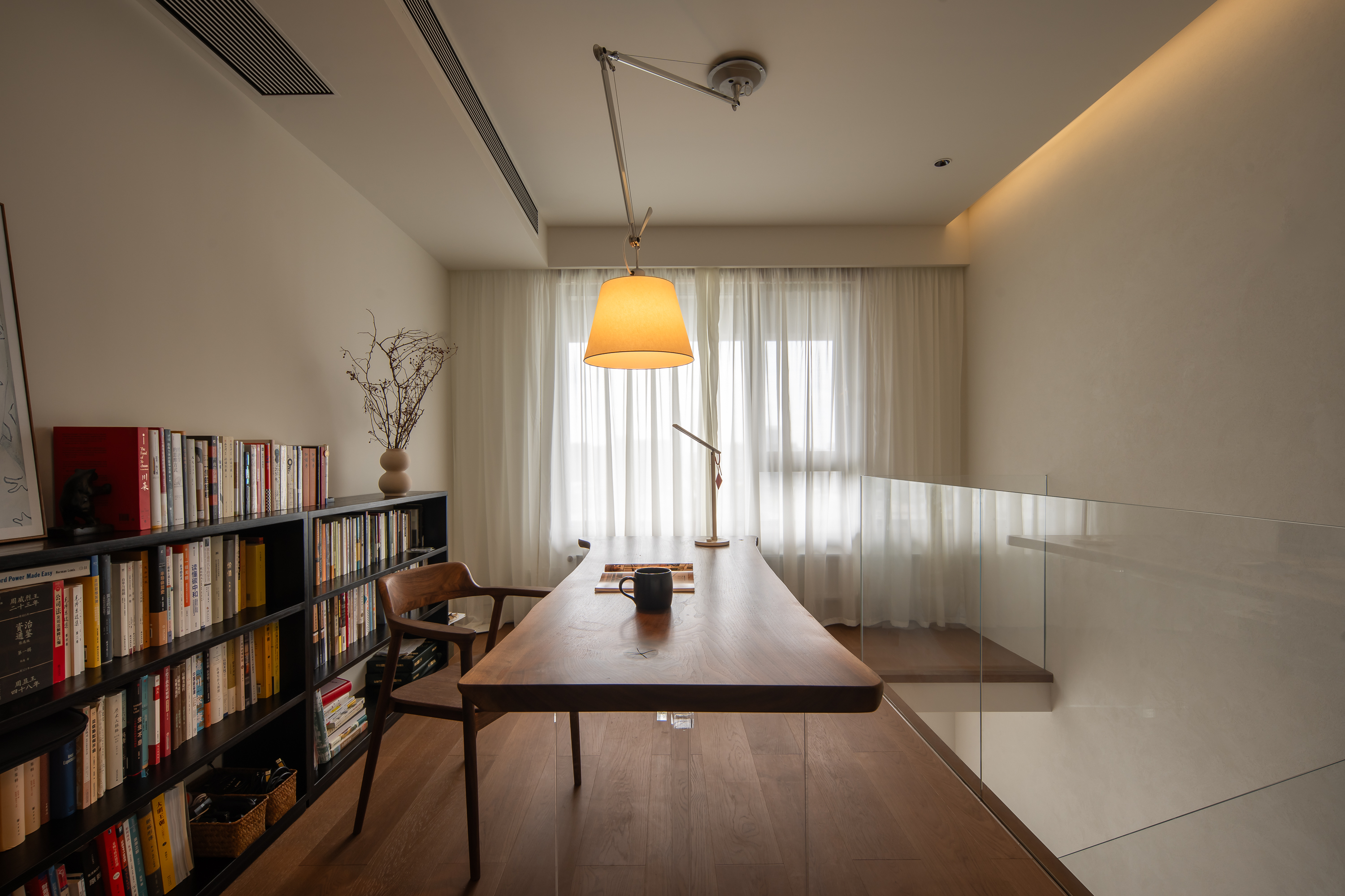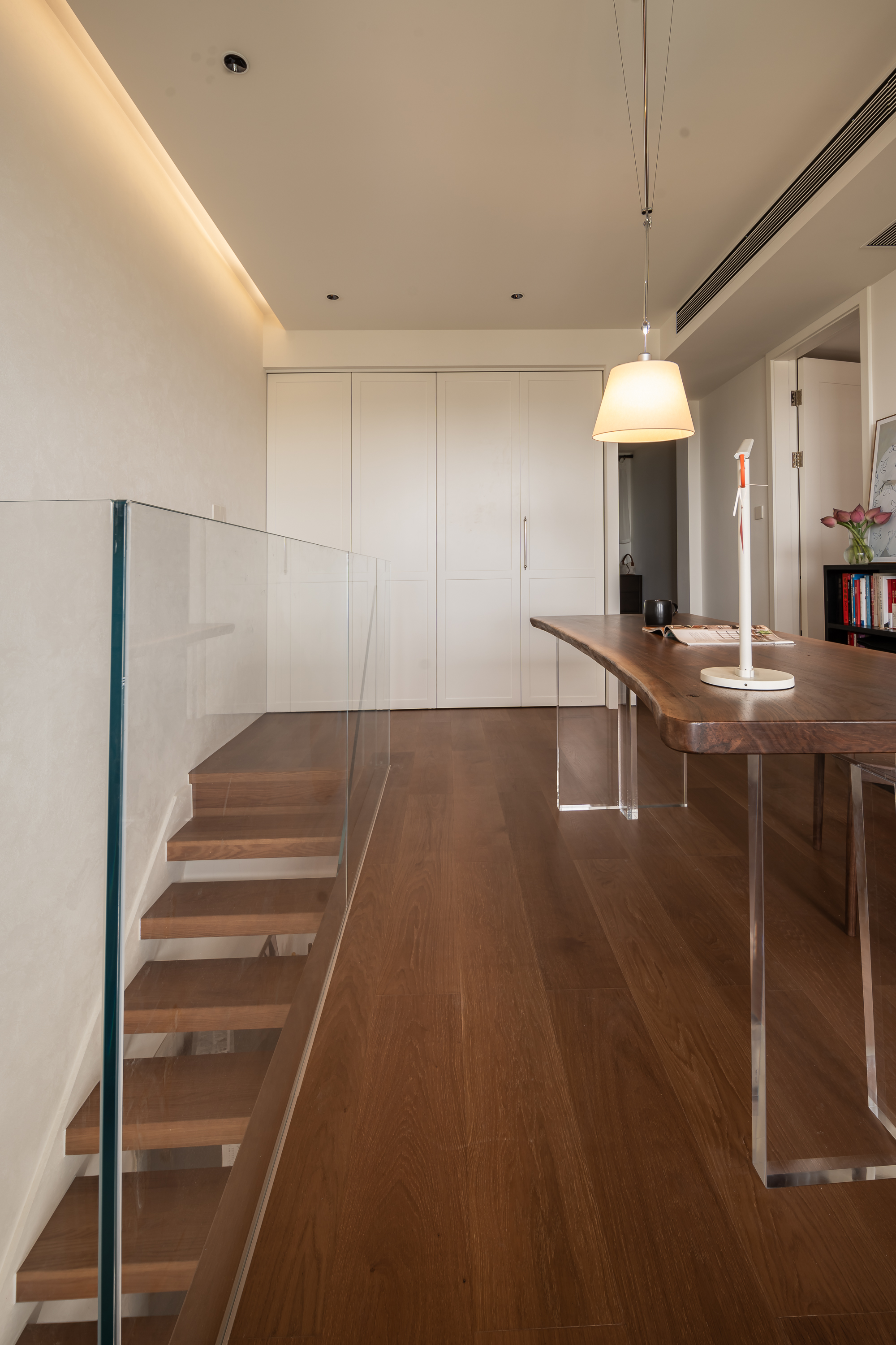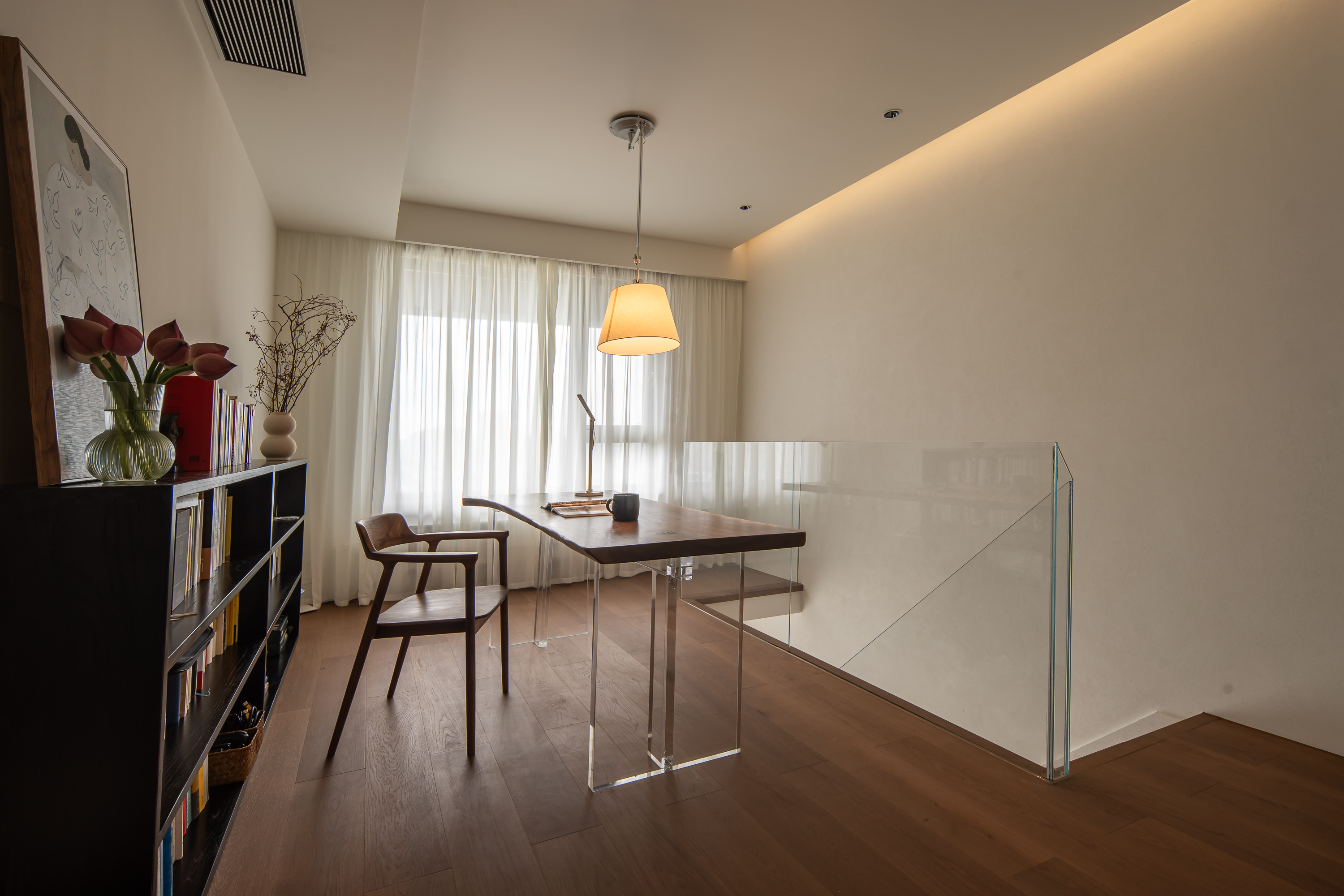 考虑到书房不足9平方以及长时间看书的视力疲劳,楼梯的扶手采用了透明玻璃,书桌采用了透明的亚克力树脂,尽可能地提高书房的空旷感,也让整个空间更通透、轻盈,视野开阔。