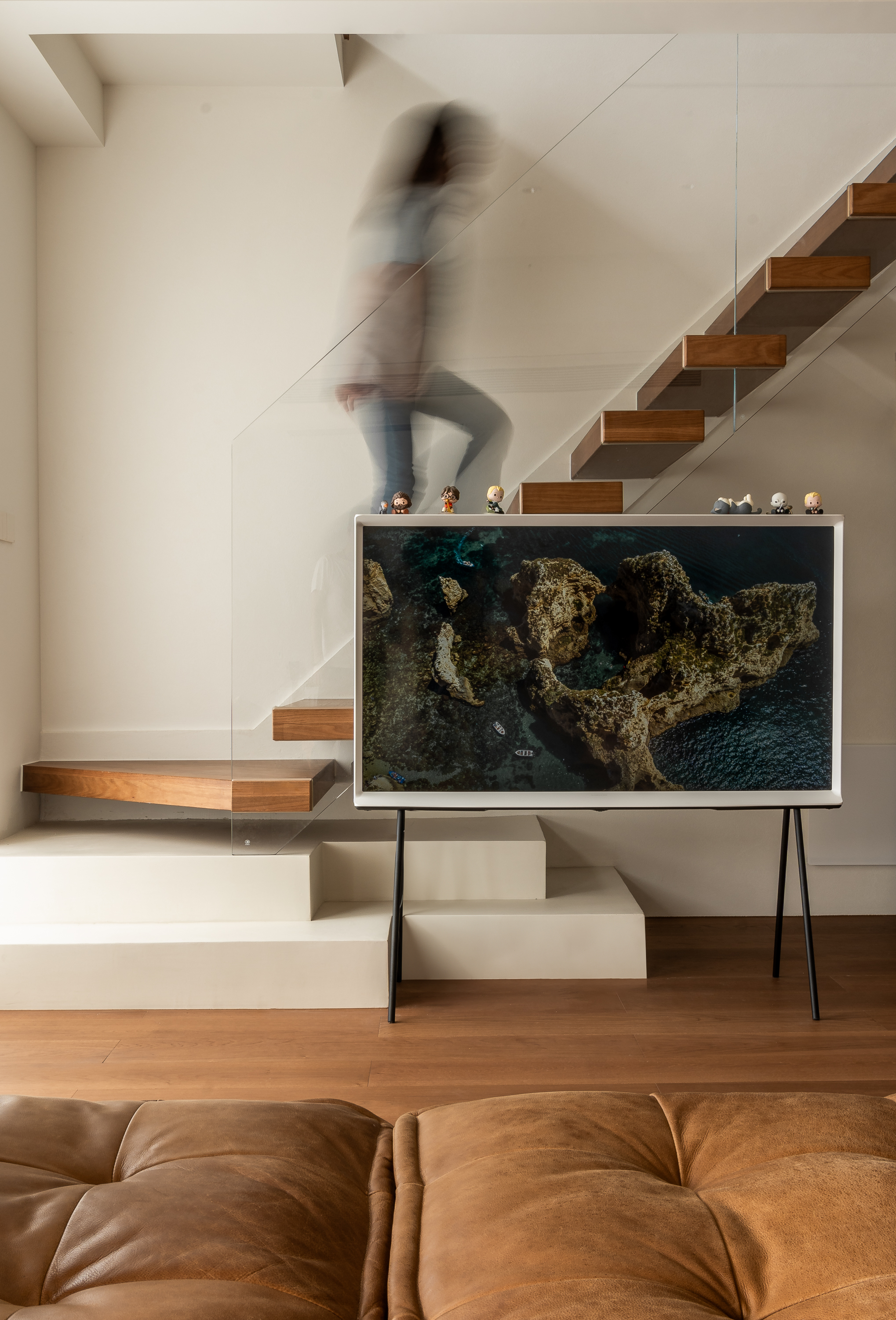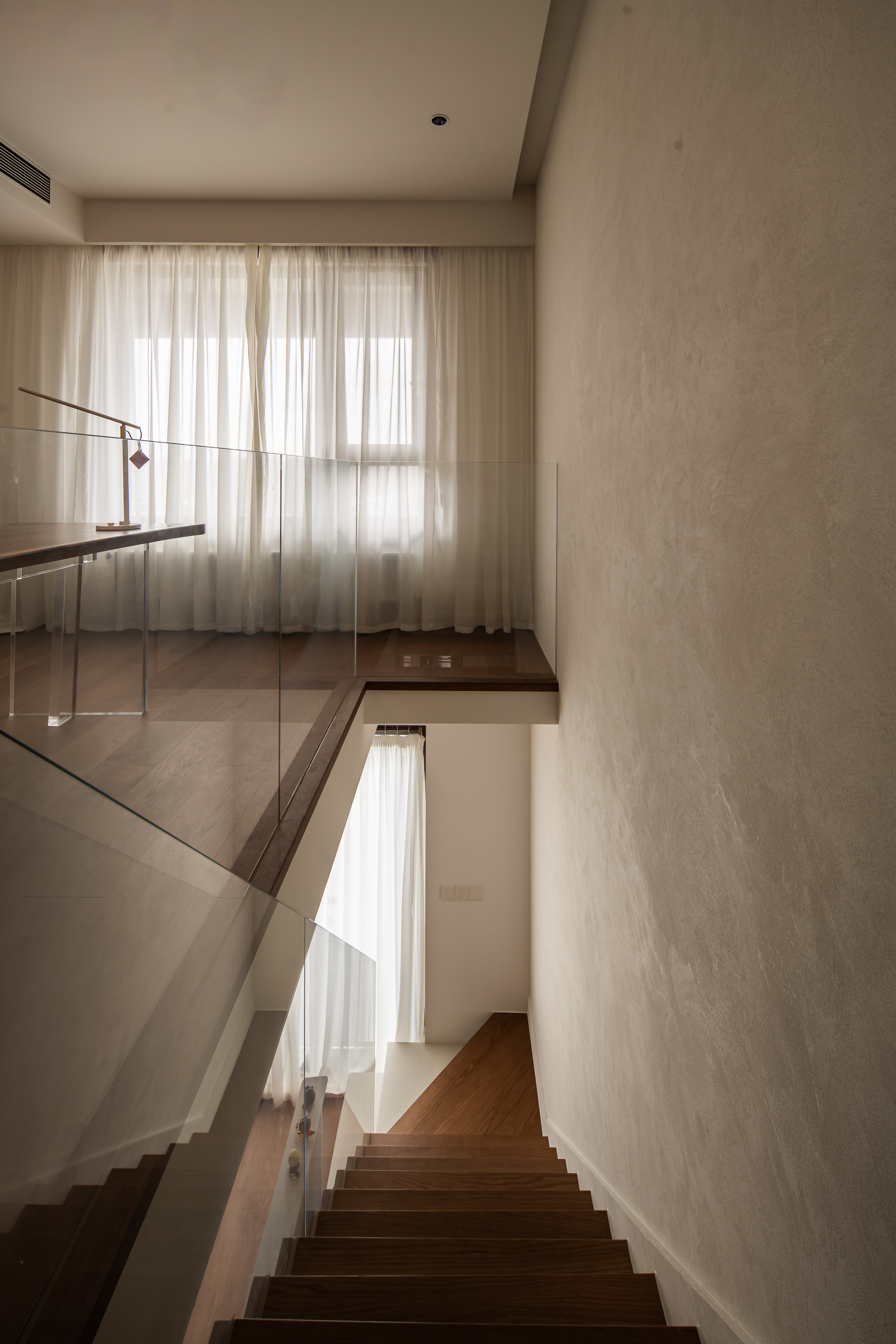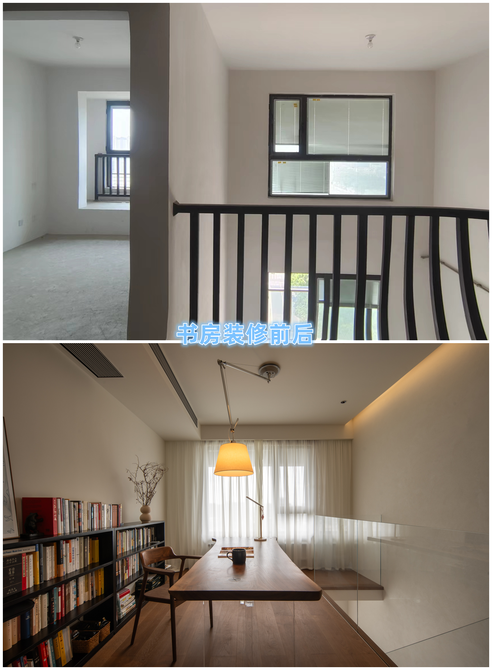 考虑到书房不足9平方以及长时间看书的视力疲劳,楼梯的扶手采用了透明玻璃,书桌采用了透明的亚克力树脂,尽可能地提高书房的空旷感,也让整个空间更通透、轻盈,视野开阔。