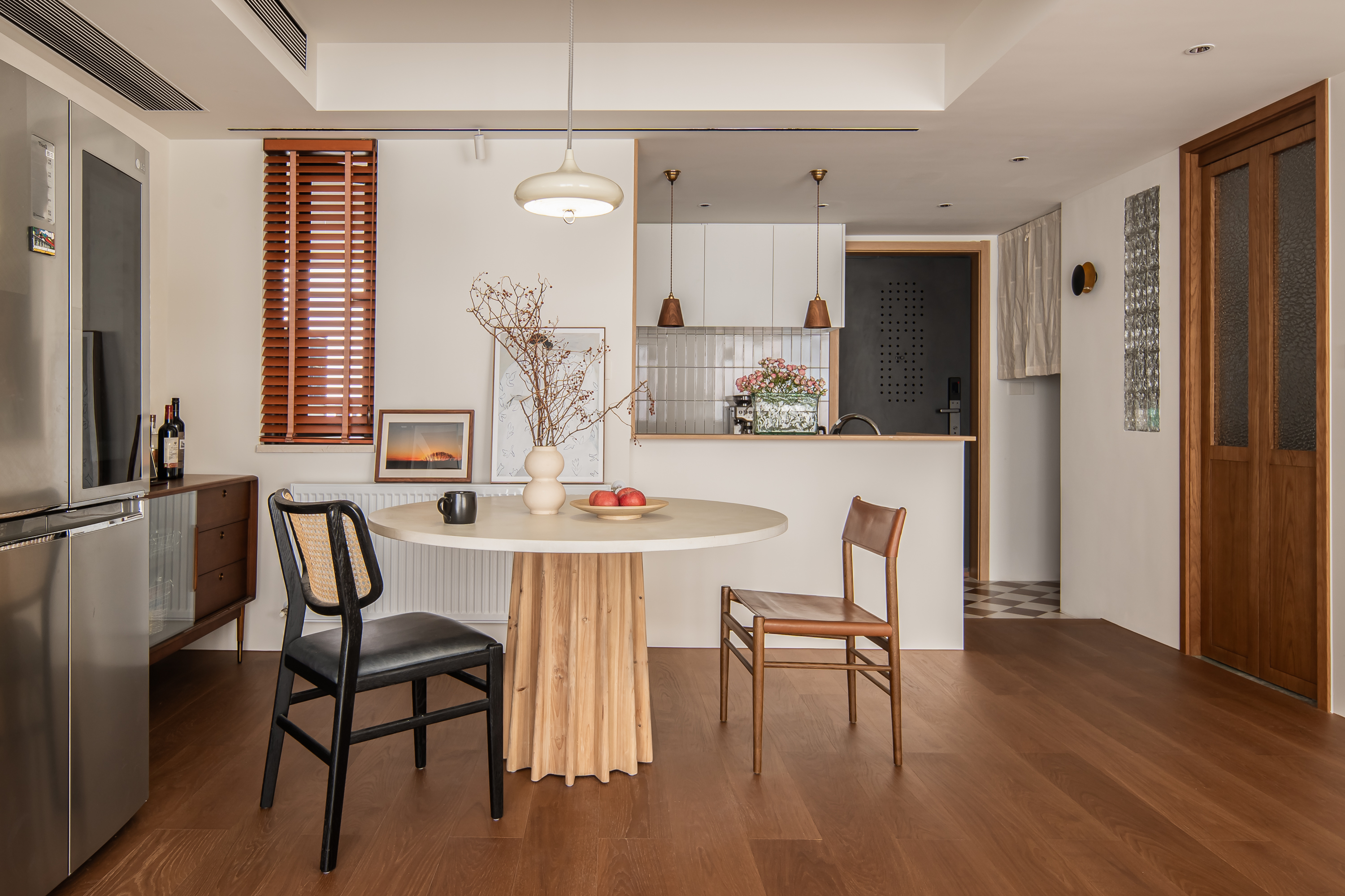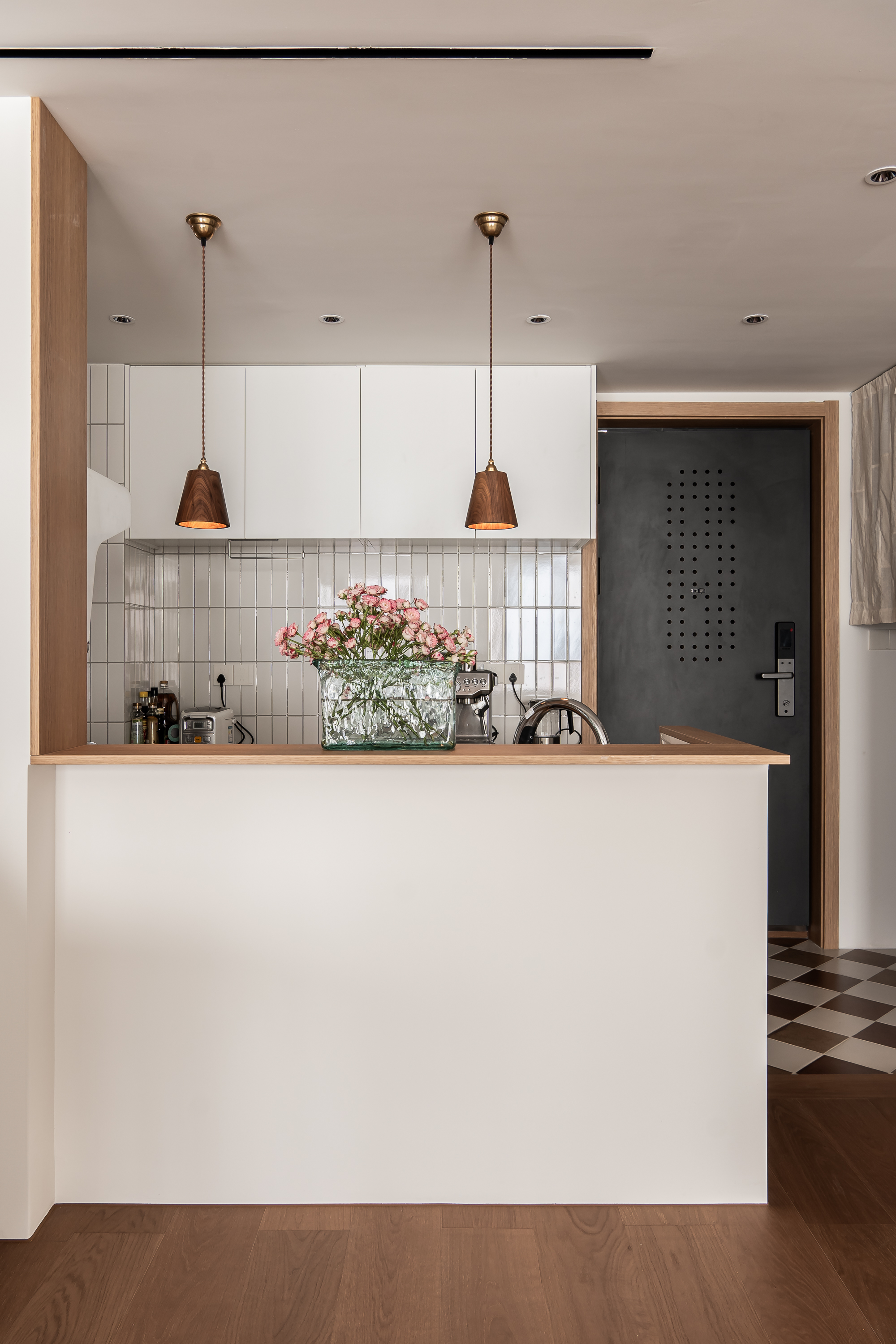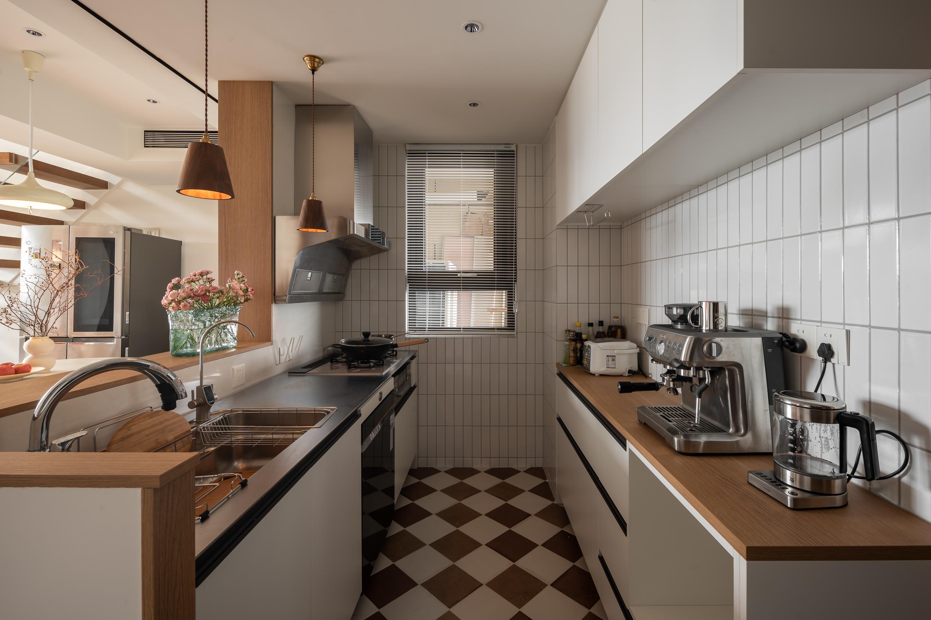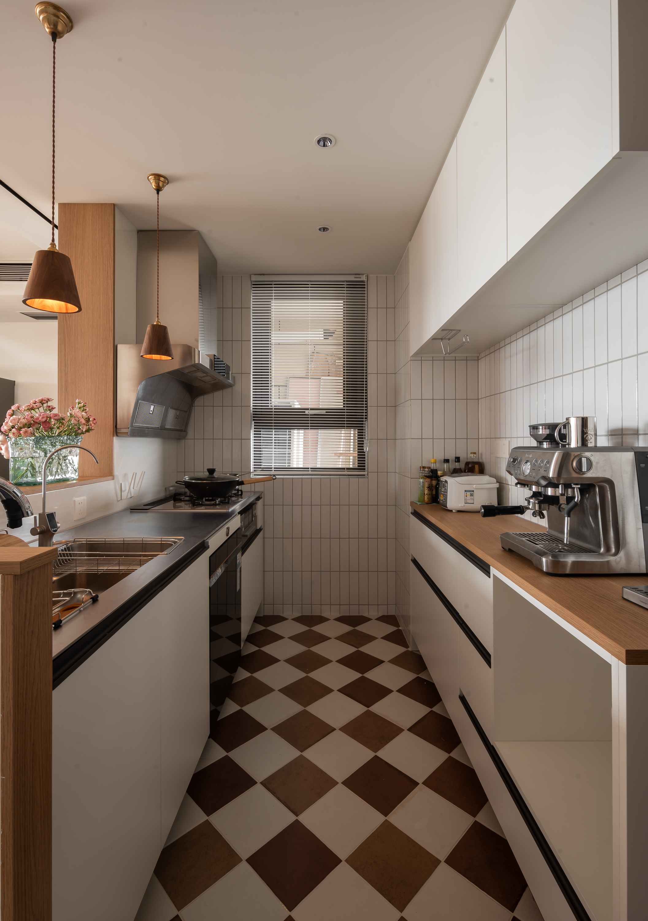 考察到晚间做饭或研磨咖啡时对光线要求比较高,厨房选用复古小吊灯加强光线,复古小吊灯与小花砖相呼应,瞬间提升了整个空间的复古调性。