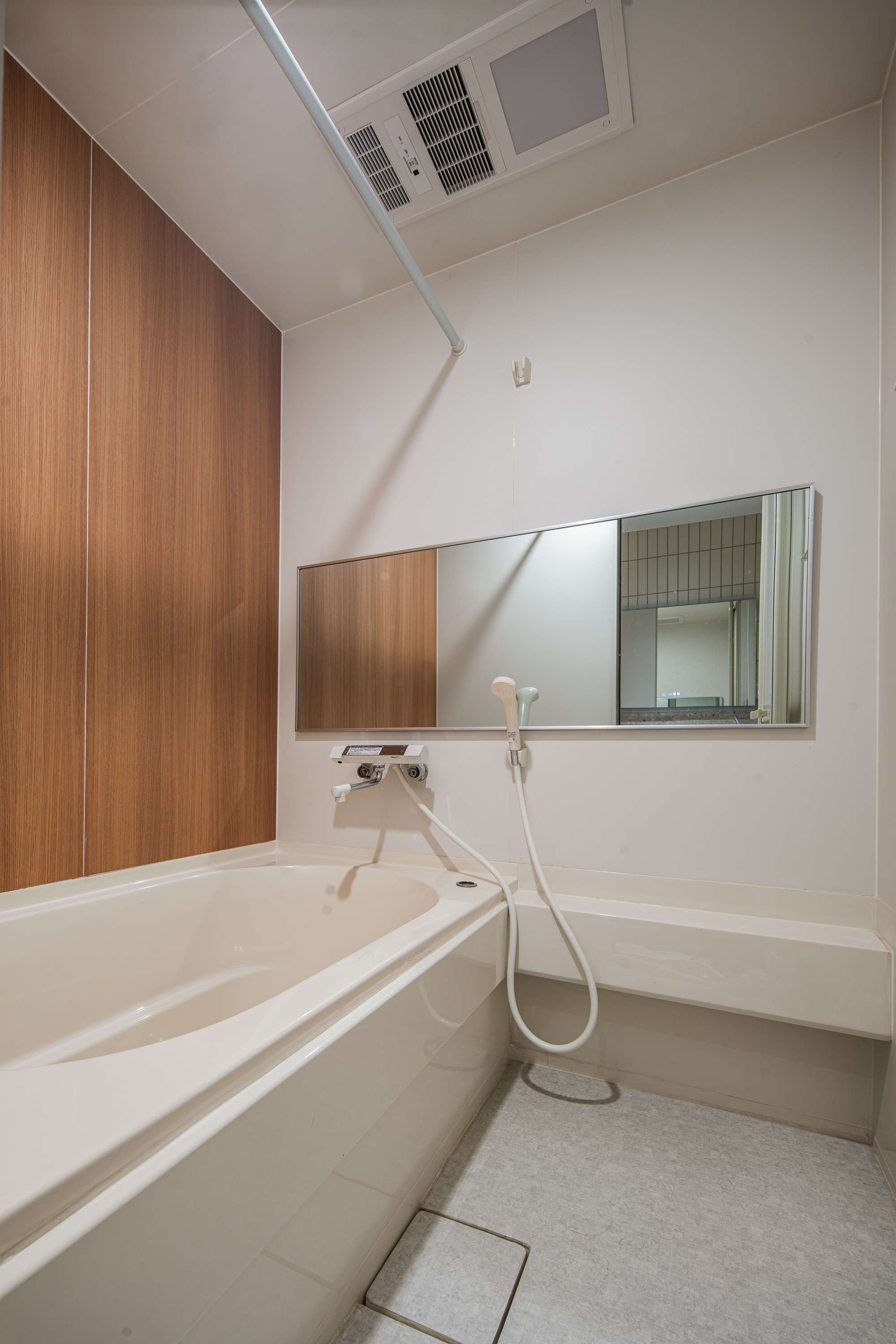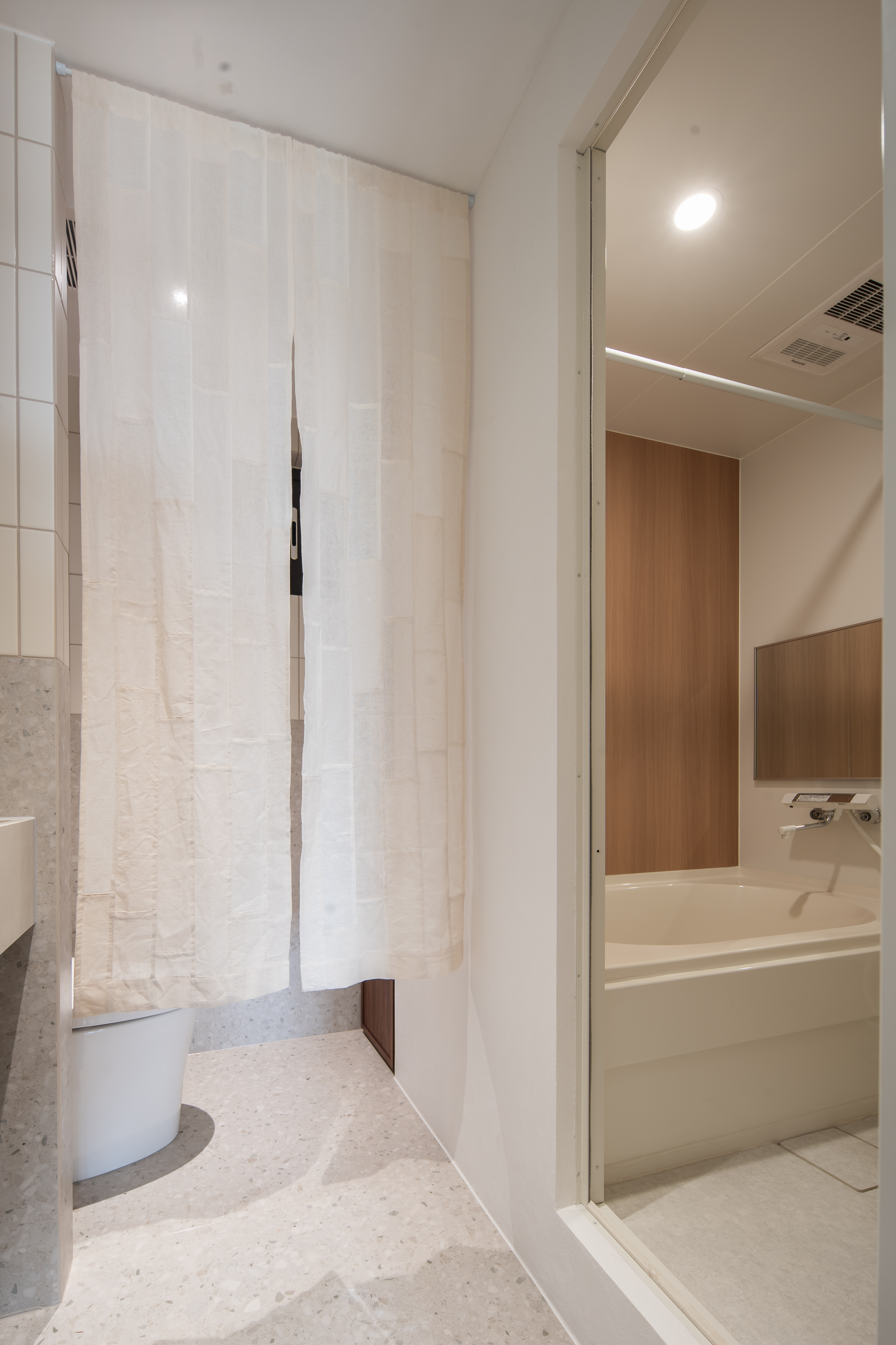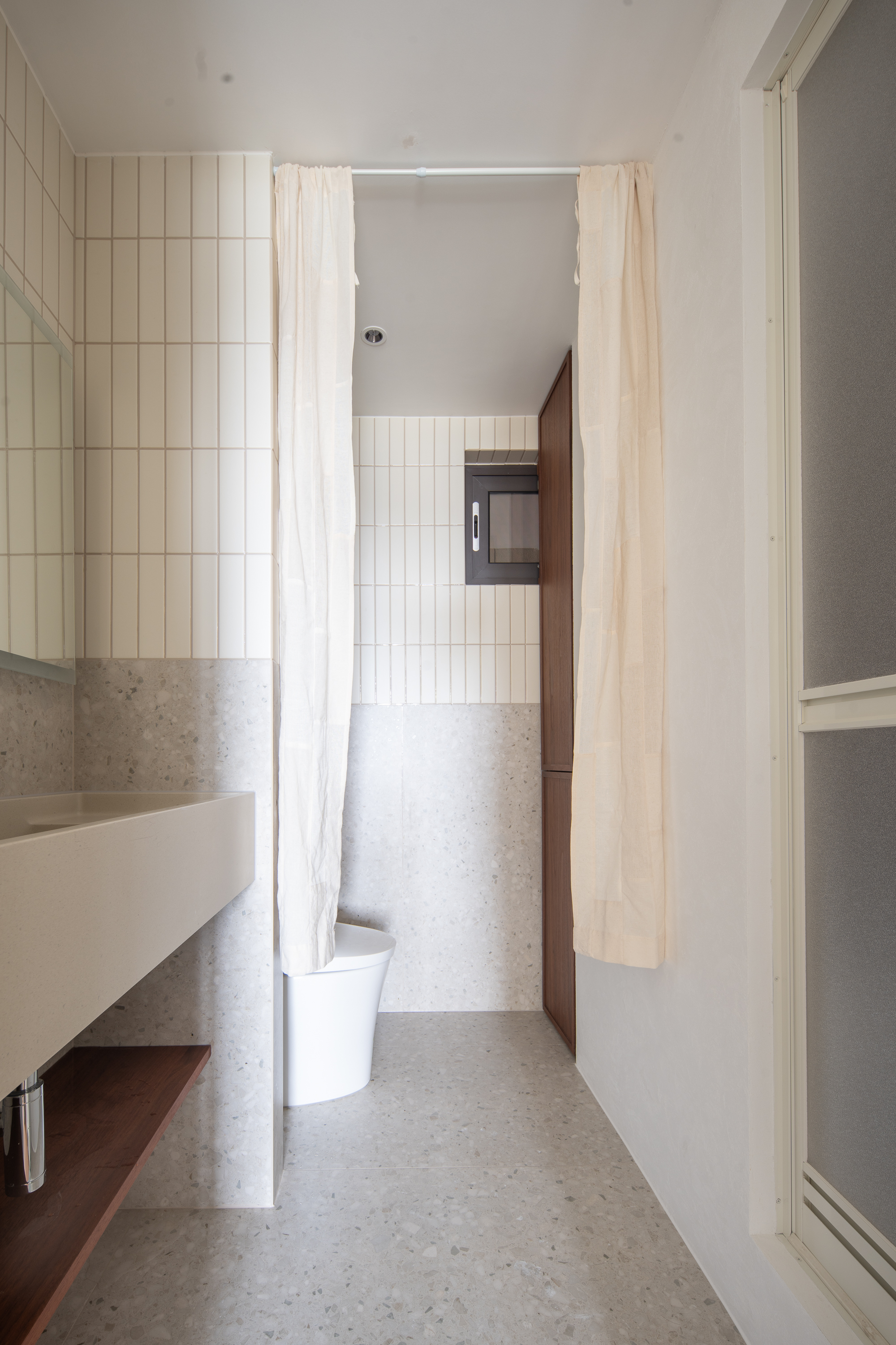 卫生间采用干湿分离,各个区域相互独立,互不干扰。考虑到卫生间空间比较小,布帘取代了常规隔断方式,轻盈也不占用空间,整个空间弥漫清新、放松的气息。
