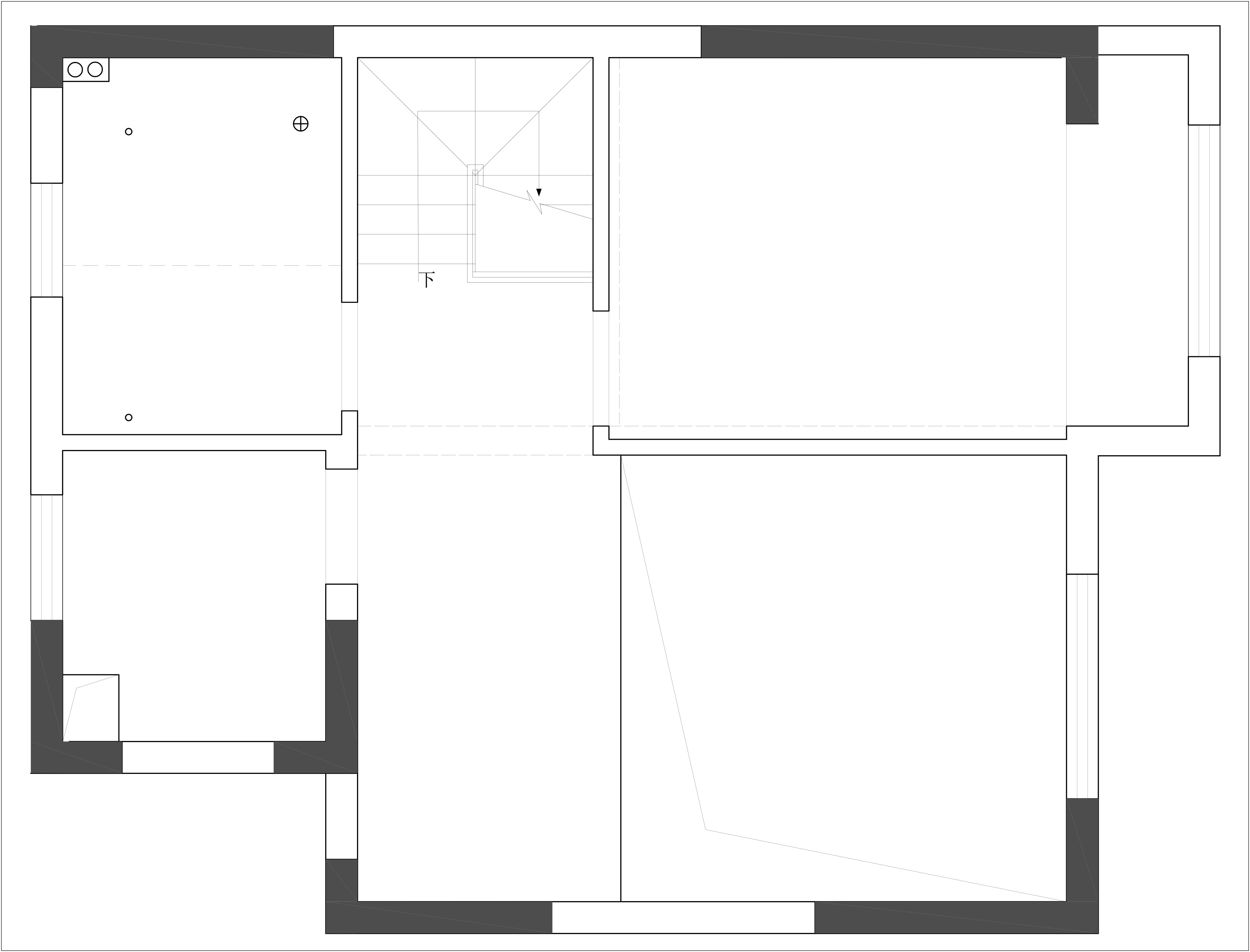 二楼原始图: 1.楼梯和客厅两处挑空,空间浪费比较大,将空间切割比较零碎。 2.布局不太合理,卧室和洗手间分别位于楼梯的两侧,生活动线不便利。