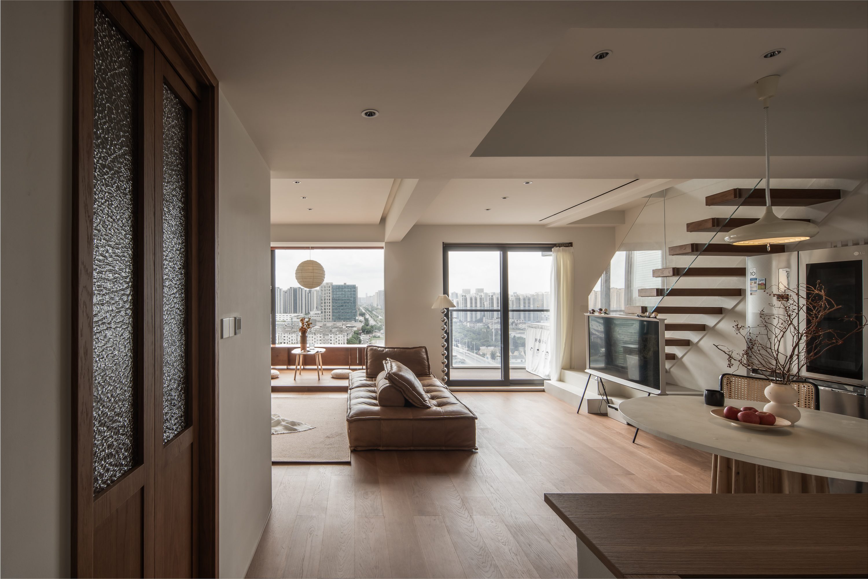 在这个空间里,设计师巧妙的采用了极简设计的思路,弱化空间内部的界限,屋主可根据自己的喜好与需求自由划分空间区域。