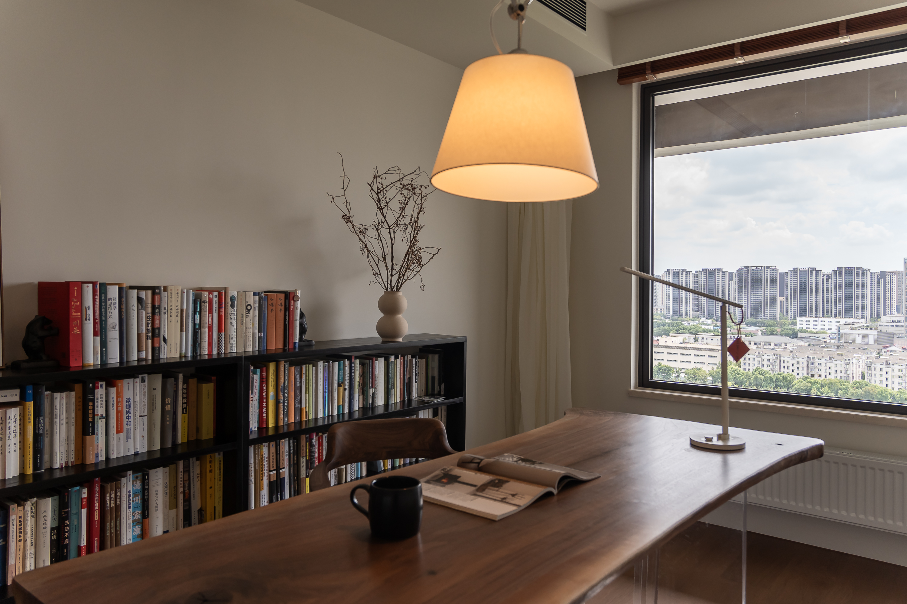 书房是将原来的挑高区域浇筑而成,墙体的艺术漆搭配中古风的开放式书柜,既满足了观赏需求,又兼具实用性,艺术元素的融入为空间注入了深厚的文化底蕴和艺术魅力,通过精巧的设计和搭配,从而展现出了中古风独特的优雅和浪漫。