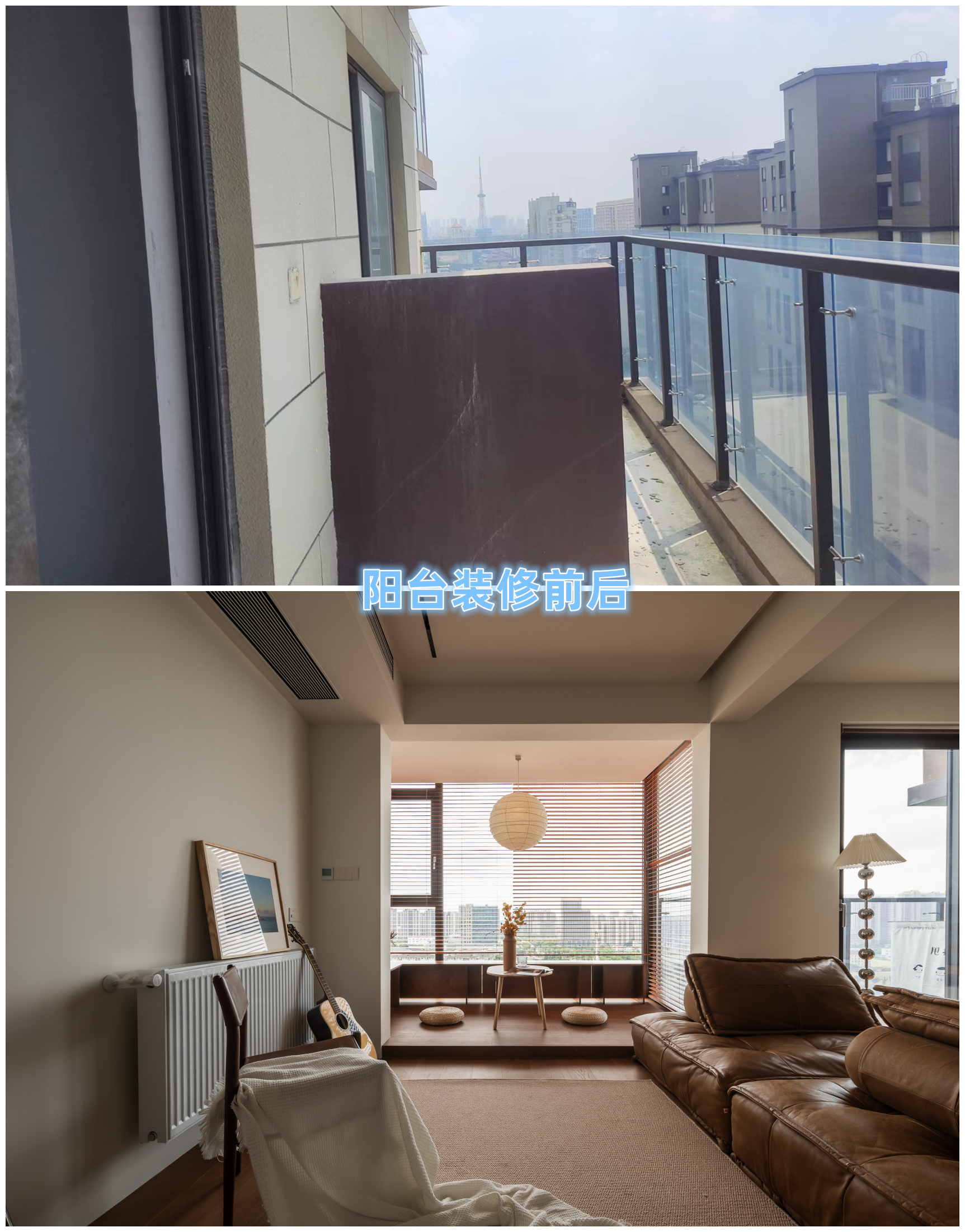 Part 2,连接卧室的阳台内扩,抬高打造成了休闲地台,用于平时看书、喝茶等。另外一半未封闭,主要用于后续养花和休闲;
