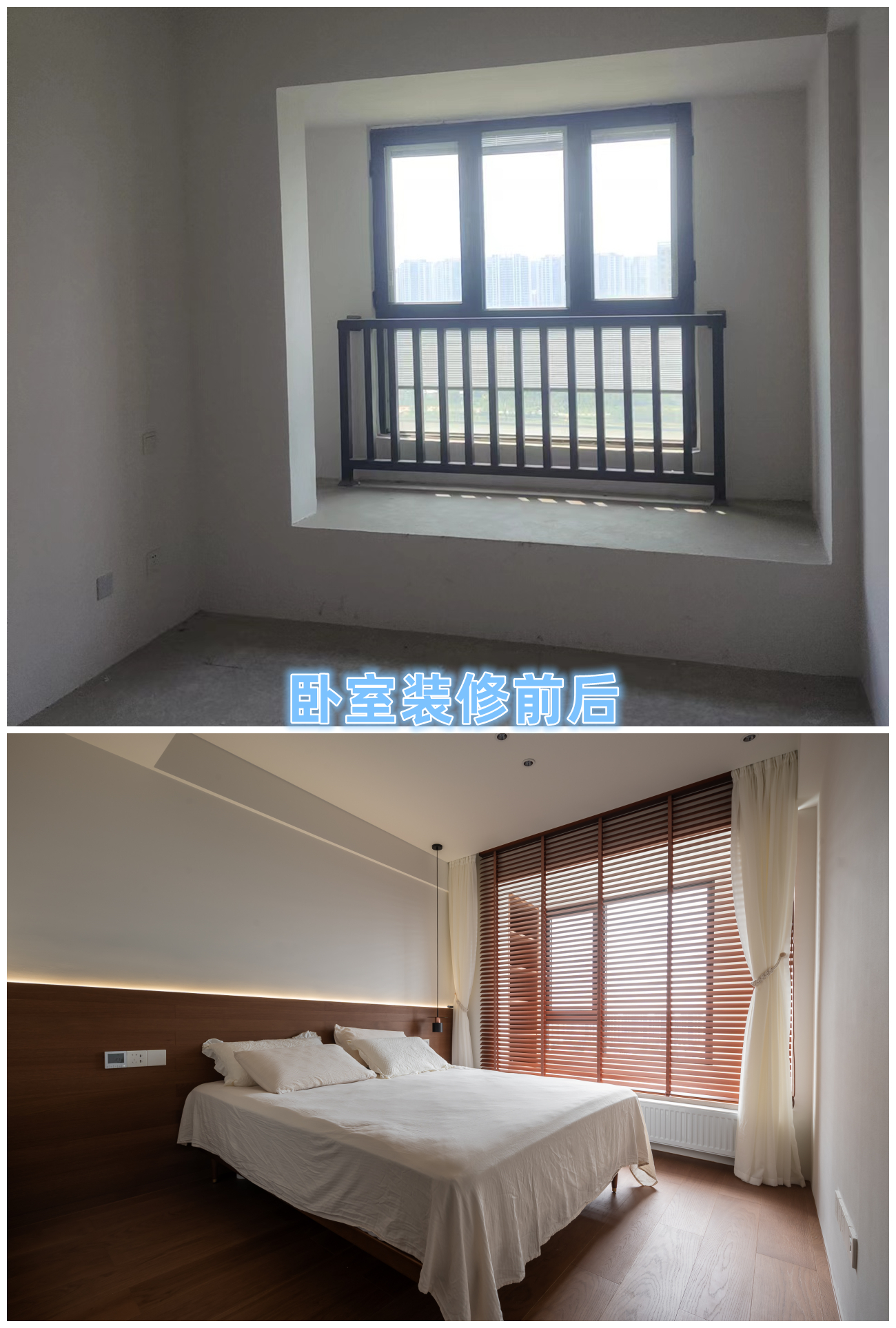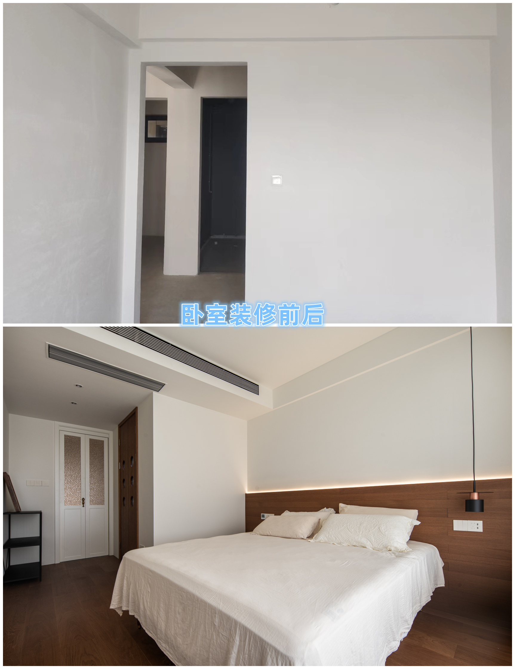 卧室装修前后对比图 原来的楼梯间位于房子中央,将二楼的空间切割的比较凌乱,动线也不太合理。空间重构后,设计师调整卧室门洞的方向,将楼梯间调整成衣帽间,打造成了一个包含卧室、衣帽间以及卫生间的卧室套间。
