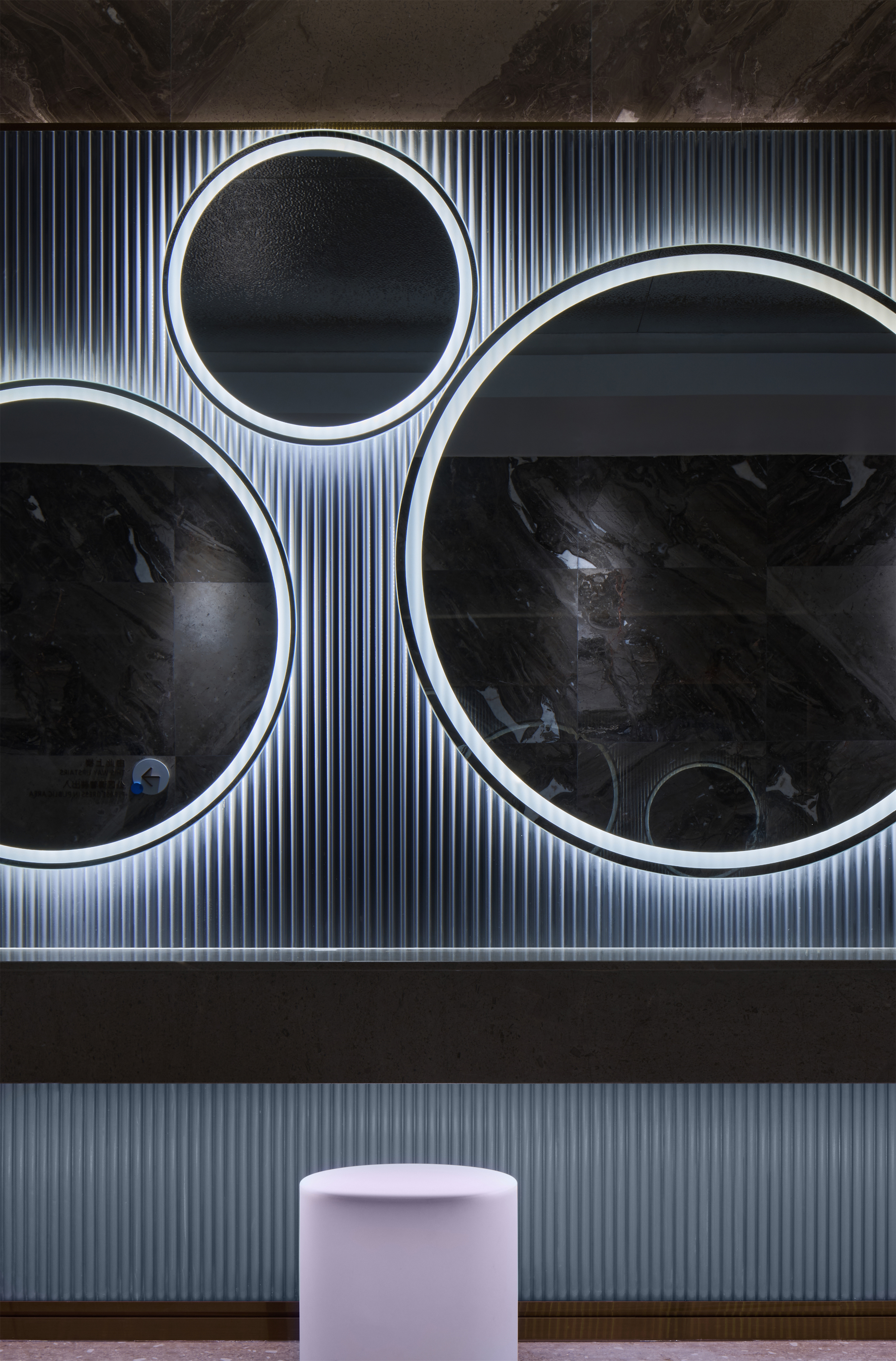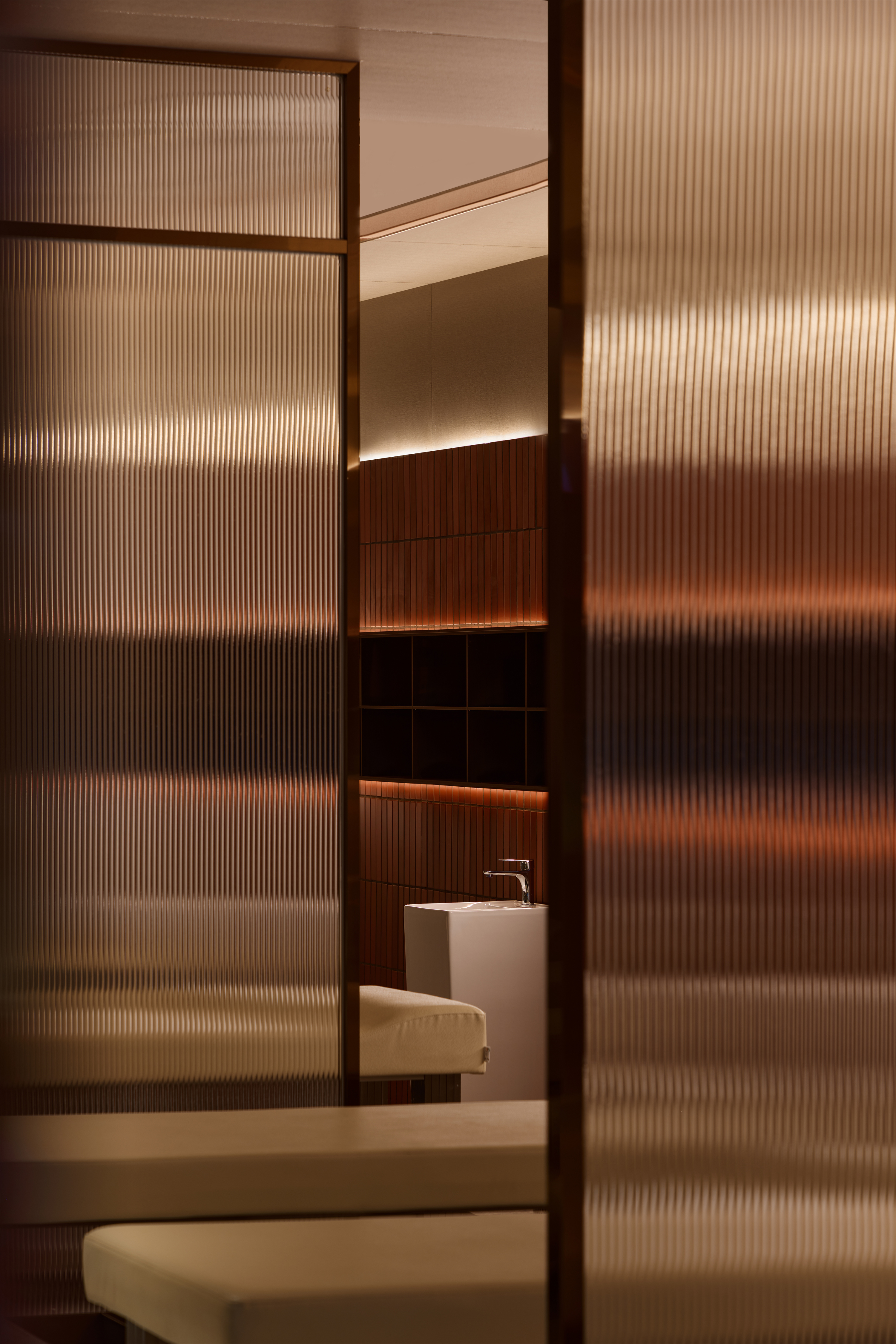 空间的艺术美学被均质而细腻地体现在每一处细节之中,打破空间限制,赋予水浴空间更多可能。灯光之下的玻璃砖墙在闪闪发光,似阳光之下波光粼粼的海面一般,反射整个空间温柔的底色。