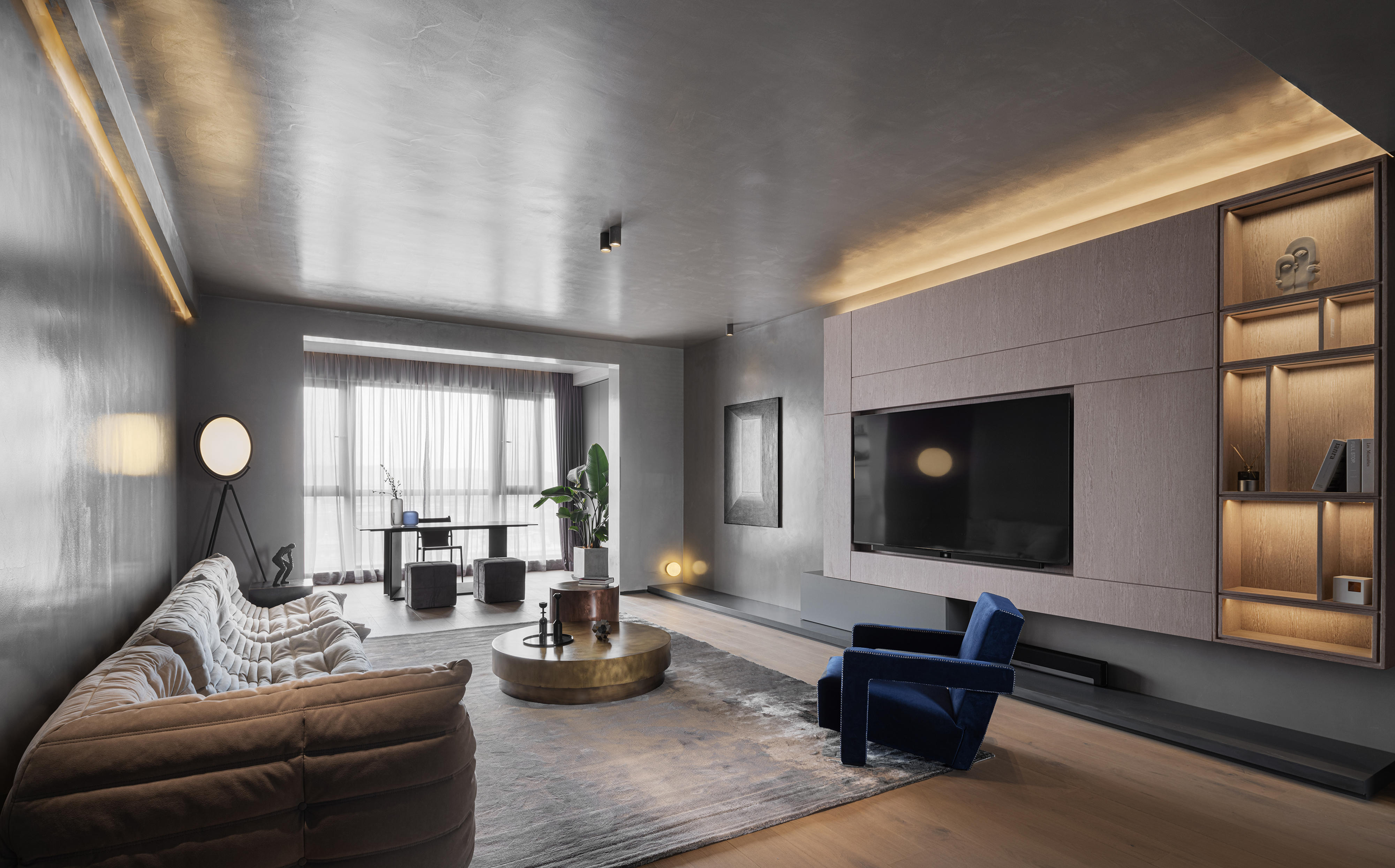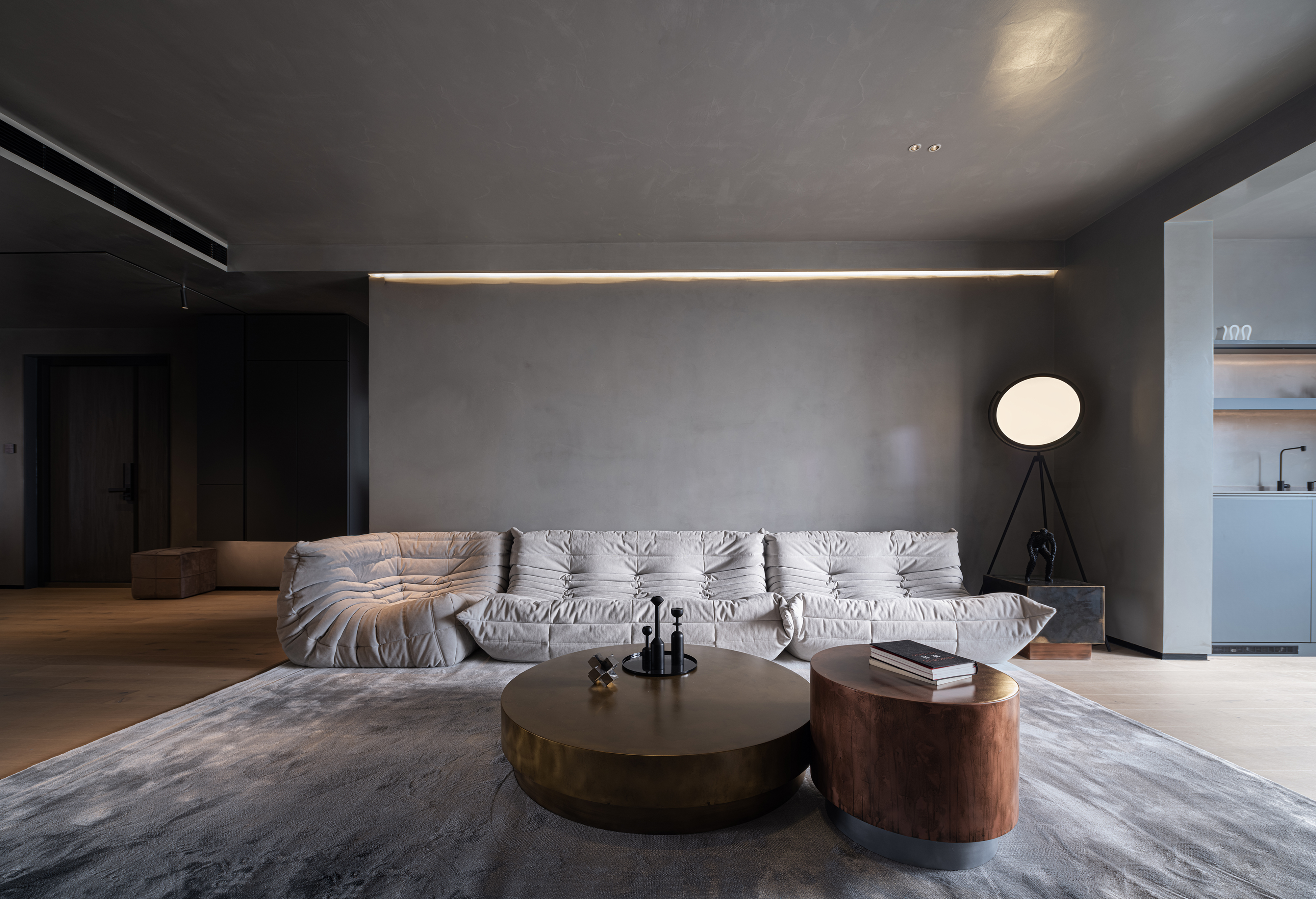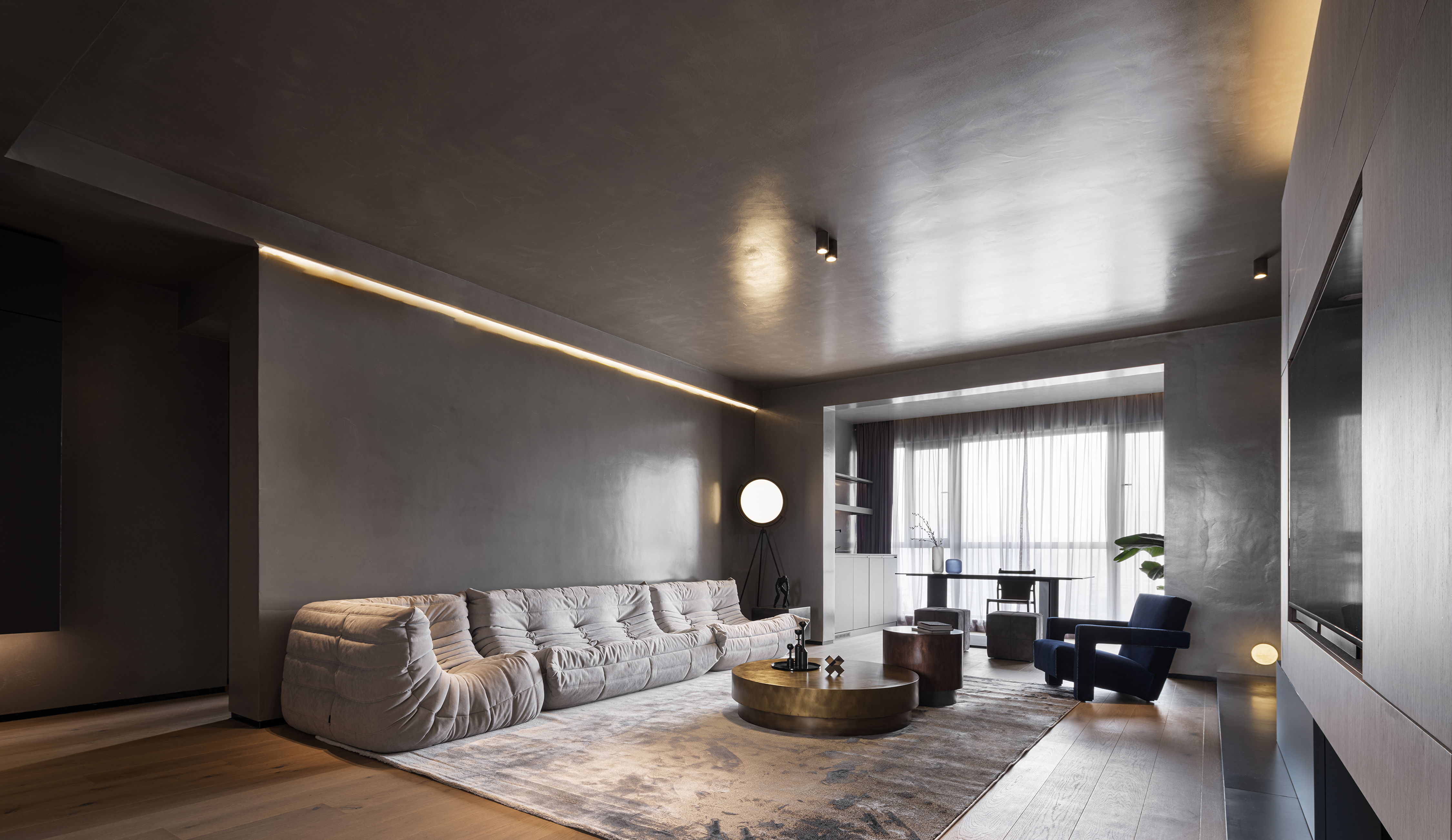 项目定位:整体水泥灰质感的空间,充满了个性年轻的氛围,客厅水泥质感的天花和明装的水泥射灯,营造了原始粗犷的简约空间氛围,搭配米色沙发与原木色电视墙,呈现出一个静雅有气质的空间。
