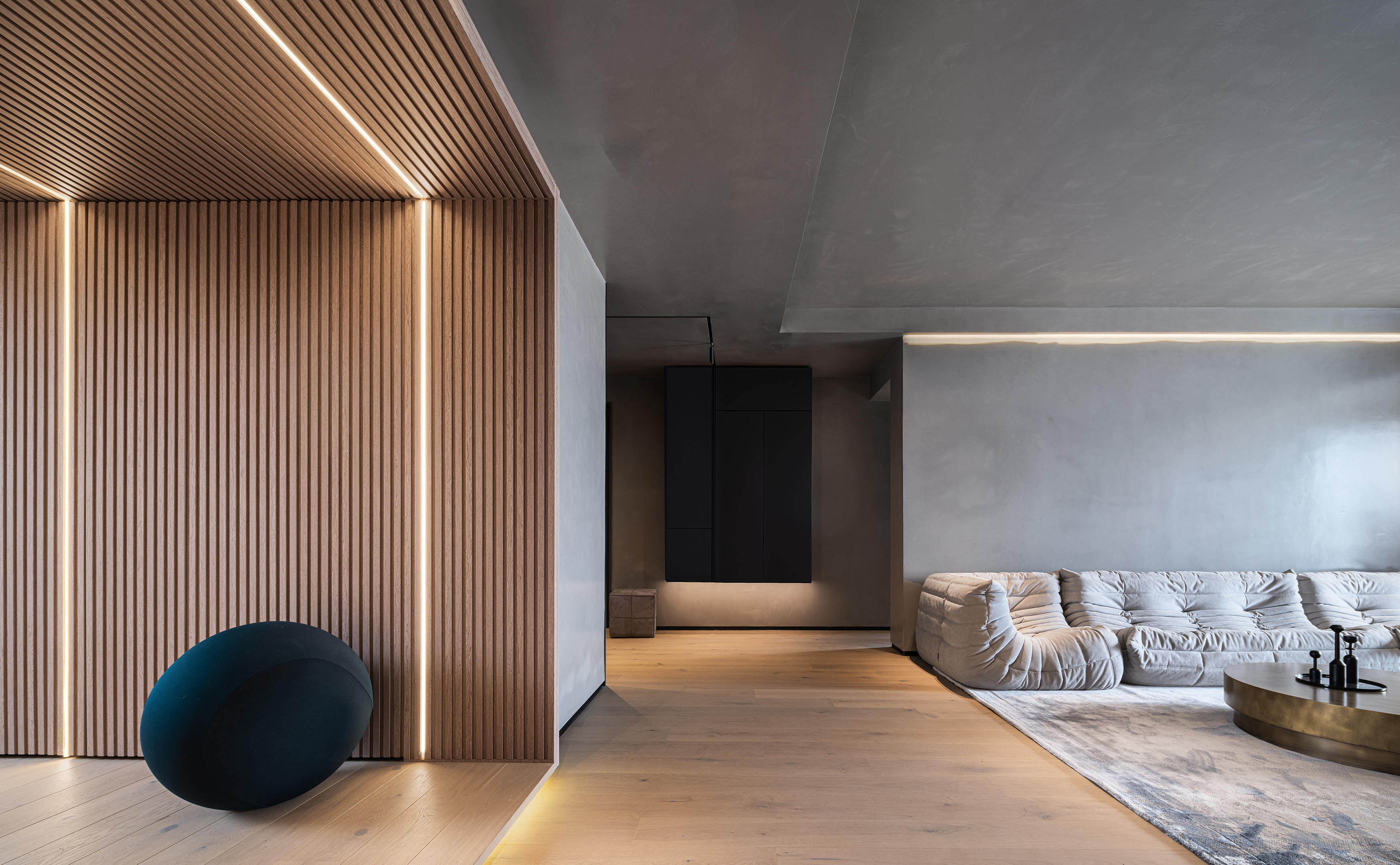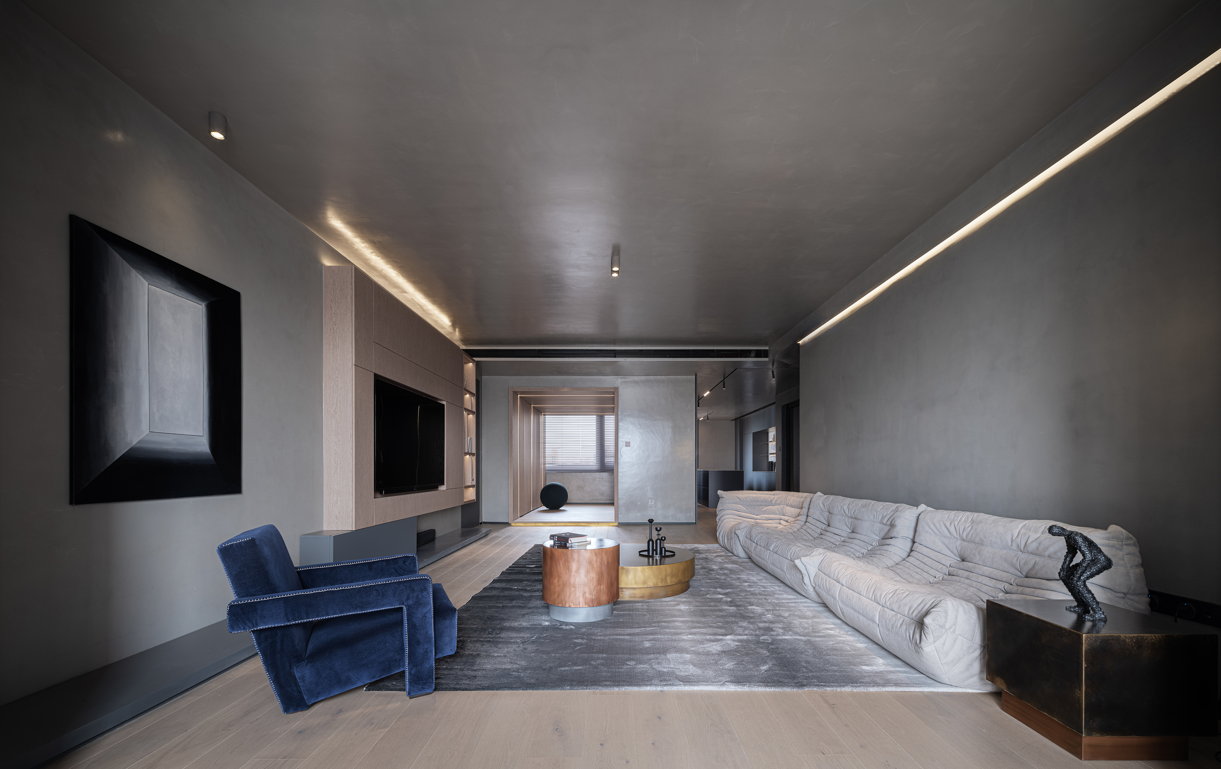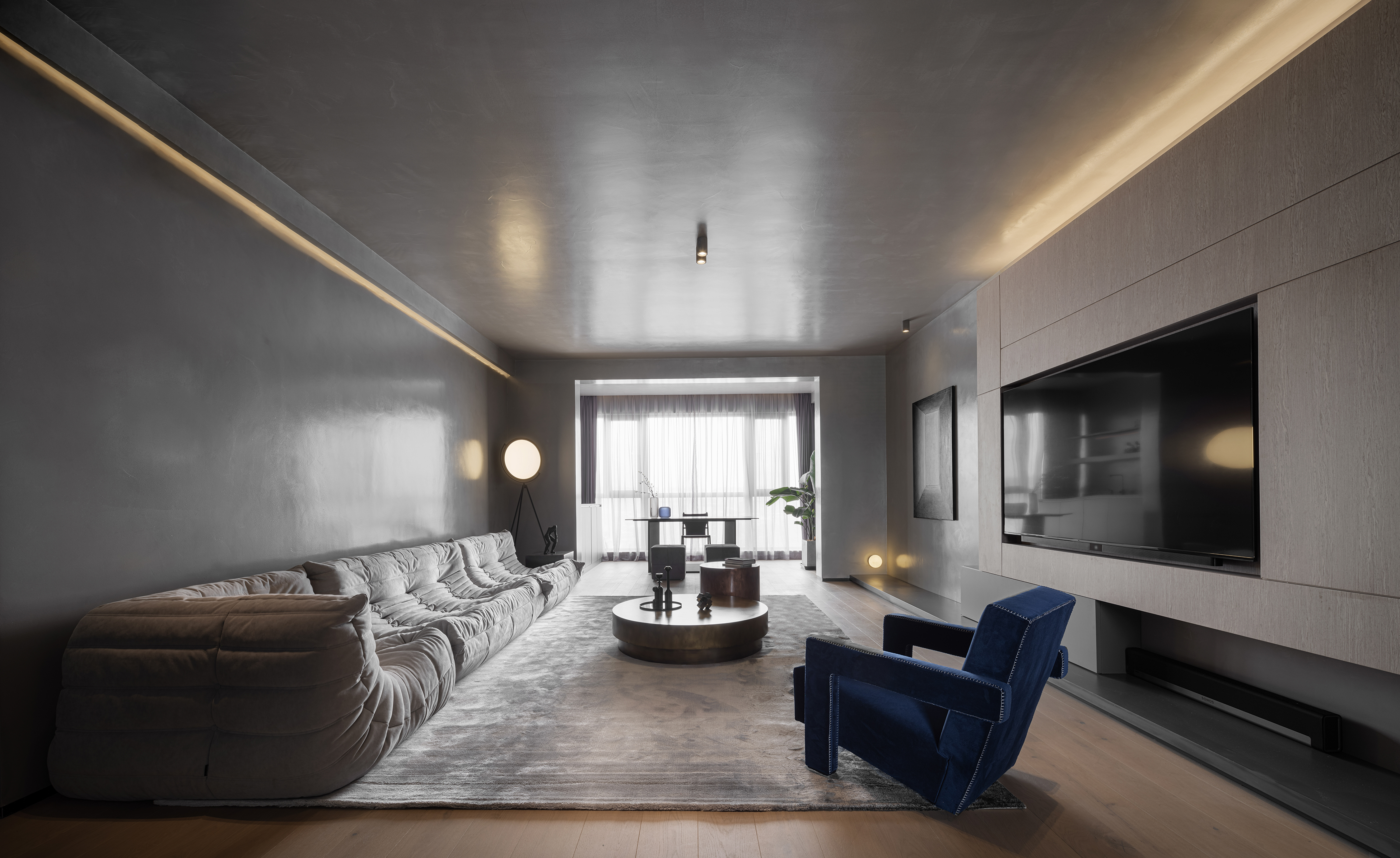 项目定位:整体水泥灰质感的空间,充满了个性年轻的氛围,客厅水泥质感的天花和明装的水泥射灯,营造了原始粗犷的简约空间氛围,搭配米色沙发与原木色电视墙,呈现出一个静雅有气质的空间。