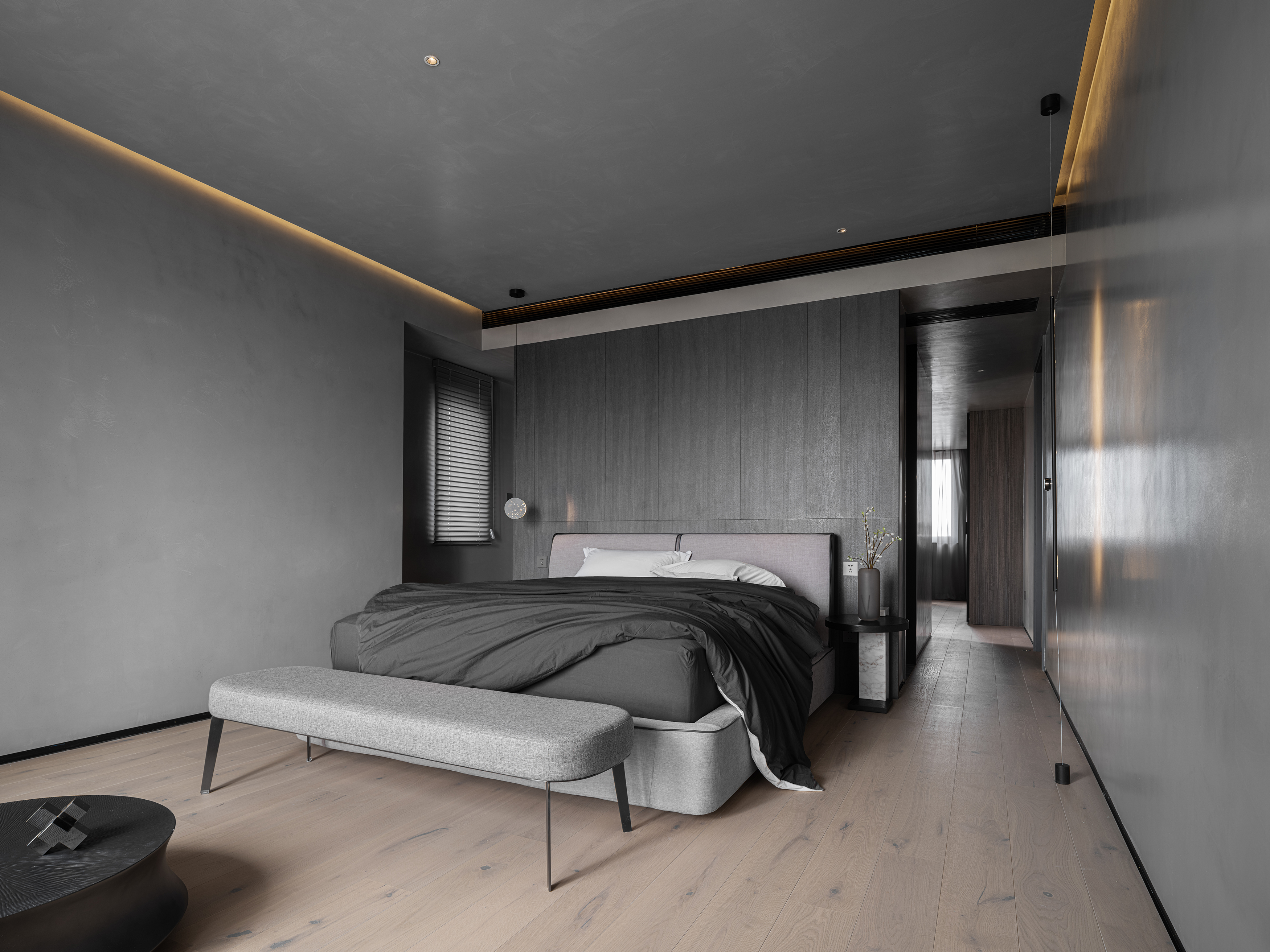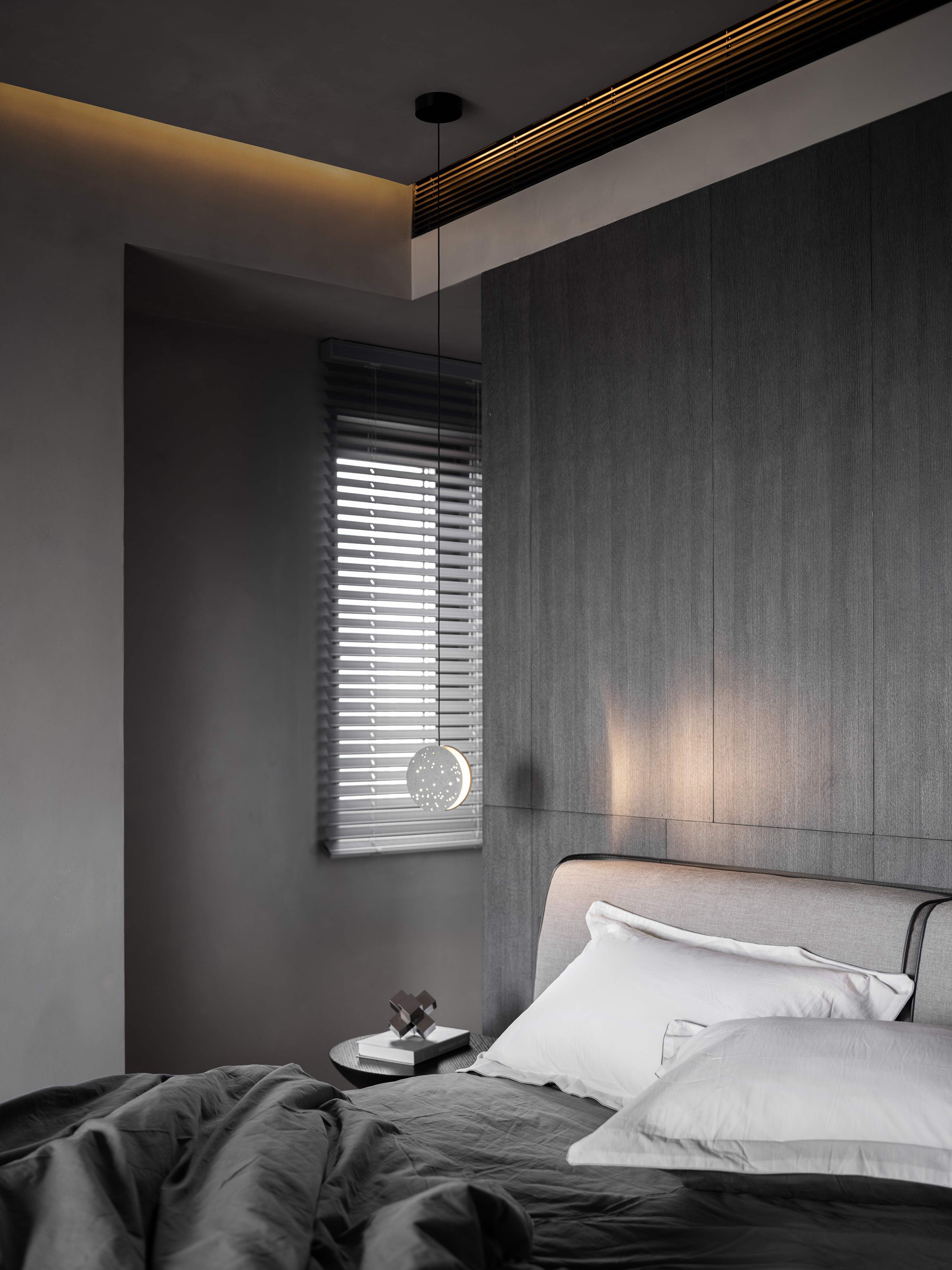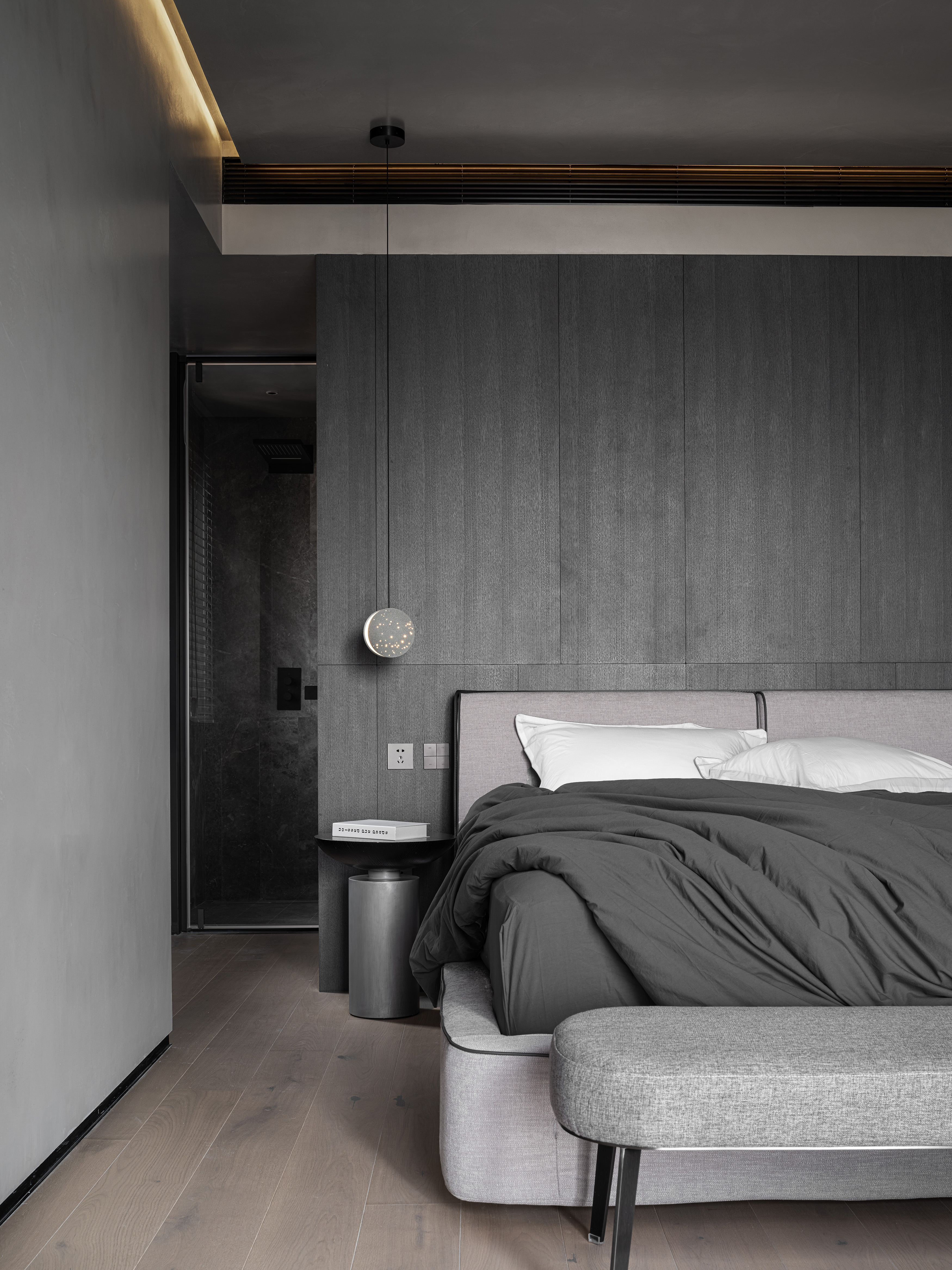 空间布局:设计师通过对动线的重新划分,开阔了空间的固有尺度。卧室深色调的安全感、包容感、柔软感、温暖感、有序感,不仅对人的感官及精神产生影响,而且可以表达出情感,这是种质朴看似简单,实则比金碧辉煌更具艺术效果。
