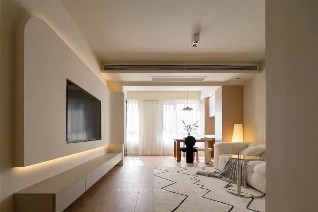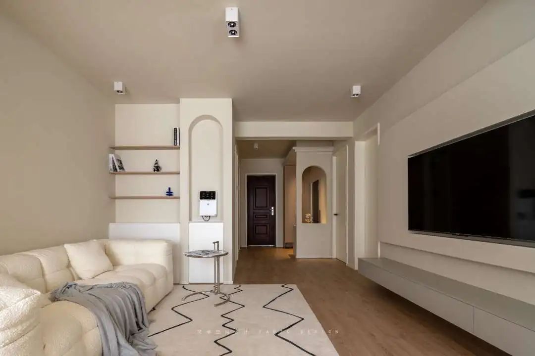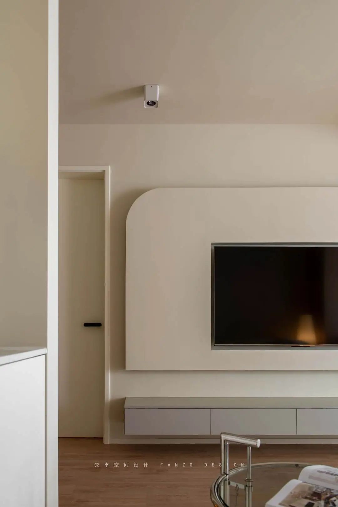 2、客厅简单设计了弧形的电视背景墙,视觉自然过渡到阳台垭口。