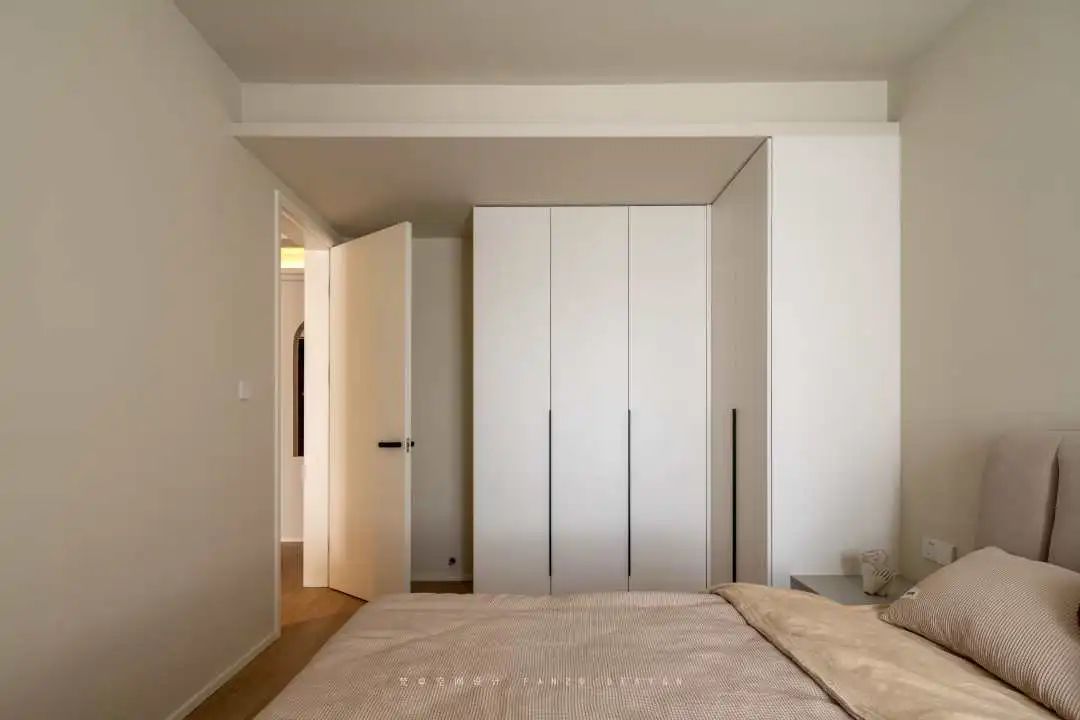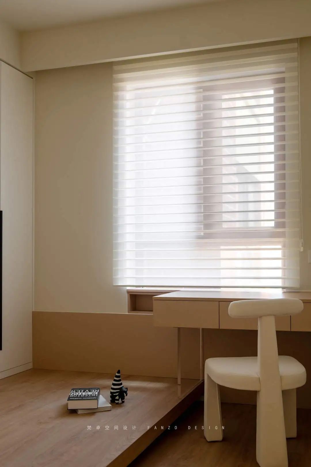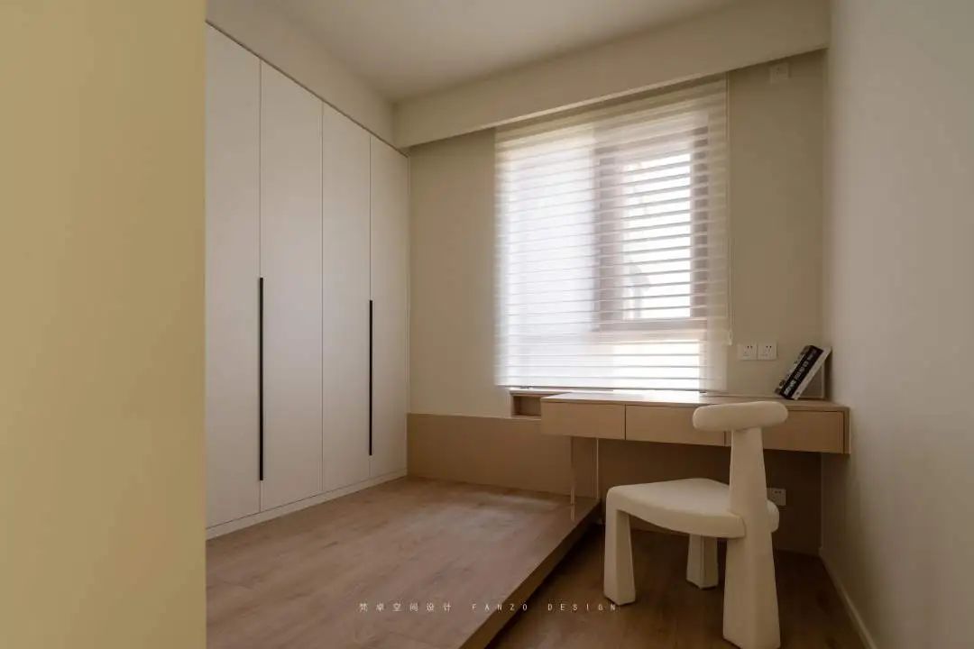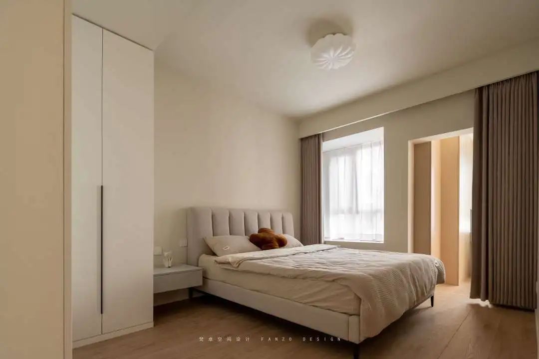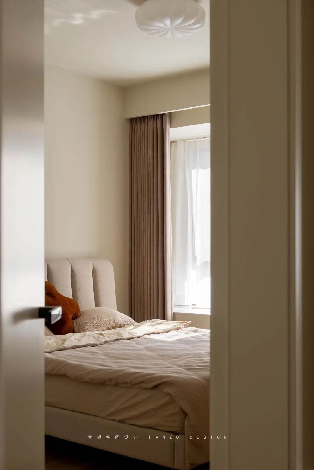 7、主卧有南向窗户,光线较好,为了打造一个安静的休息空间,我们没有设计复杂的造型,让休息区简单纯粹。