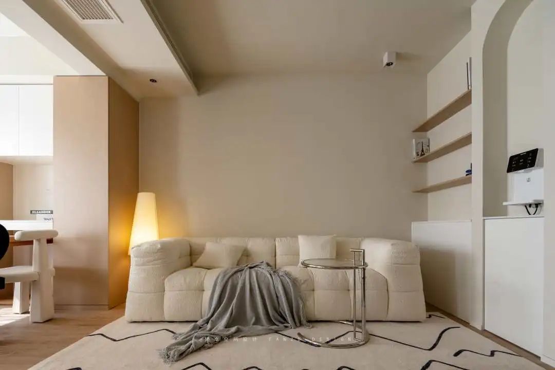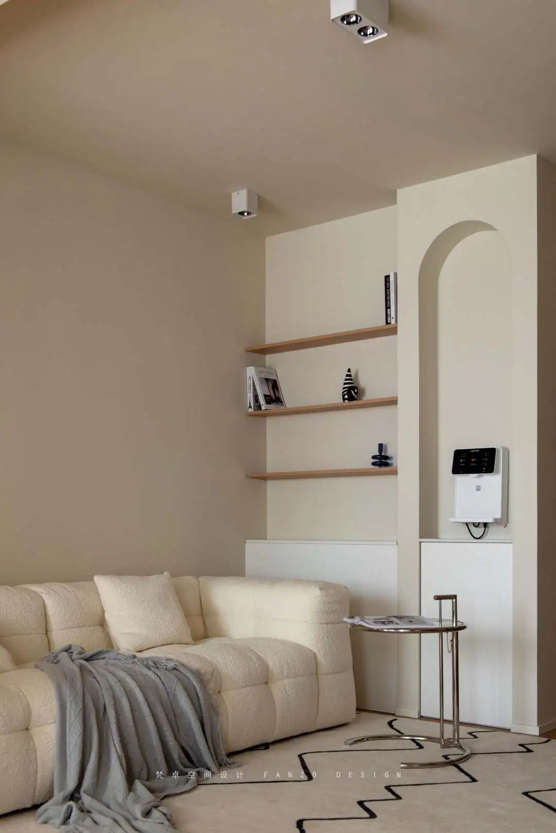 5、沙发侧面用做了弧形墙面造型,加上层板,摆放上业主喜欢的饰品和香薰,让家成为展示自己内心世界的那面镜子。