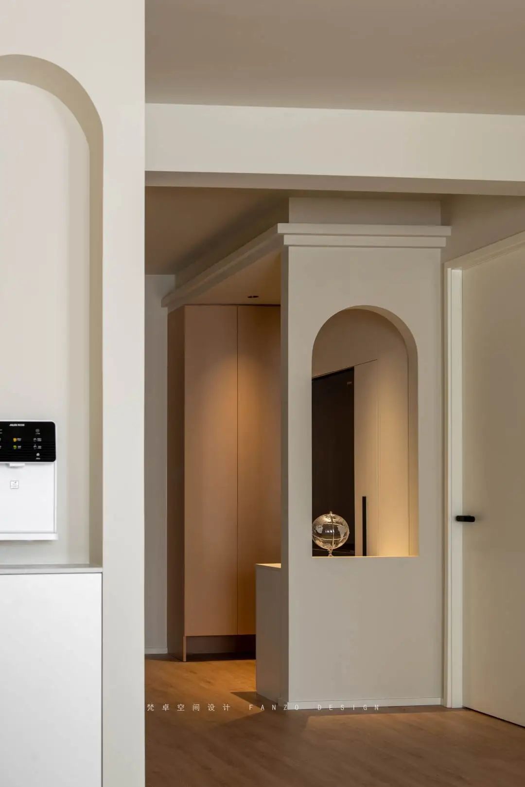 空间意境:1、进门后,迎面而来的是一个独立的空间,我们打造了一个“厅景”,这里不仅提供鞋子收纳,也是冰箱和行李箱的容身之所,为业主建立起一个过渡整理的缓冲区,卸下外界的嘈杂,即刻享受独属于自己的静谧安逸。