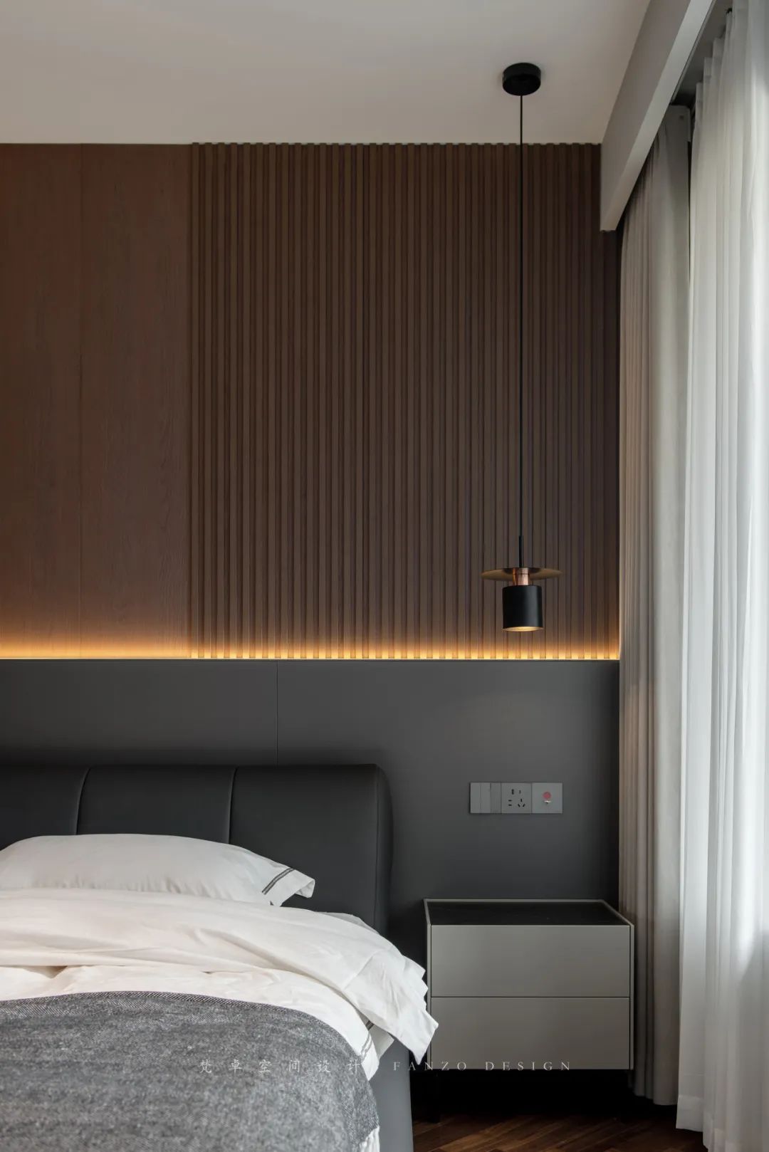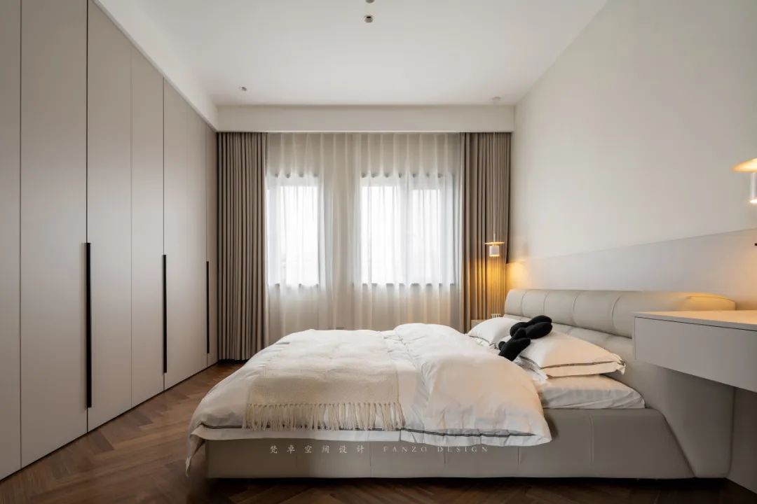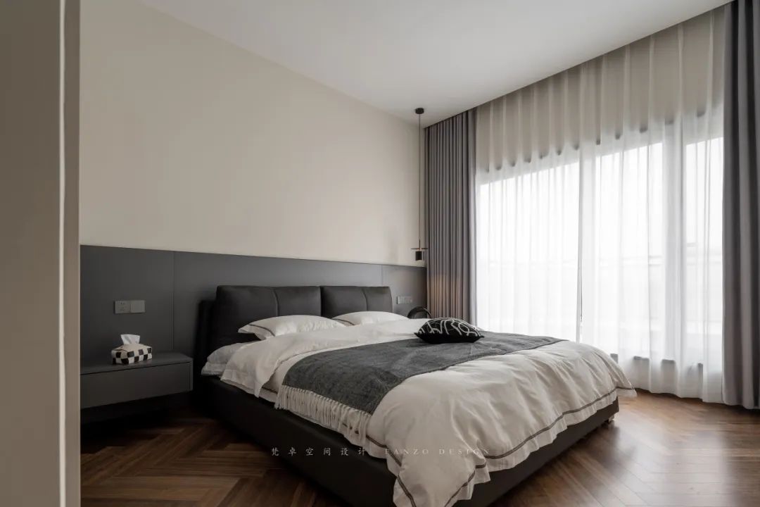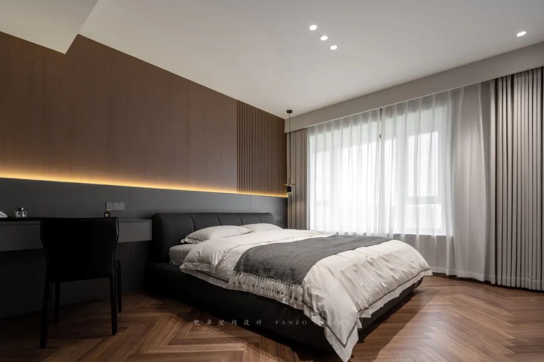 7、主卧床头背景墙选取胡桃木色+黑色护墙板,并嵌入灯带,氛围感和夜晚照明同时兼顾。卧室铺设鱼骨拼木地板,提升空间延伸感。