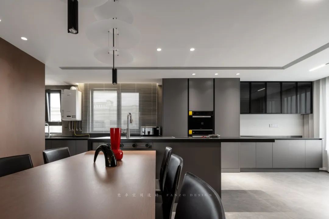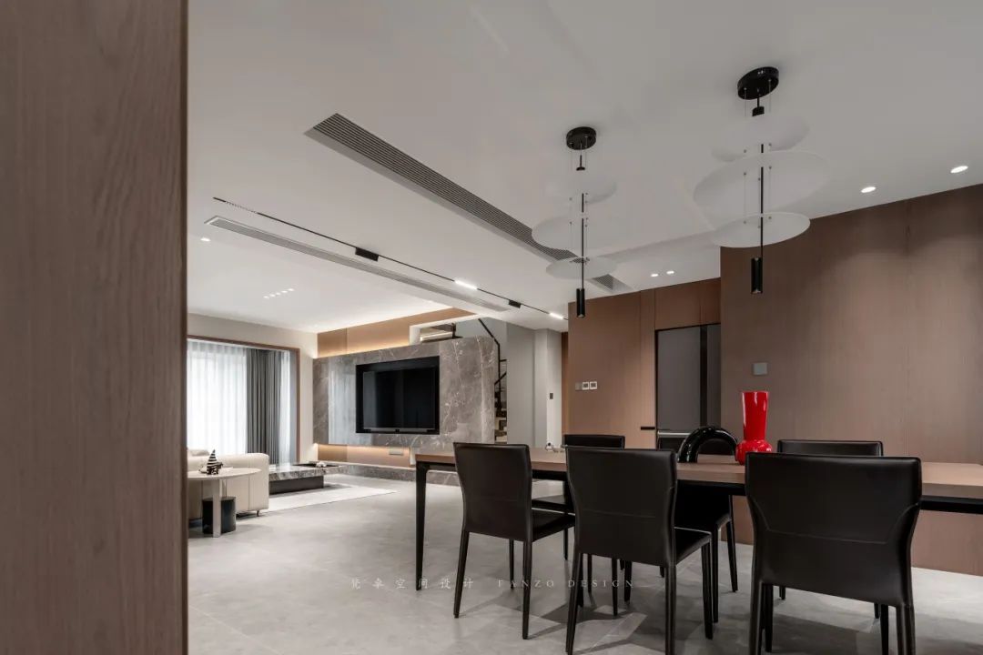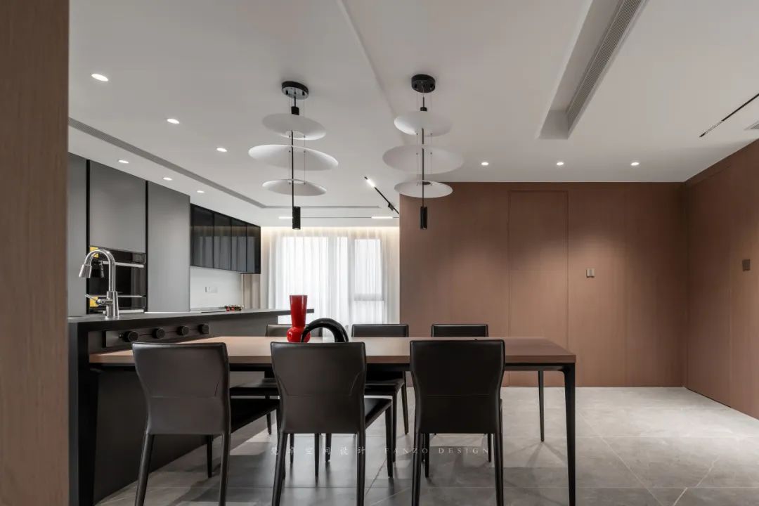 4、餐厅与客厅相连,大面积使用棕色木饰面装饰墙体。两部分空间既独立又互相联系。红色摆件的加入让原本沉稳的空间多了一丝趣味性。