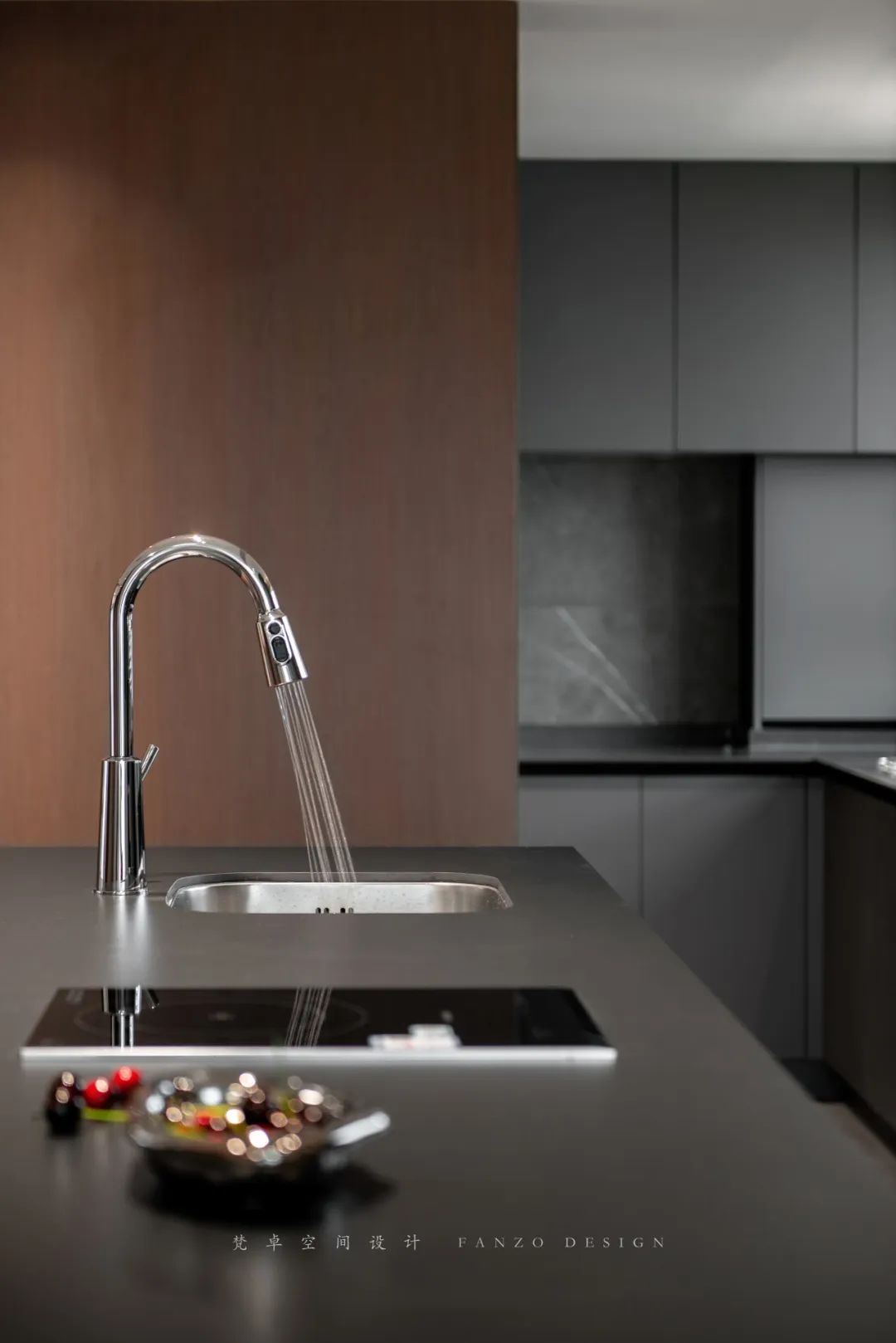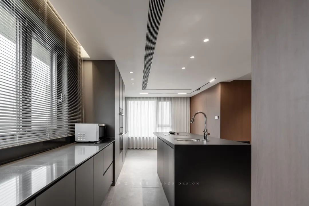 设计选材:在每个不同的功能空间,采用更适合的环保的材料和高性价比的产品。比如餐厨区采用整块岩板做岛台台面,接入净水系统,嵌入台盆,同时增加电磁灶,让岛台也能变成一个简单的料理台。