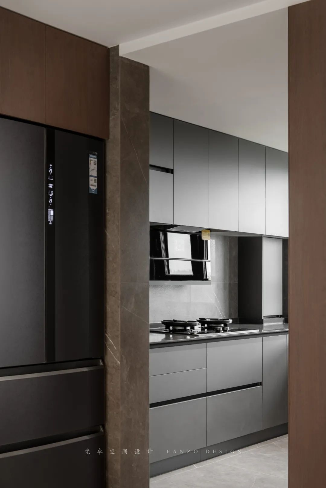 5、黑色极简柜体搭配灰色地砖,现代感十足,让厨房更干净利落。