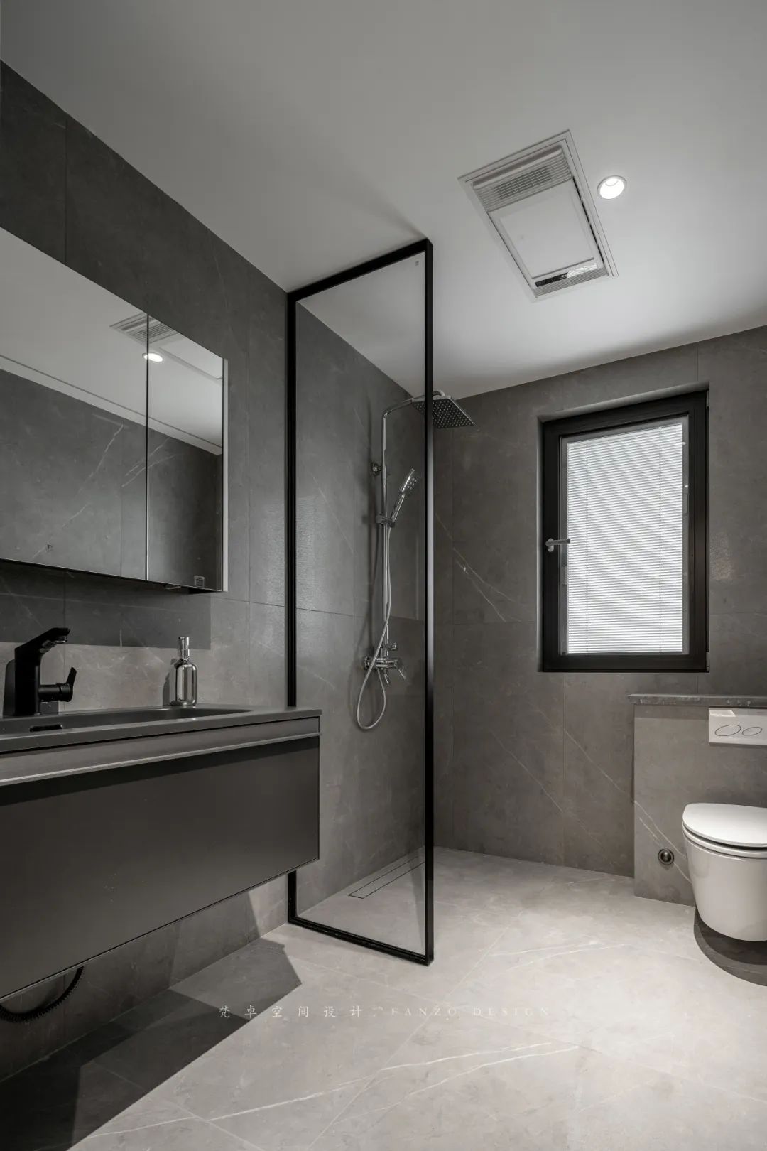 8、卫生间干湿分区使用玻璃做分隔,保证空间通透性。隐形地漏质感强,结构严密,颜值在线。