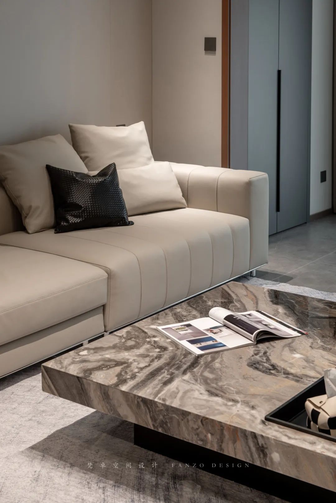 2、皮质沙发搭配大理石茶几,刚柔并济,彰显低调雅致的生活态度。