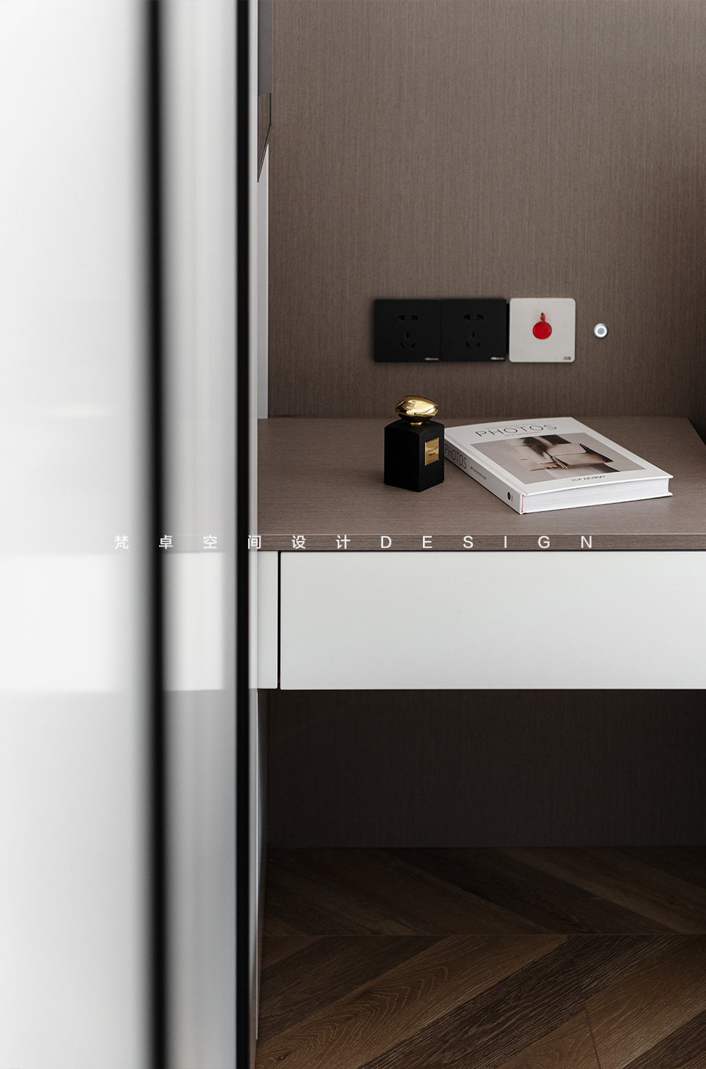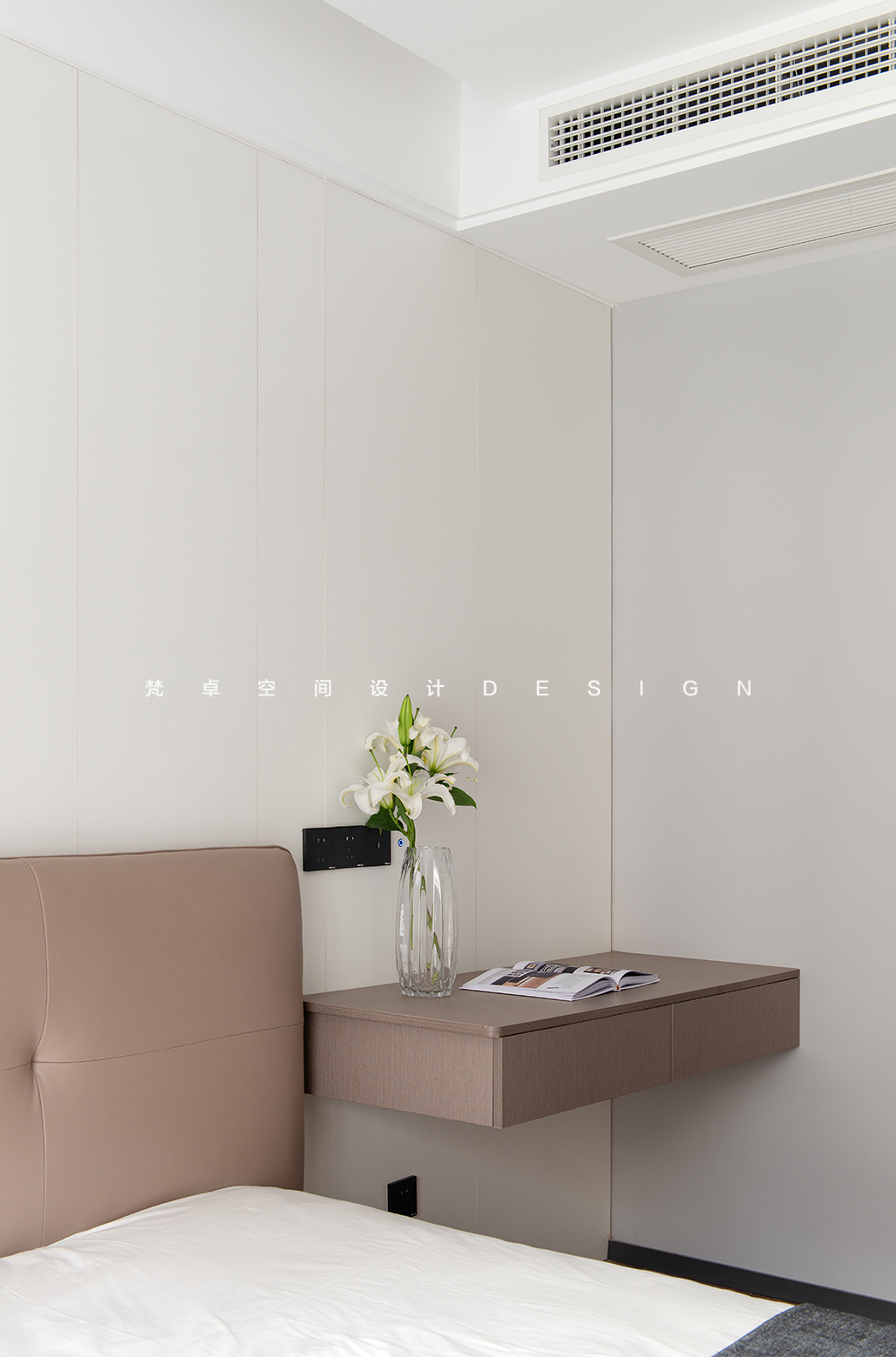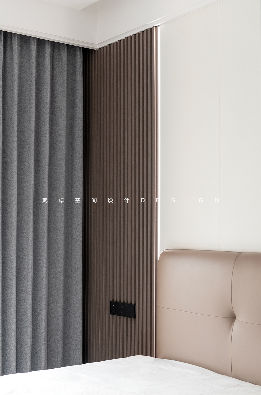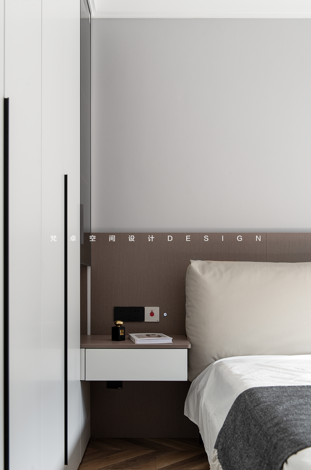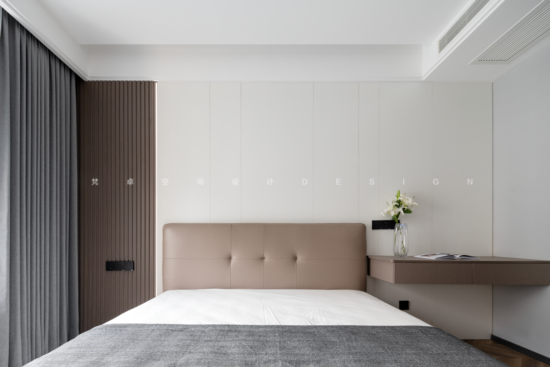设计选材:一丝色彩,一片材质,都能促使人产生微妙的情绪变化。主卧是业主给母亲的居住空间,设计上,以沉稳内敛为主基调,温润的色调与木材流露出柔和谦逊的态度,极简的方式营造对品质的追求。让老人居住在这里时,能够平和安心。