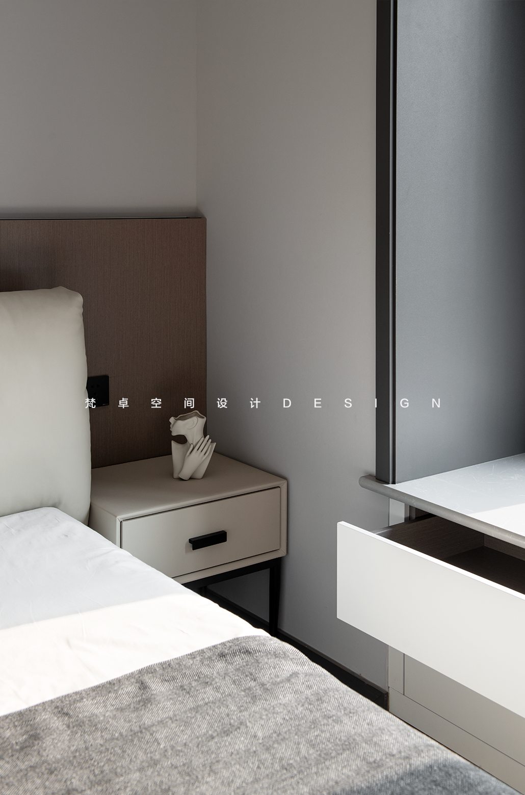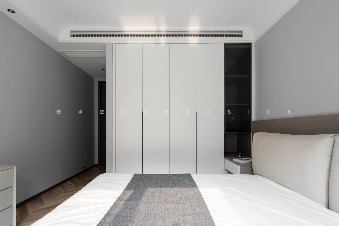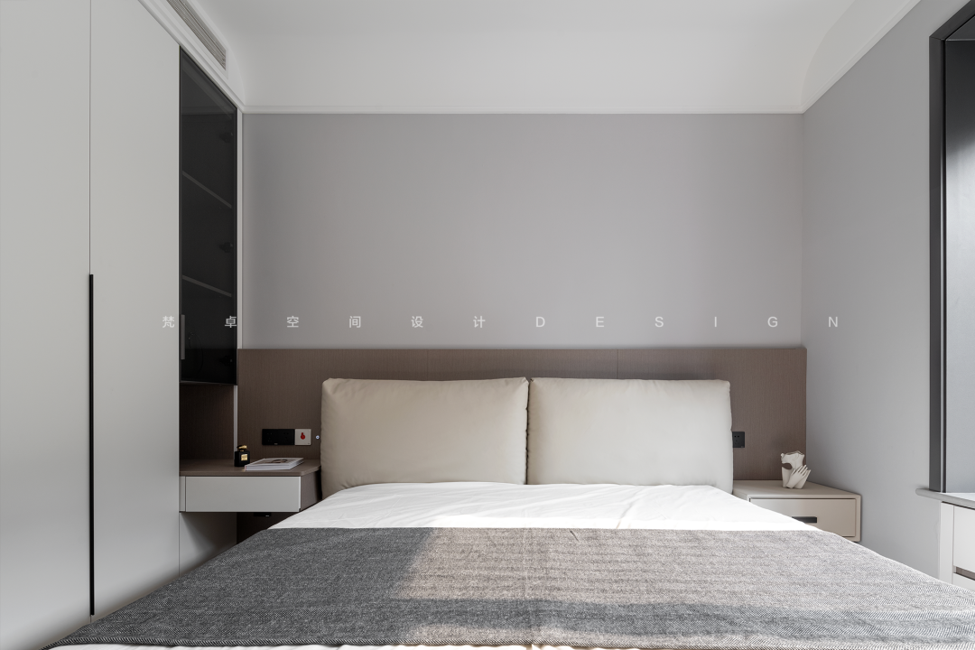 5、比起主卧及客厅的灰白黑色调,次卧的空间,会更加柔和一点。巧思延伸出来的床头柜及可储物的飘窗台,均是将规整而松弛的平面,形成带着闲适感的空间序列。