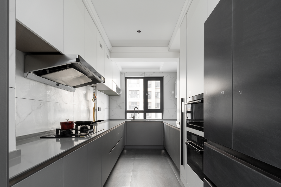 3、厨房U型设计让“冰箱→洗→切→做菜→放菜”的操作动线更加流畅便利~拆除原本阳台垭口,扩容厨房面积。