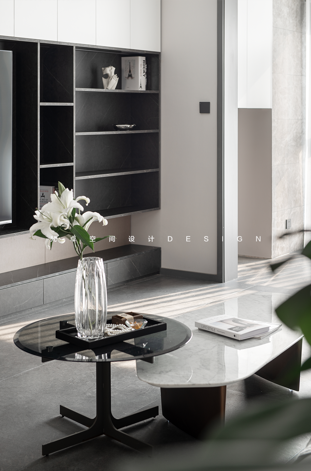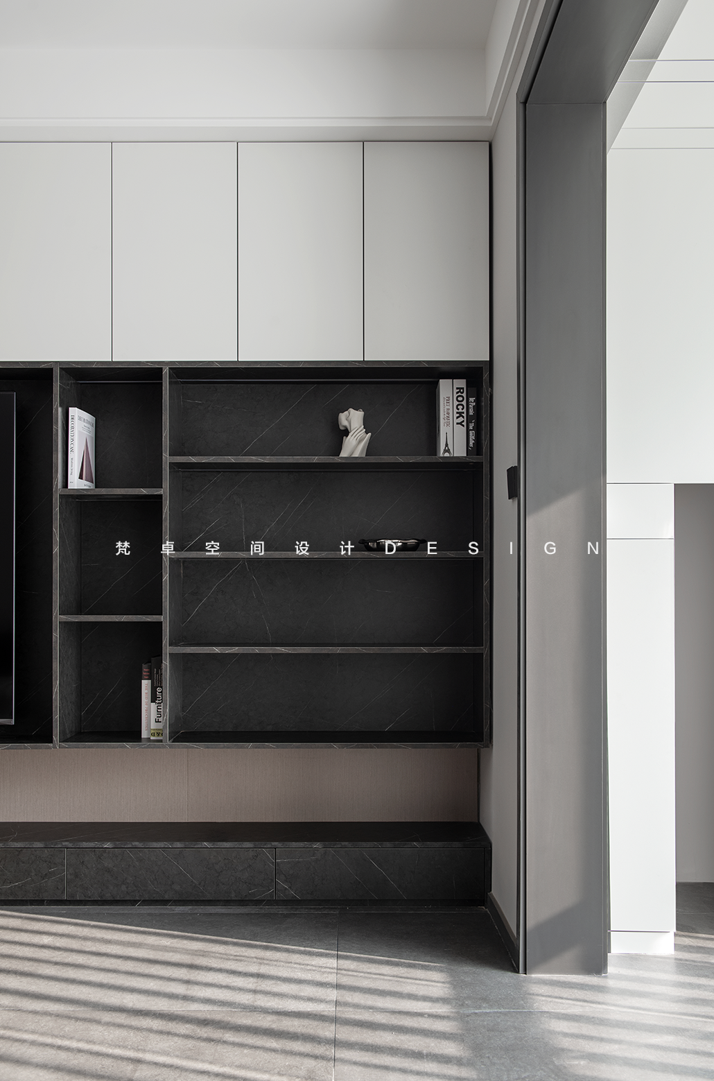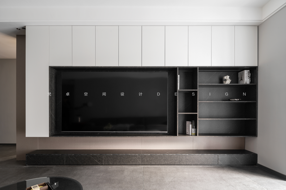 空间意境:诗意、和谐、自然,设计师将诗文想象投射至空间,打开精神上的视野,空间黑白交错的对比营造出朦胧月光般神秘的感觉。没有选择华丽的装饰和造型,横竖相间的开放格,弱化满墙柜体带来的沉闷感。