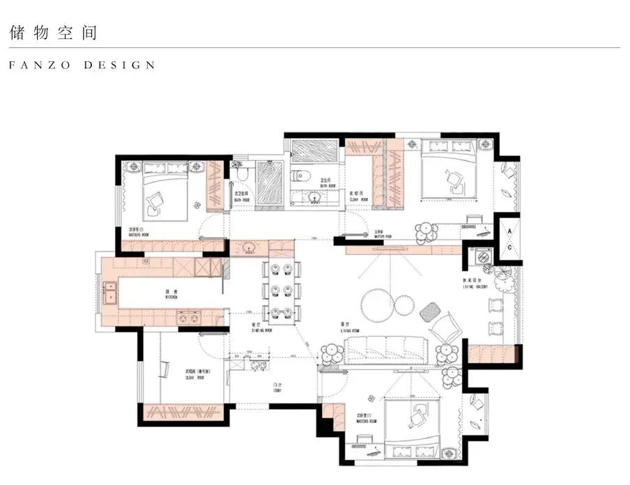 4考虑到空间的实用性和利用率,主卧新建墙体做L型形成背靠背设计,卧室方向放置常用衣物,卫生间方向可存放过季衣物等物品~